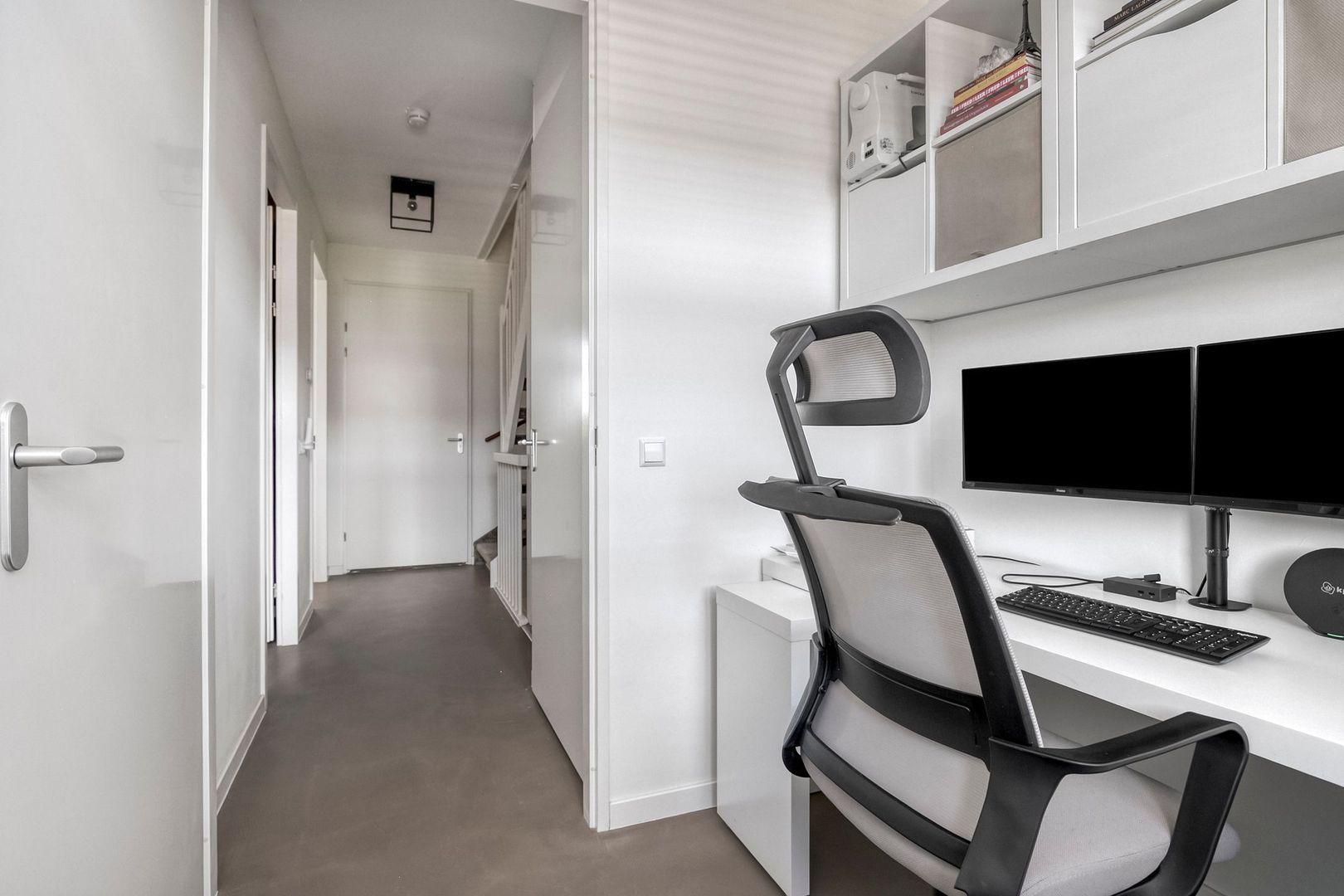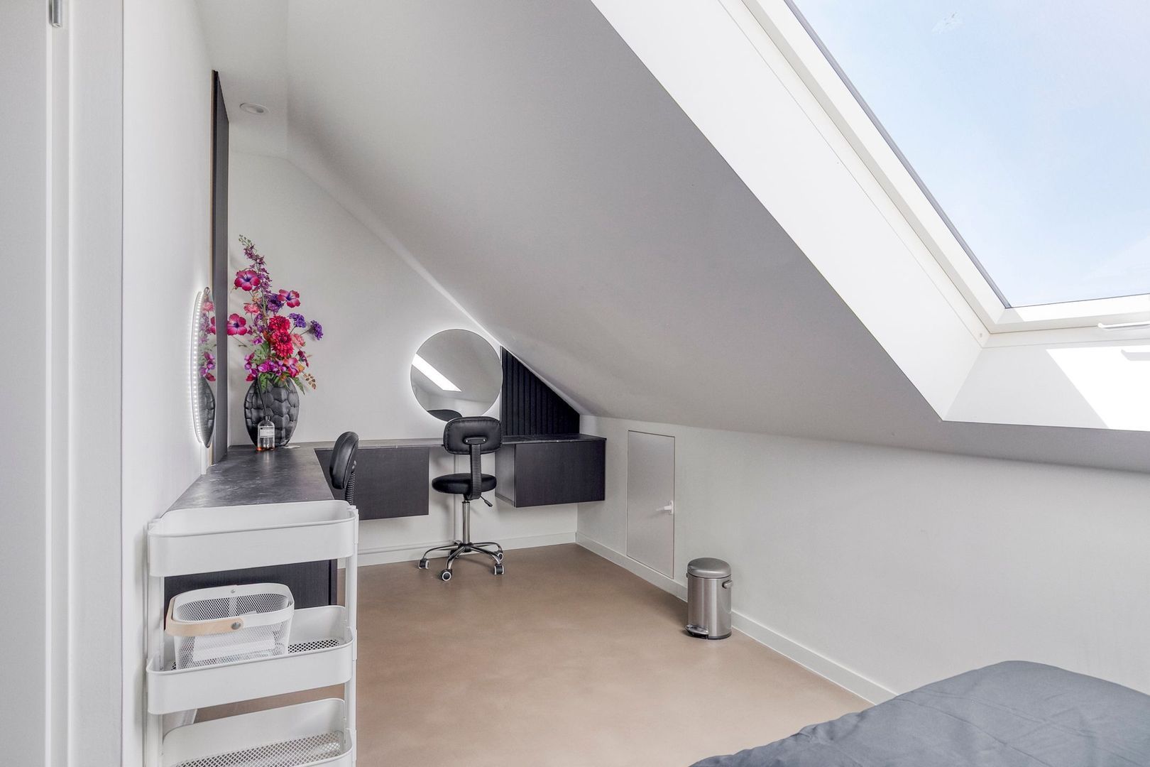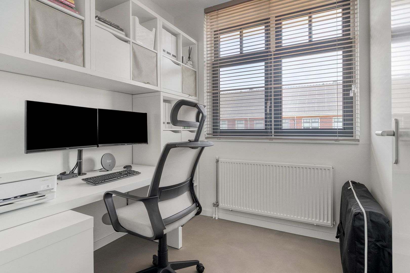 De ruime overloop biedt toegang tot de 4e slaapkamer en een berging. In de berging bevinden zich de aansluitingen voor de wasmachine en droger, evenals de opstelplaats voor de cv-ketel (2019) en de ventilatie box. De lichte slaapkamer is ideaal voor verschillende doeleinden, zoals een werkplek, hobbyruimte of logeerkamer.