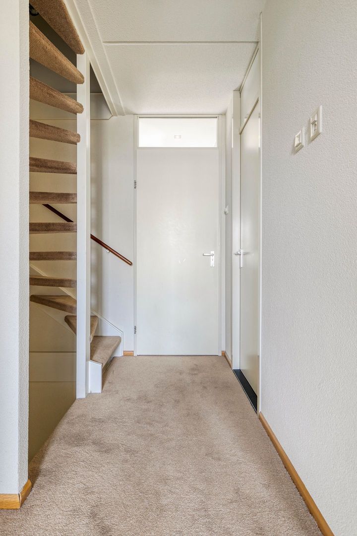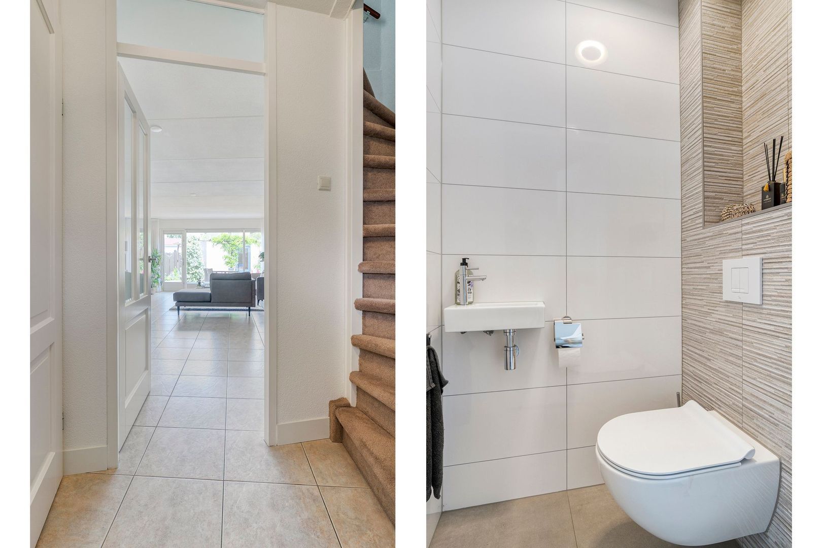 Voortuin, entree, meterkast, toilet, trap naar de eerste verdieping en toegang naar de woonkamer.
