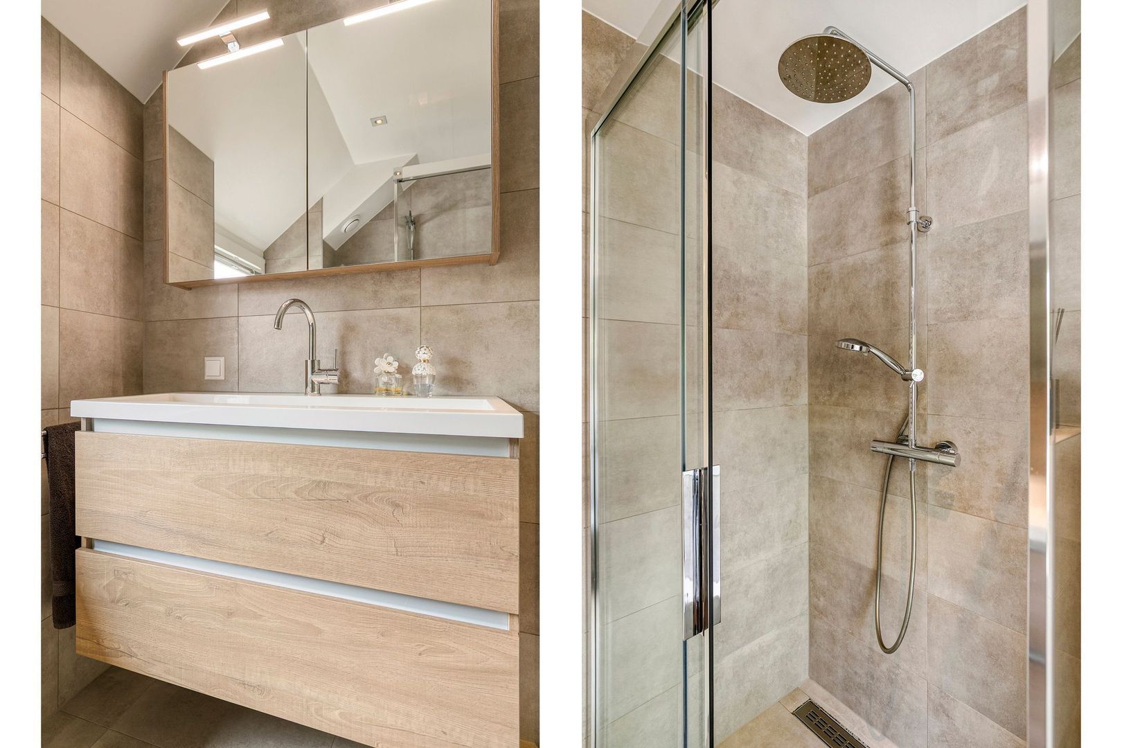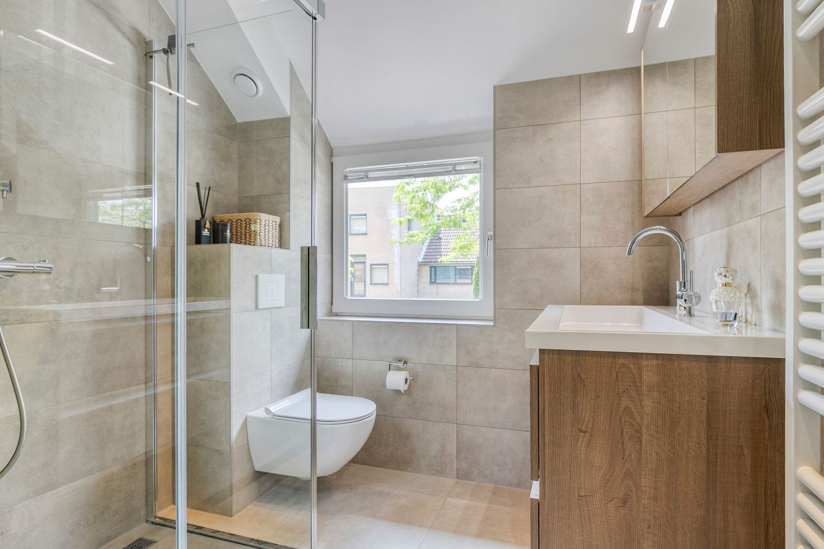 De moderne badkamer is uitgerust met een wastafelmeubel, douche, toilet en een handdoekradiator.