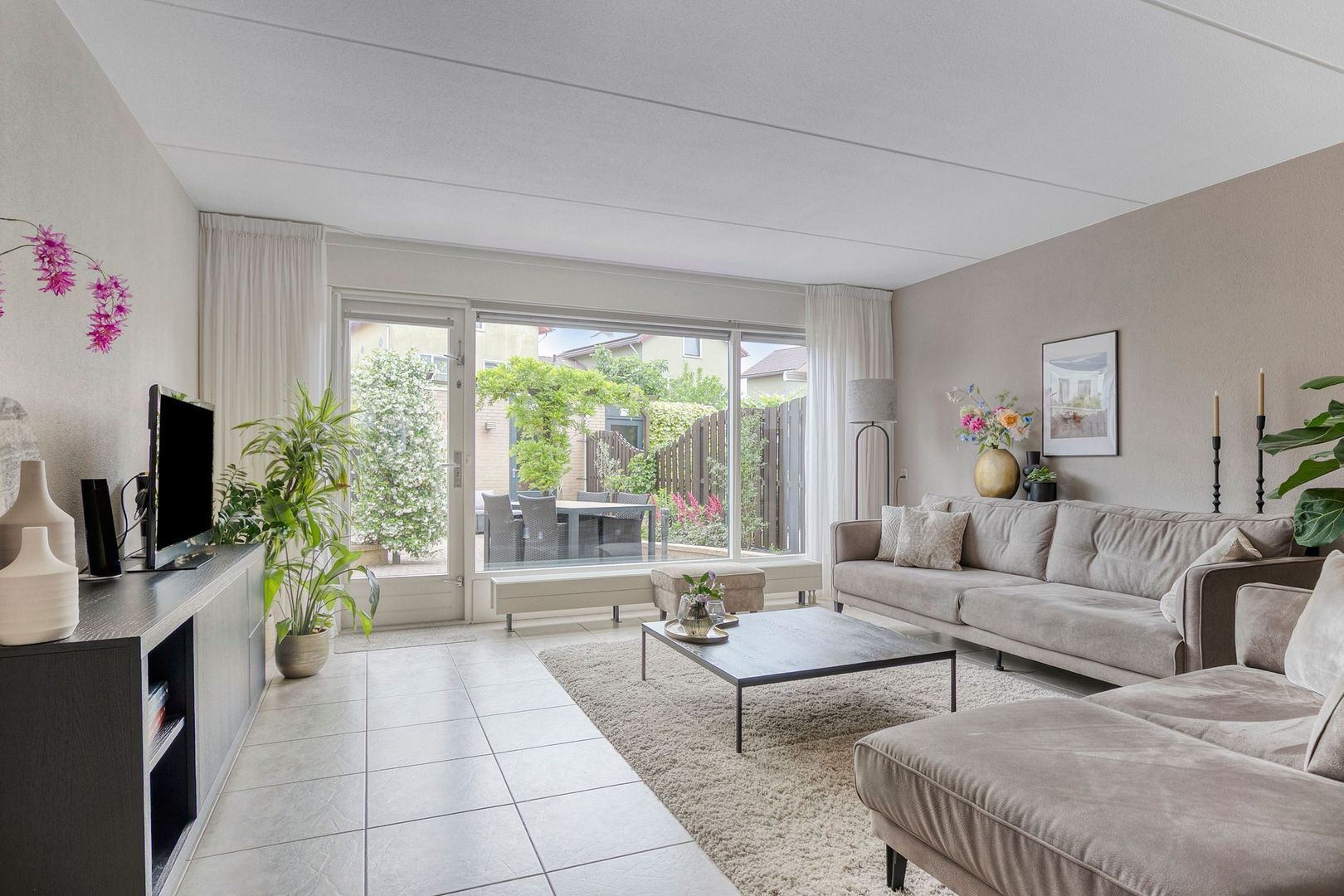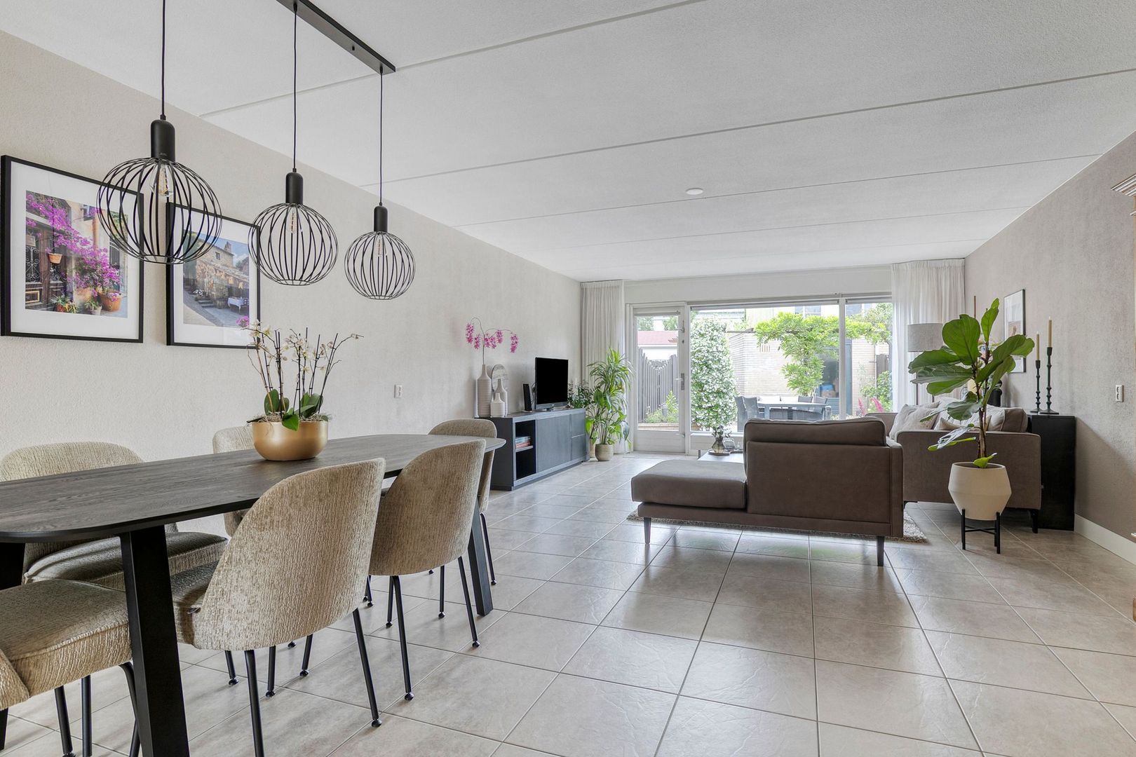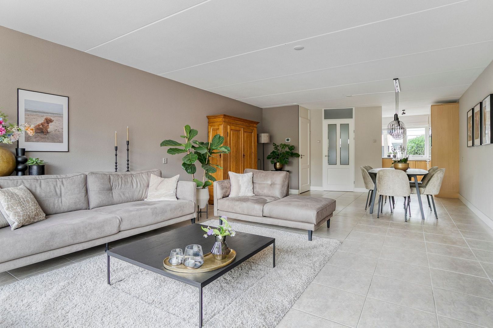 De ruime woonkamer aan de achterzijde van de woning heeft door het grote raam veel lichtinval. Via de achterdeur kom je in de achtertuin.