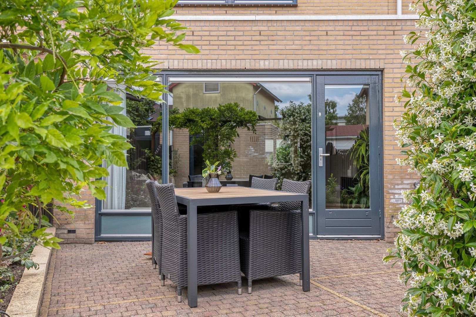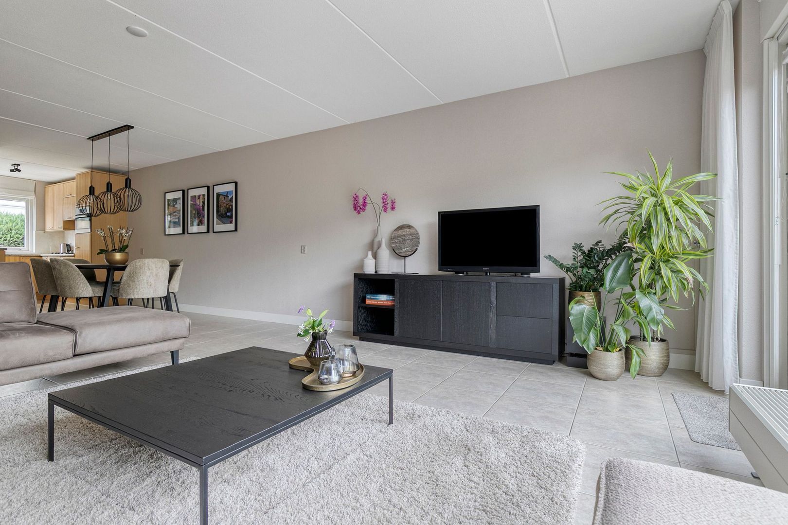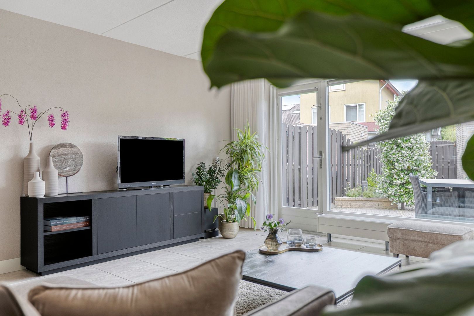 De ruime woonkamer aan de achterzijde van de woning heeft door het grote raam veel lichtinval. Via de achterdeur kom je in de achtertuin.
