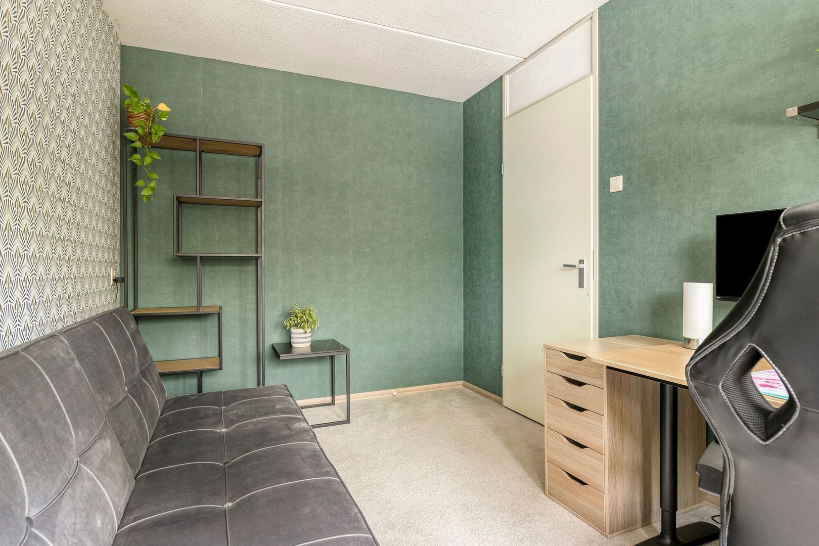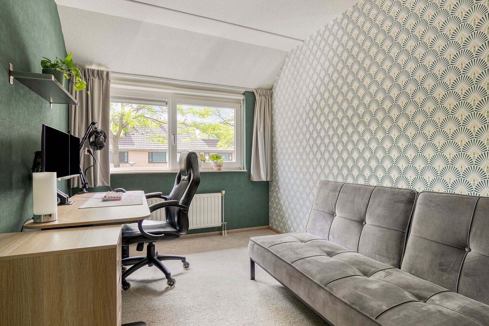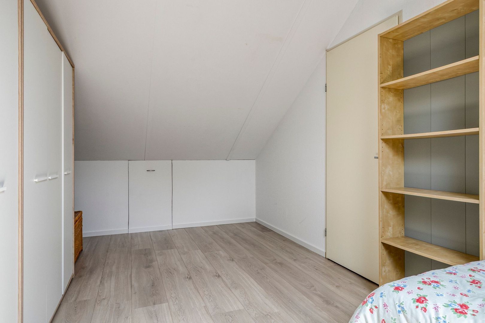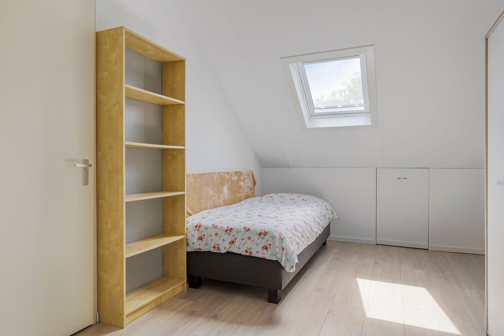 Slaapkamer 4 van circa 20 m2 (inclusief de overloop), is voorzien van praktische knieschotten voor extra bergruimte en een nette laminaatvloer. Let op: deze zolderverdieping is vanwege de daklijn niet meegerekend in de woonoppervlakte (ca. 98 m²), maar biedt wél volop extra gebruiksruimte.