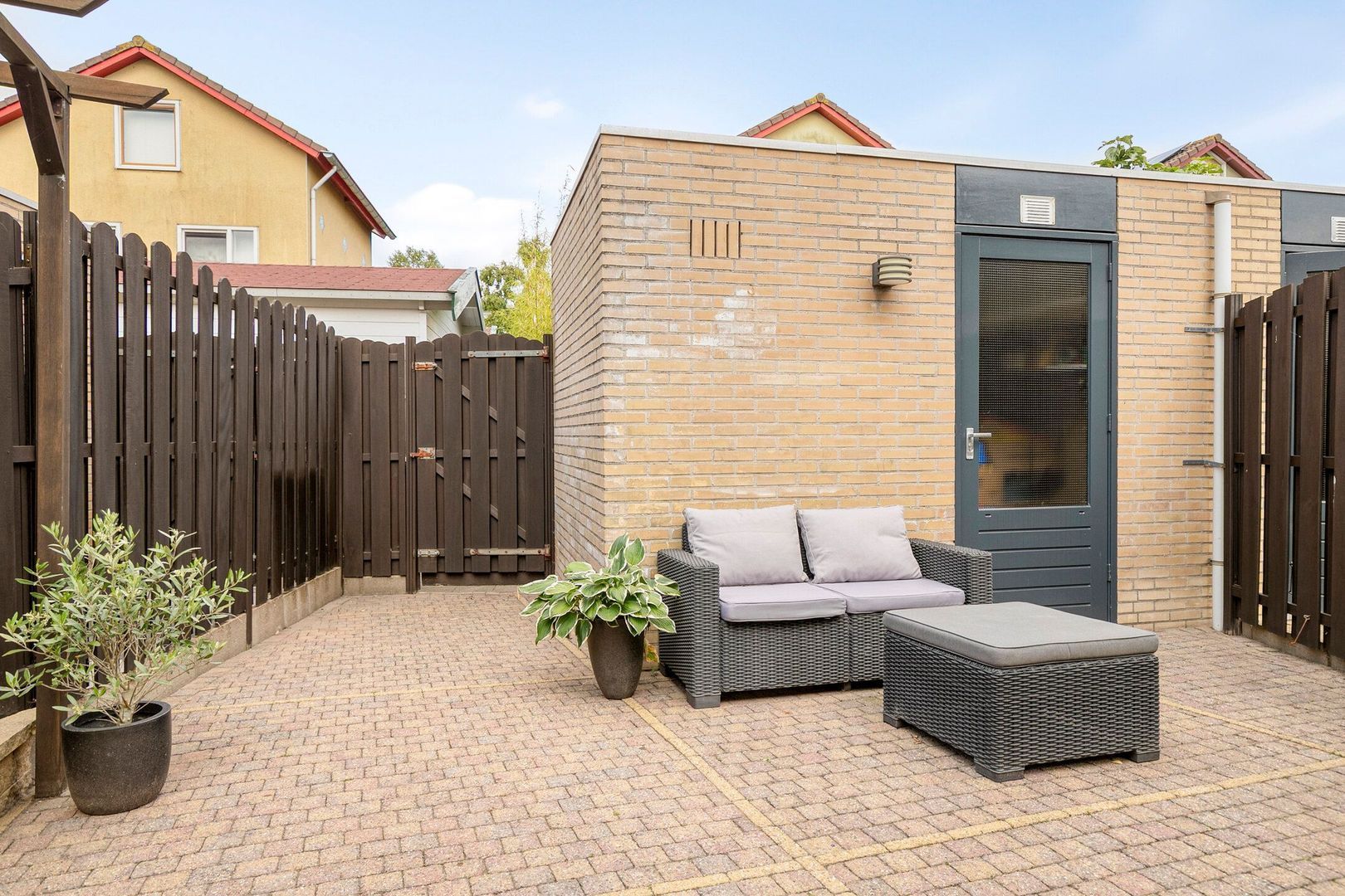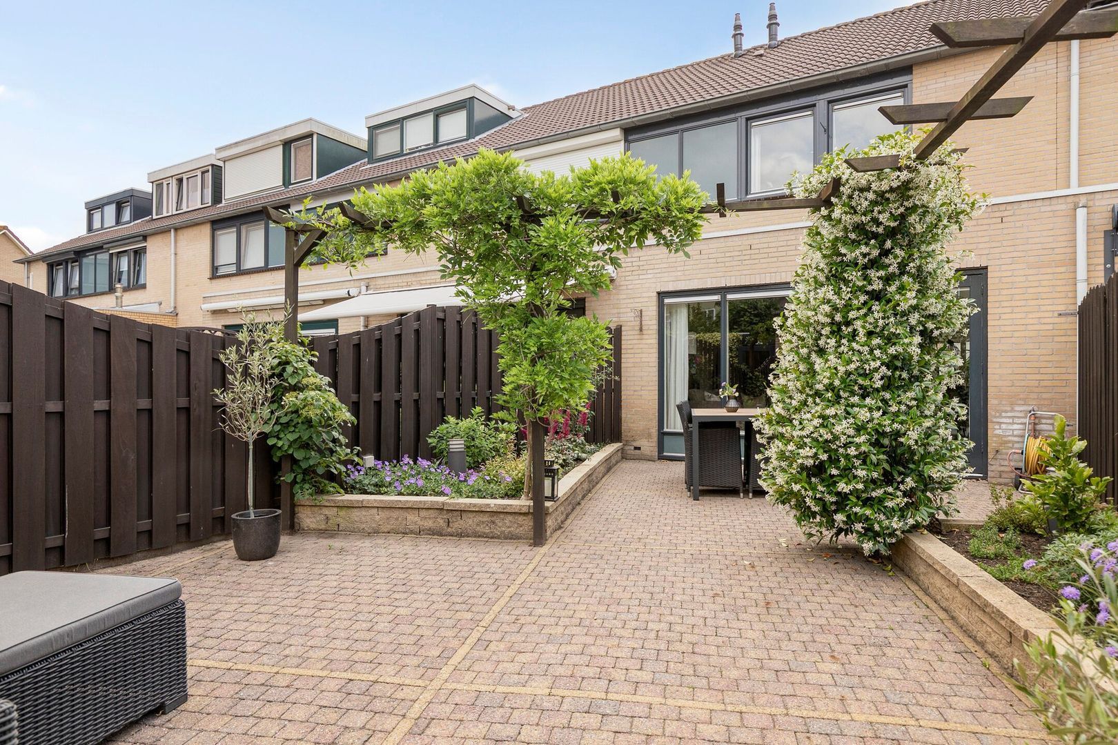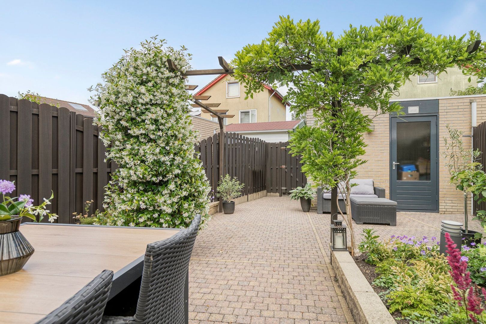 De goed onderhouden achtertuin is gelegen op het noorden, heeft een achterom en beschikt over een praktische stenen berging.