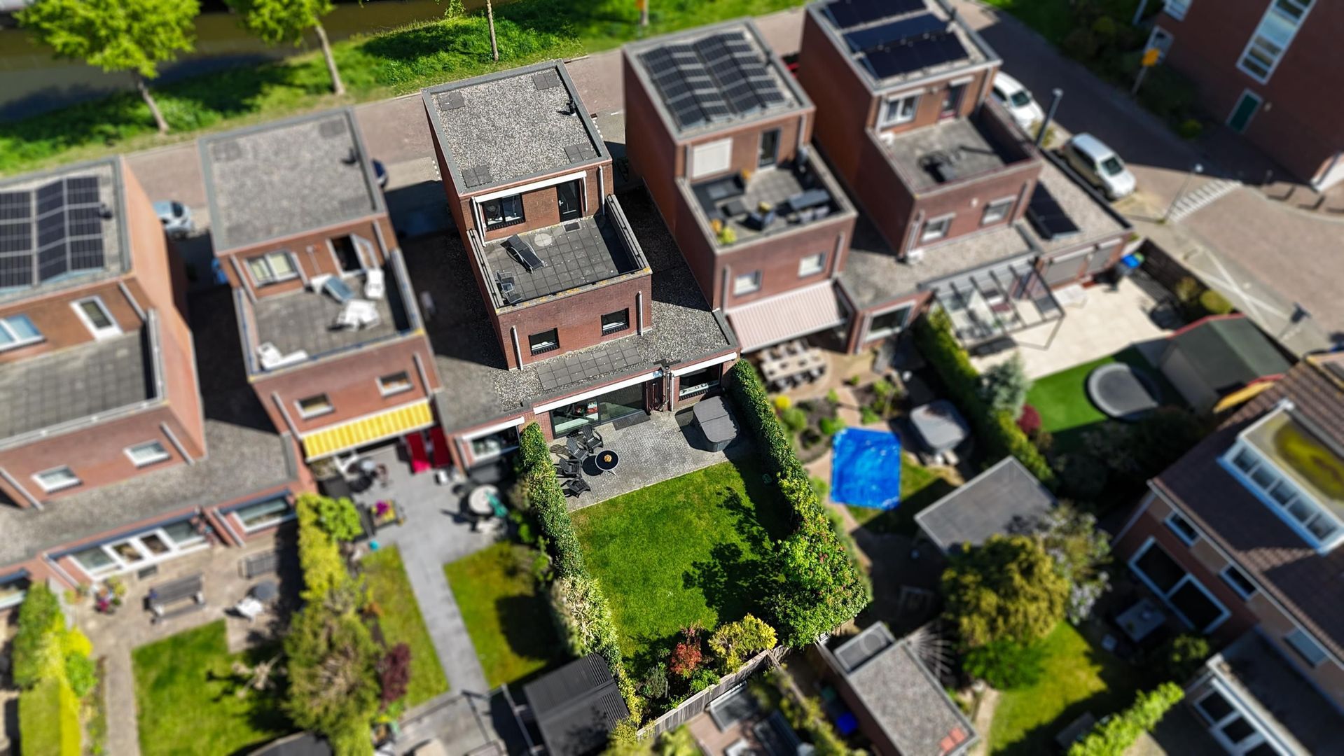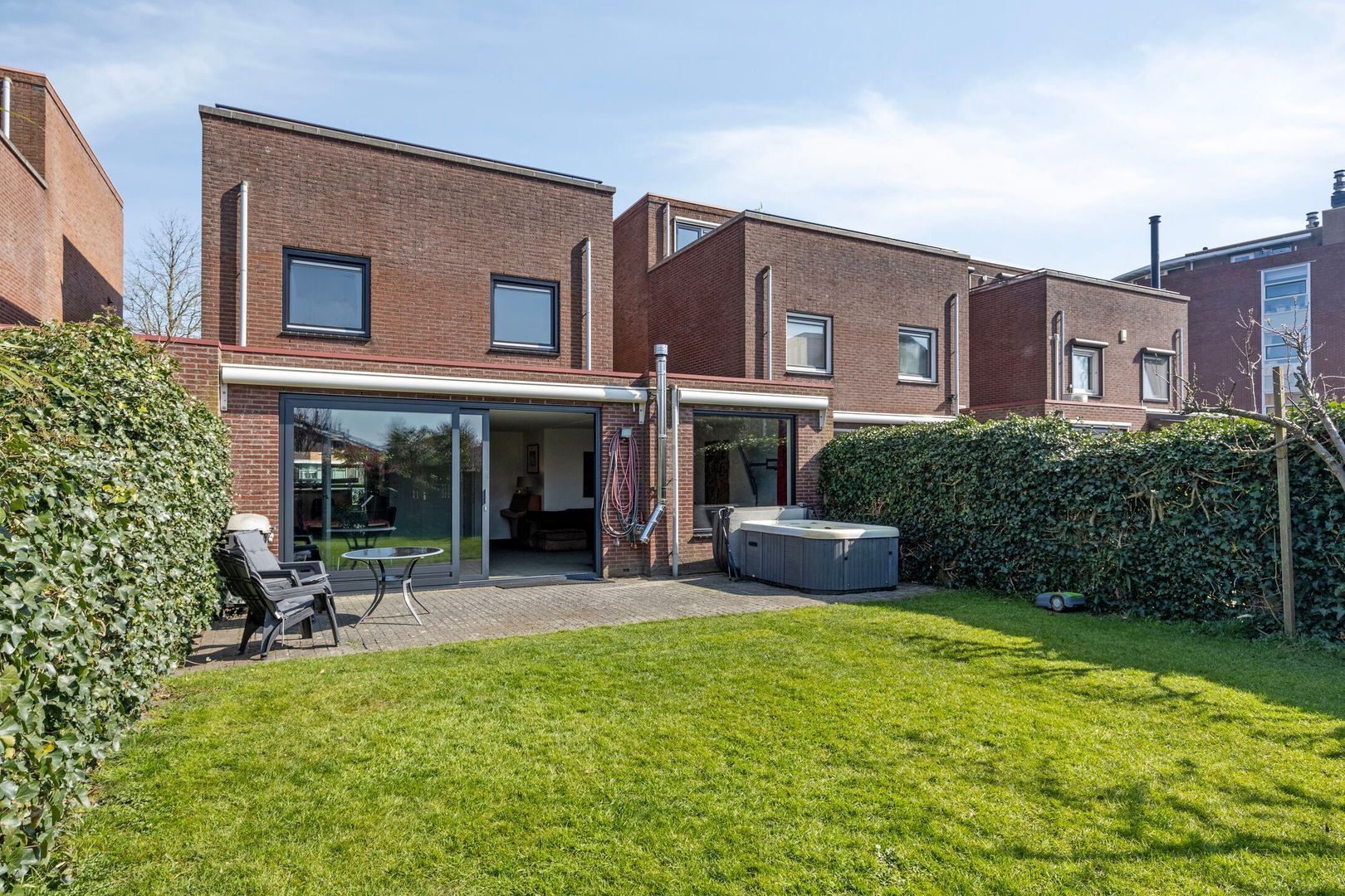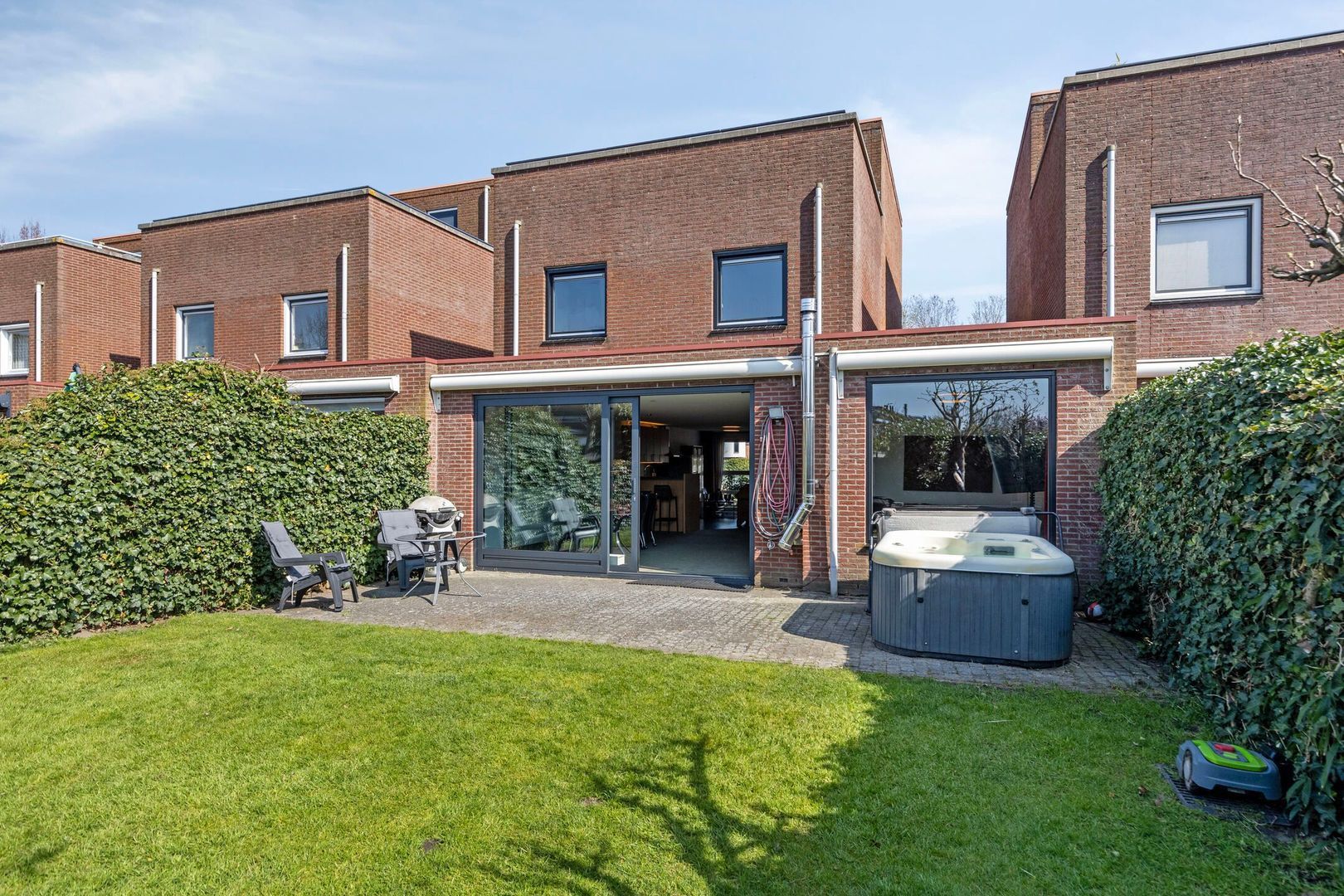 De fraai aangelegde achtertuin is een fijne plek waar je door de ligging op het zuiden heerlijk van het middag- en het avondzonnetje kunt genieten. De achtertuin is voorzien van een elektrisch zonnescherm.