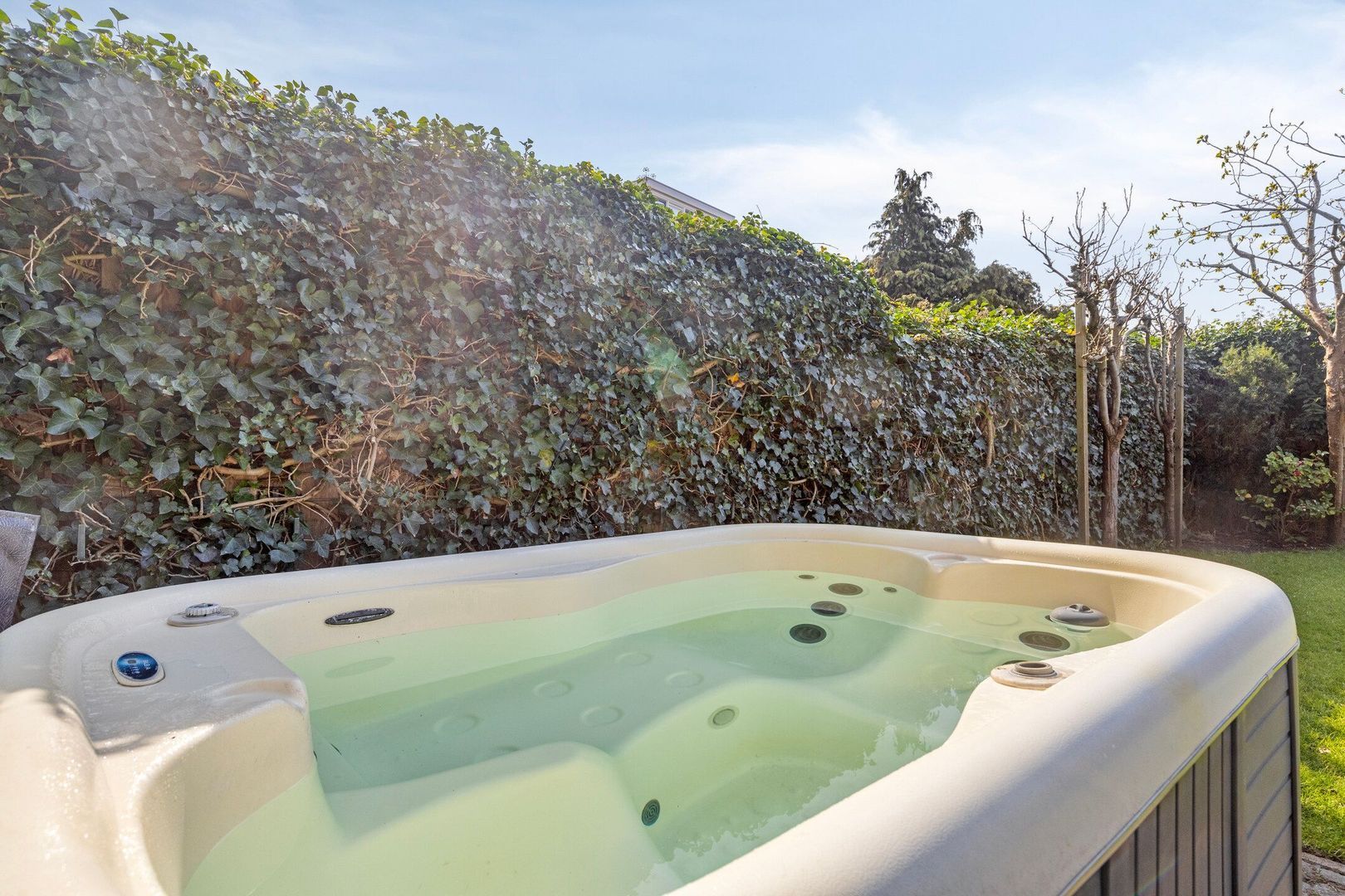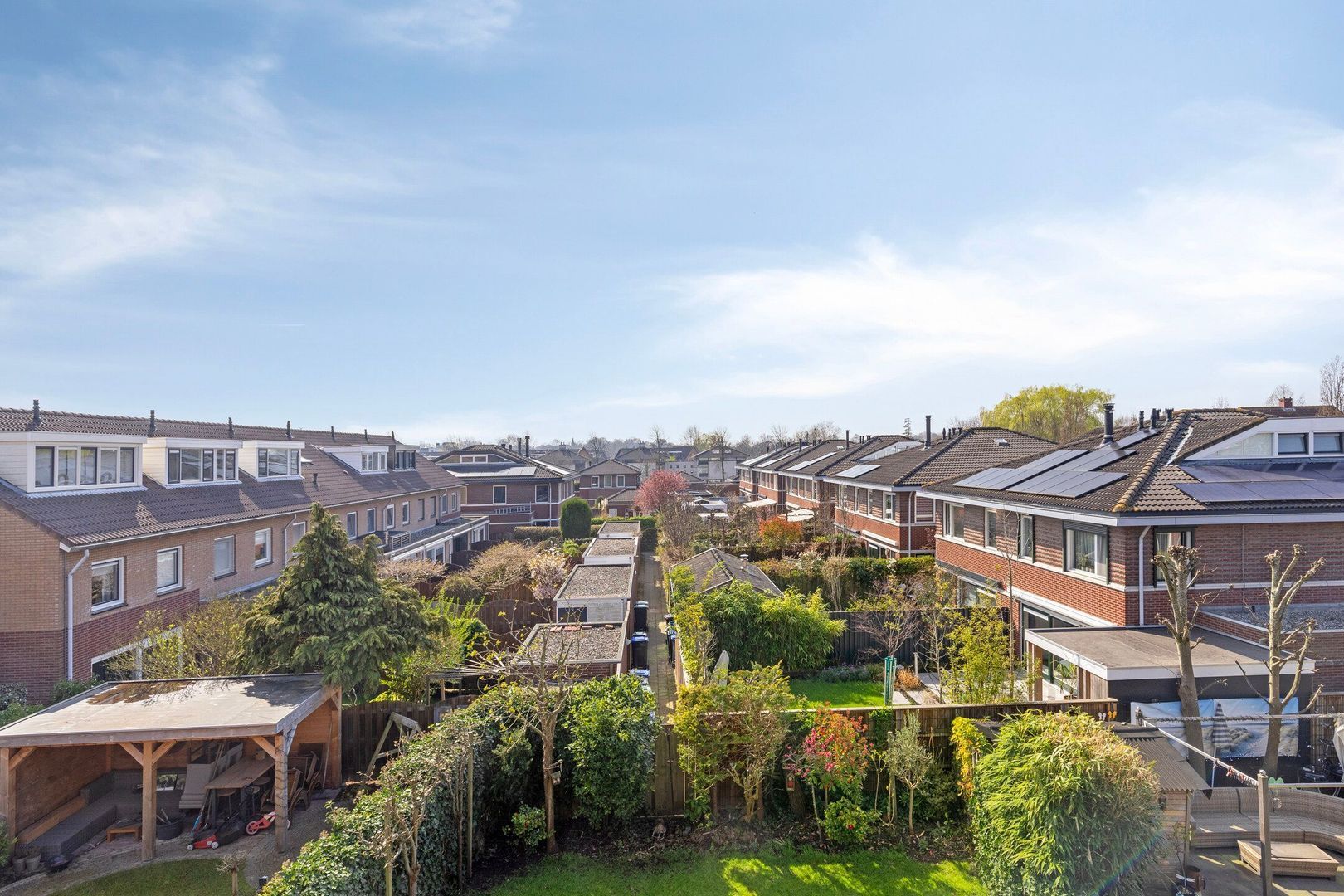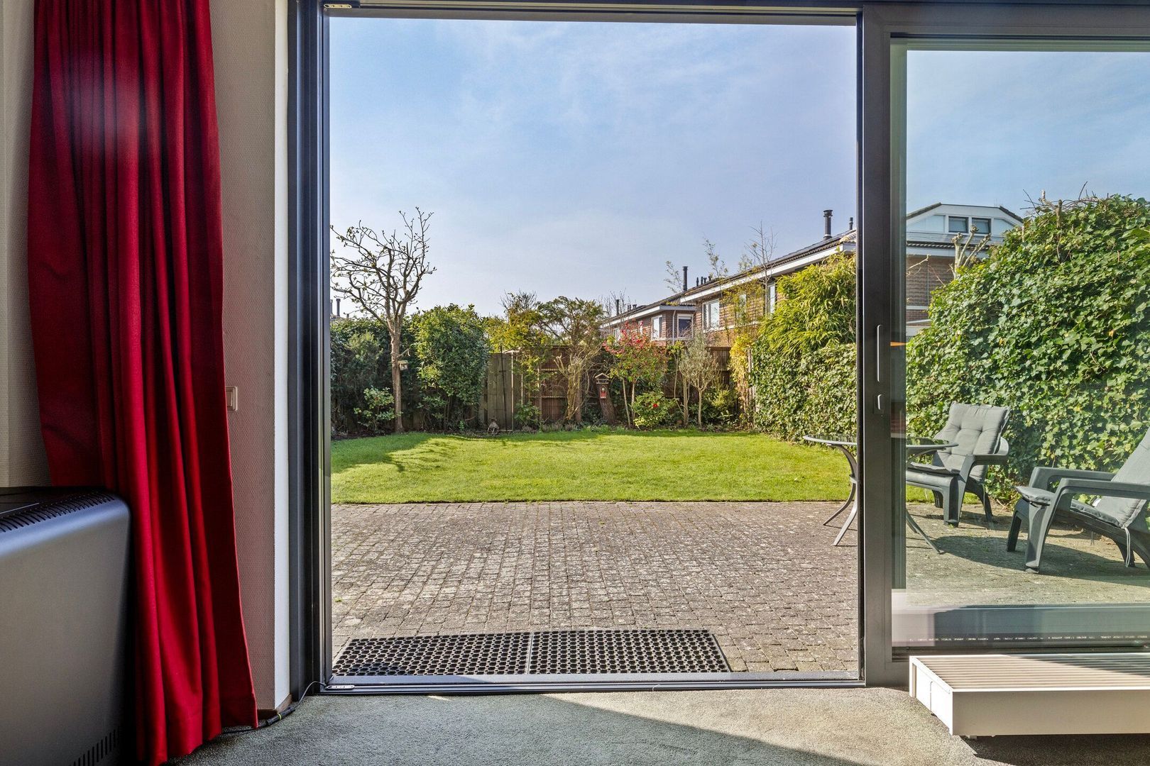 De fraai aangelegde achtertuin is een fijne plek waar je door de ligging op het zuiden heerlijk van het middag- en het avondzonnetje kunt genieten. De achtertuin is voorzien van een elektrisch zonnescherm.