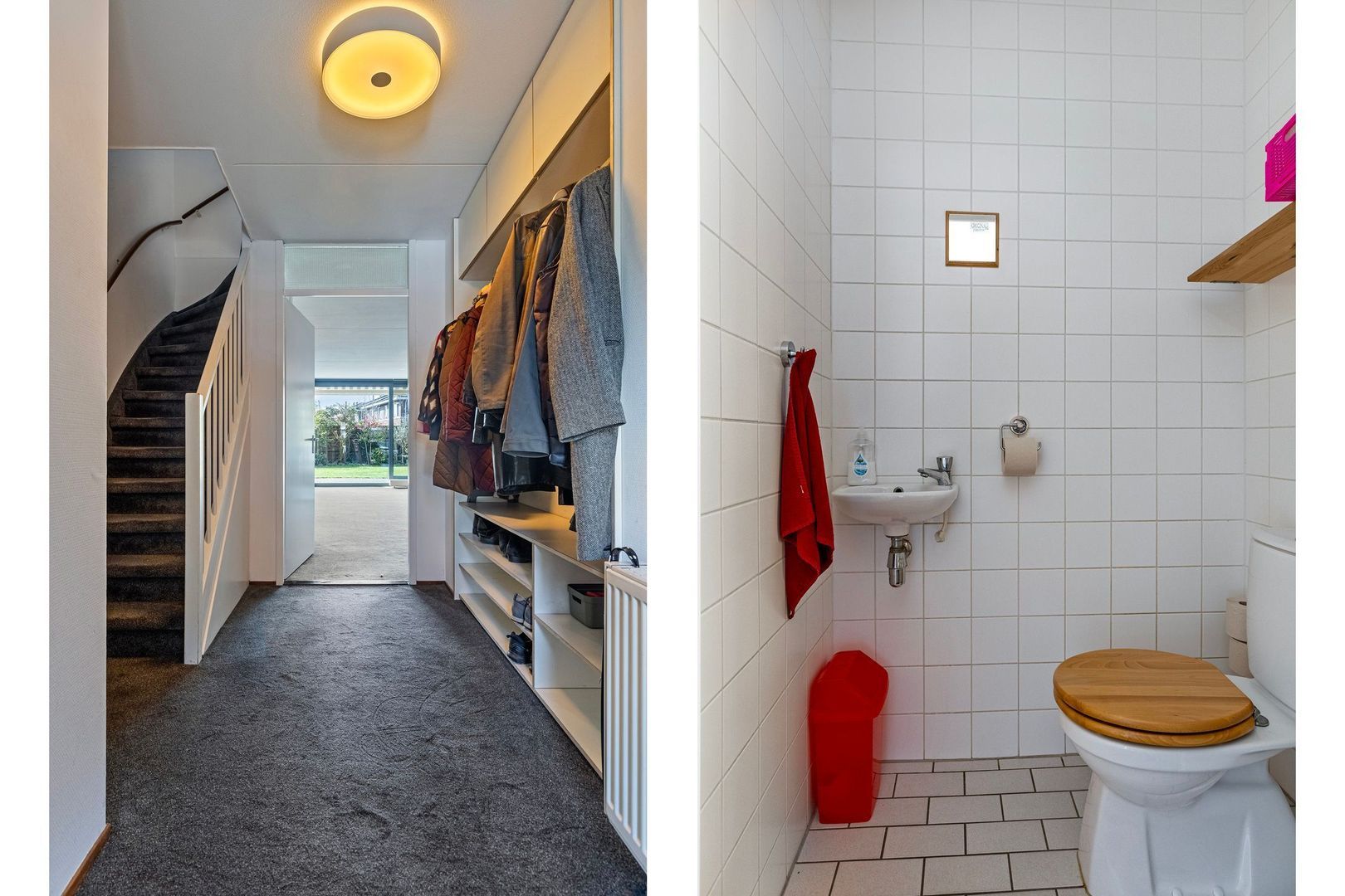 Entree/hal met trapopgang naar de eerste verdieping, meterkast, toilet, toegang tot de garage en de woonkamer.