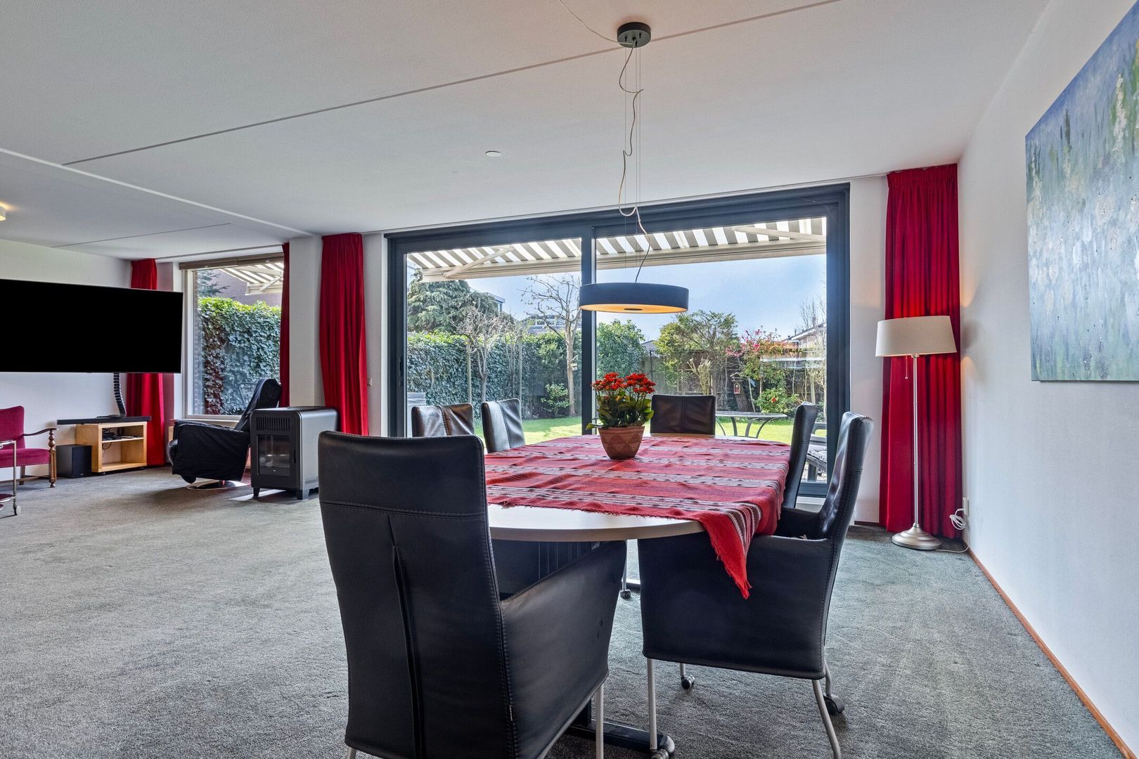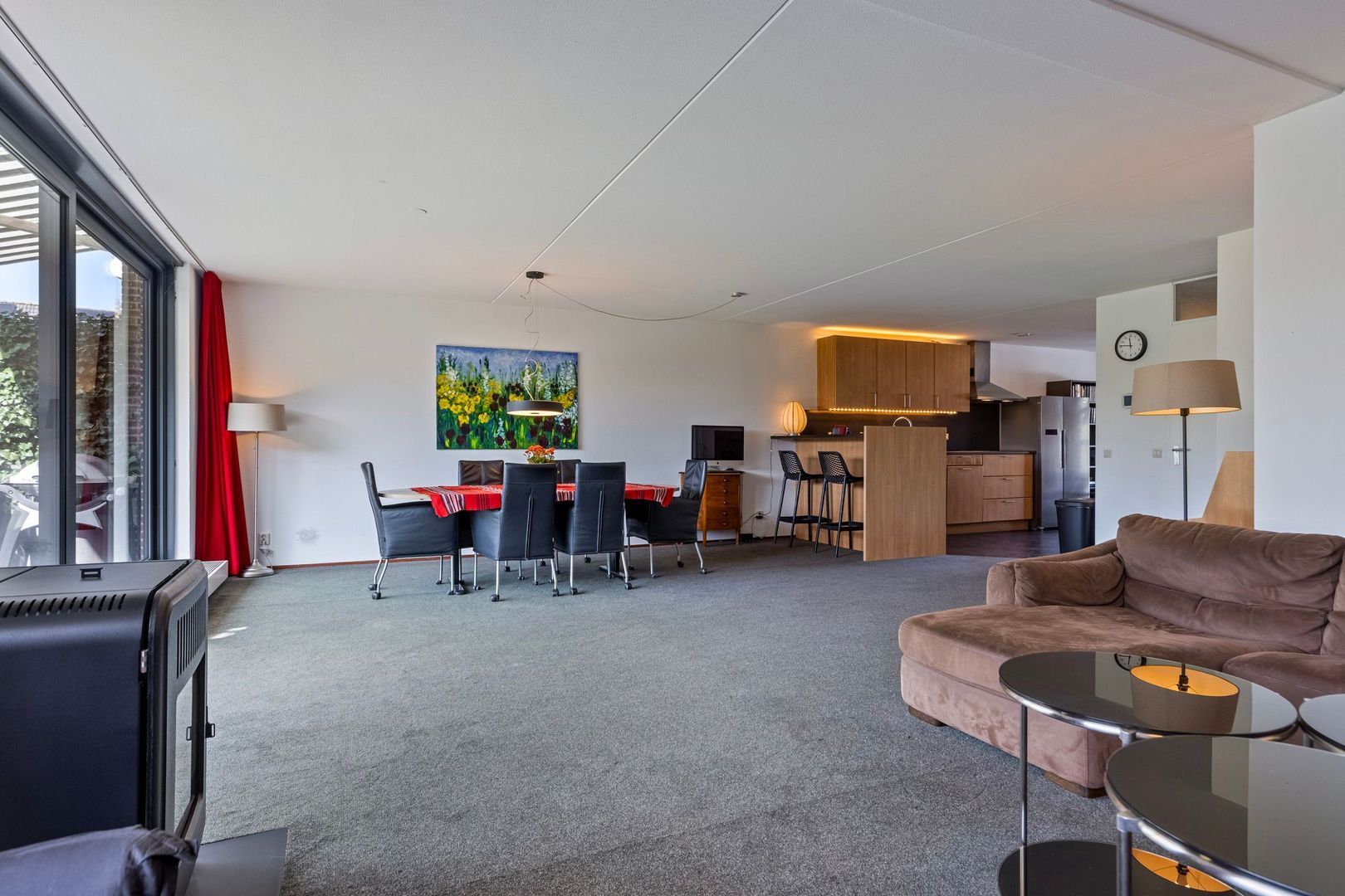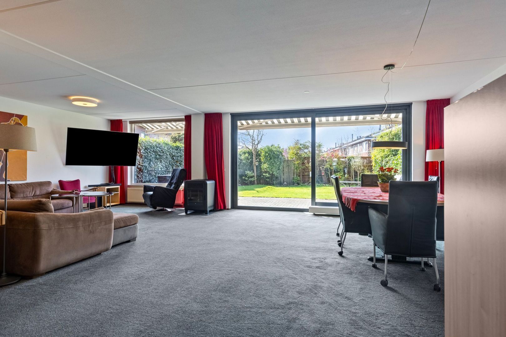 De ruime woonkamer is gelegen aan de achterzijde. De grote ramen zorgen voor veel lichtinval en de schuifpui geeft toegang tot achtertuin. De L-vormige woonkamer heeft een gezellige zithoek en voldoende ruimte om met een groot gezelschap aan een lange tafel plaats te nemen.