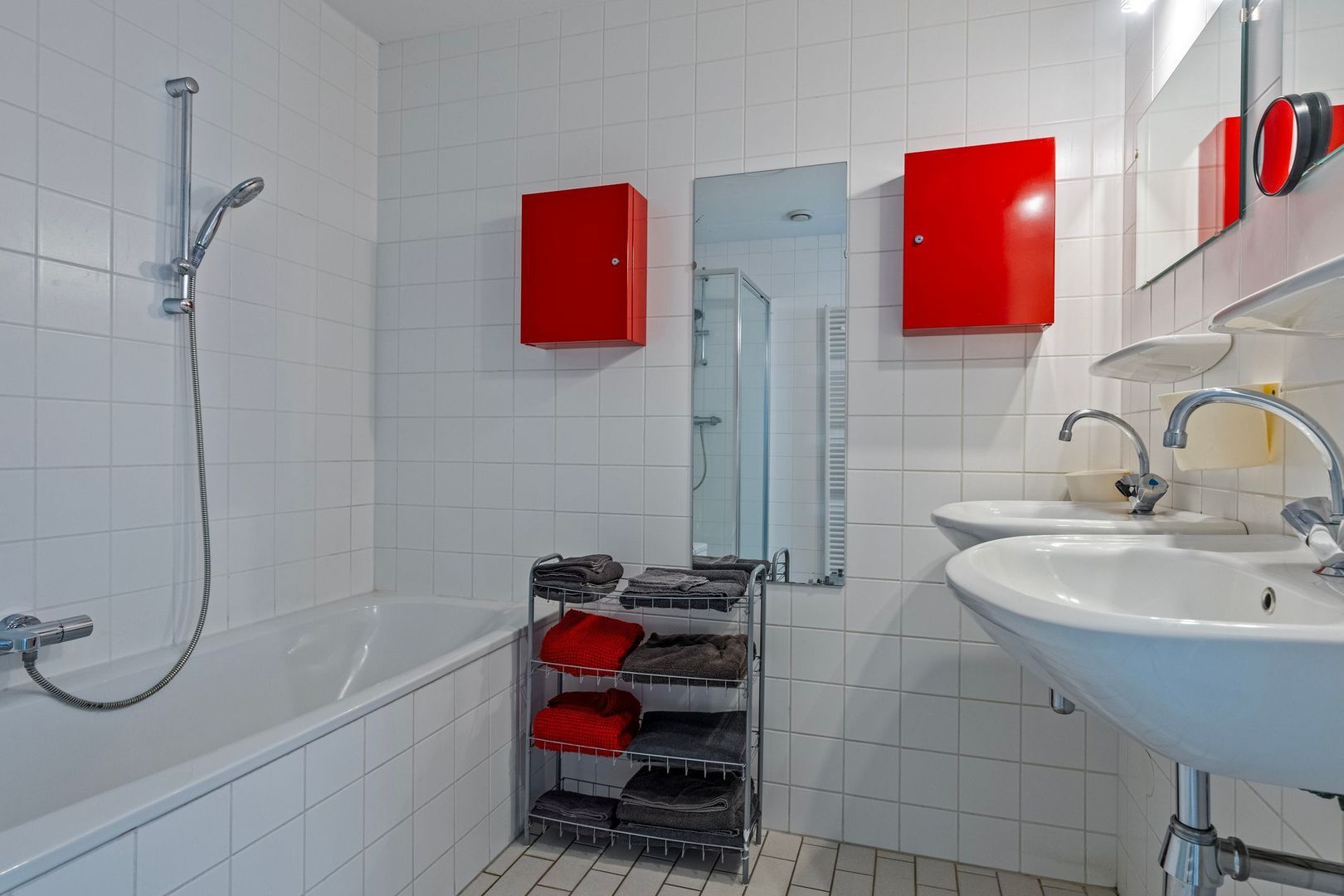 De badkamer is voorzien van een douche, ligbad, twee wastafels en een handdoekradiator.