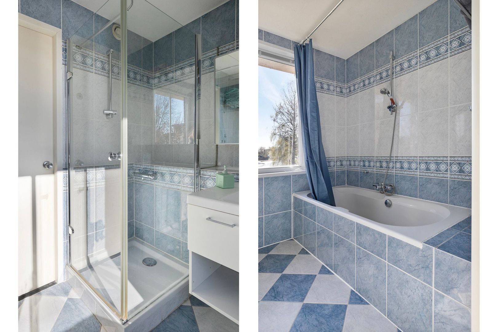 De badkamer is voorzien van een ligbad, douche, wastafel en vloerverwarming.