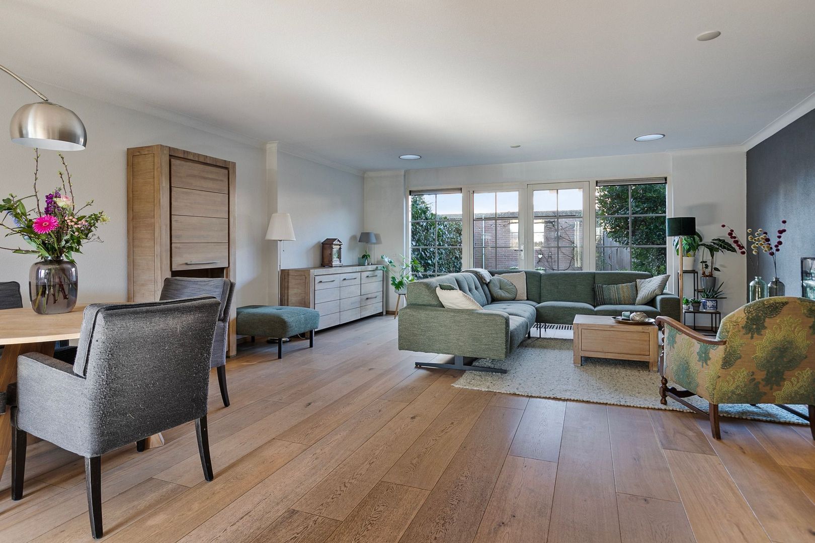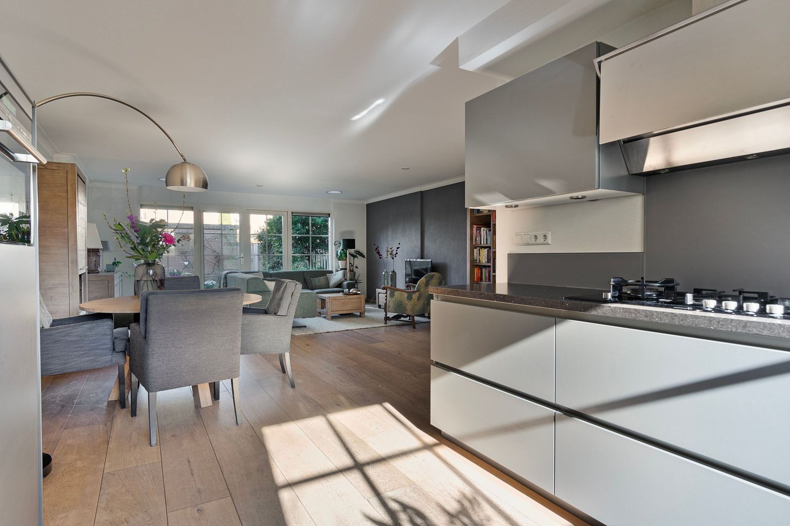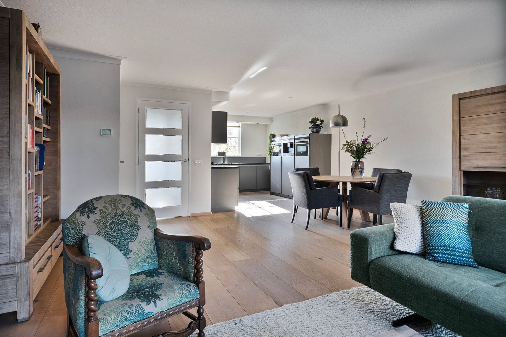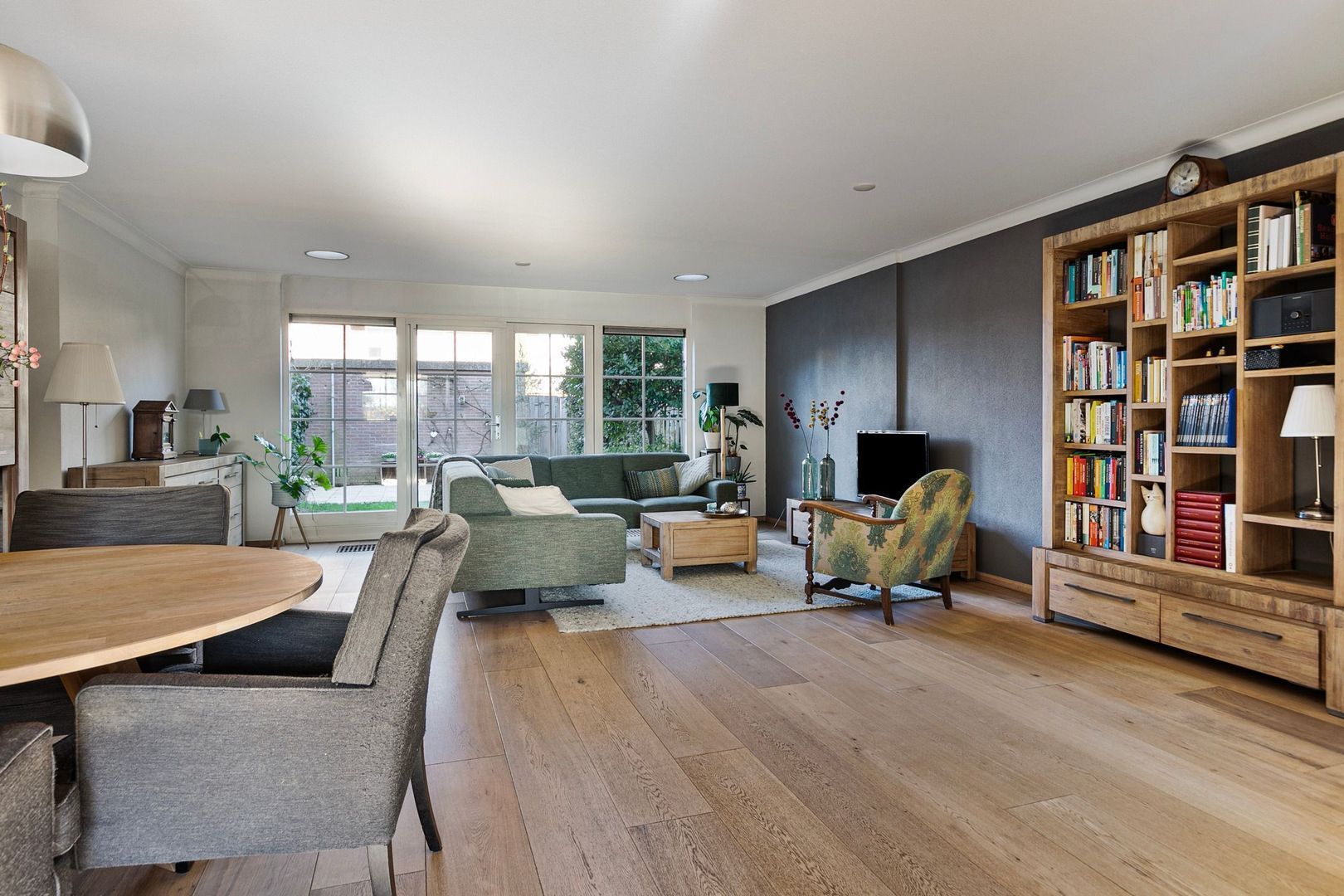 De ruime woonkamer is gelegen aan de achterzijde van de woning en is voorzien van een houten vloer en een trapkast. De open keuken is uitgerust met een vaatwasser, gasfornuis, afzuigkap, oven, stoomoven, espresso apparaat, twee koelkasten en een vriezer.
