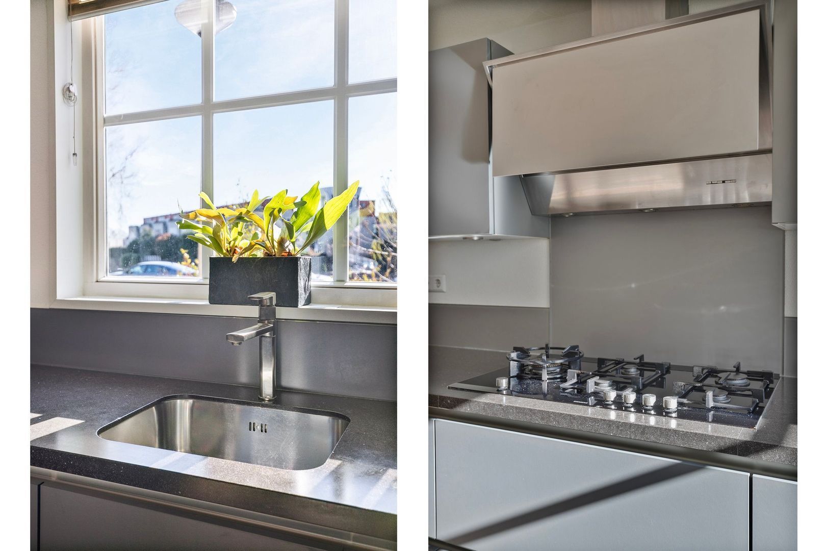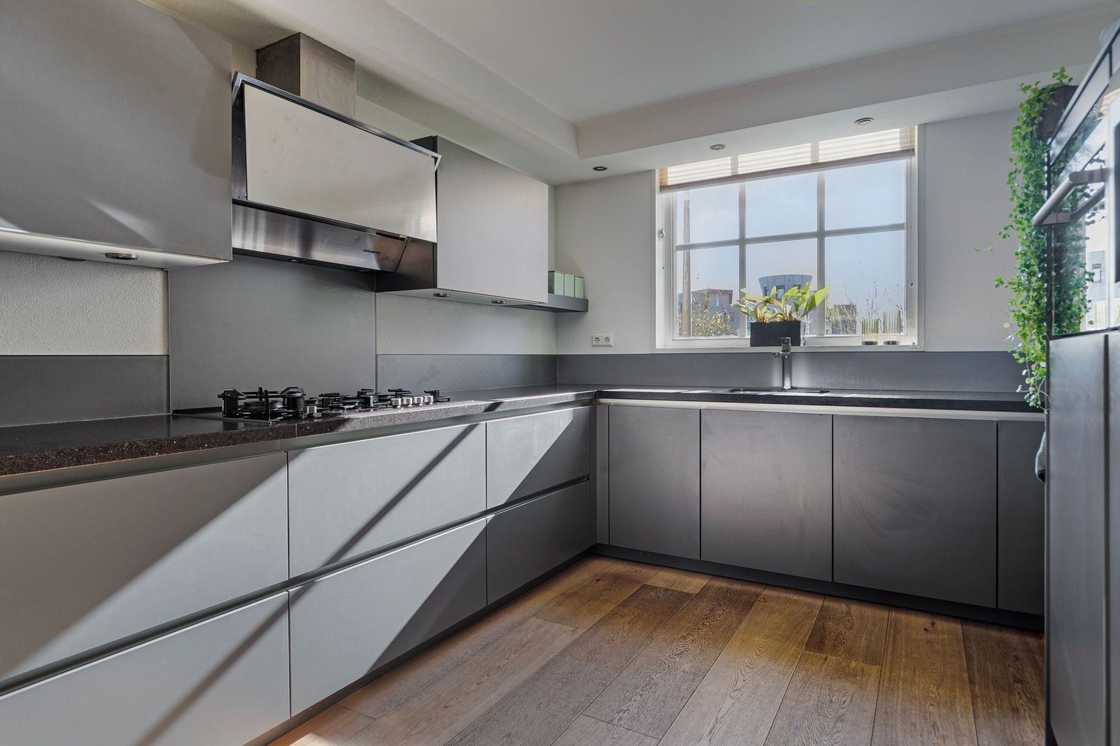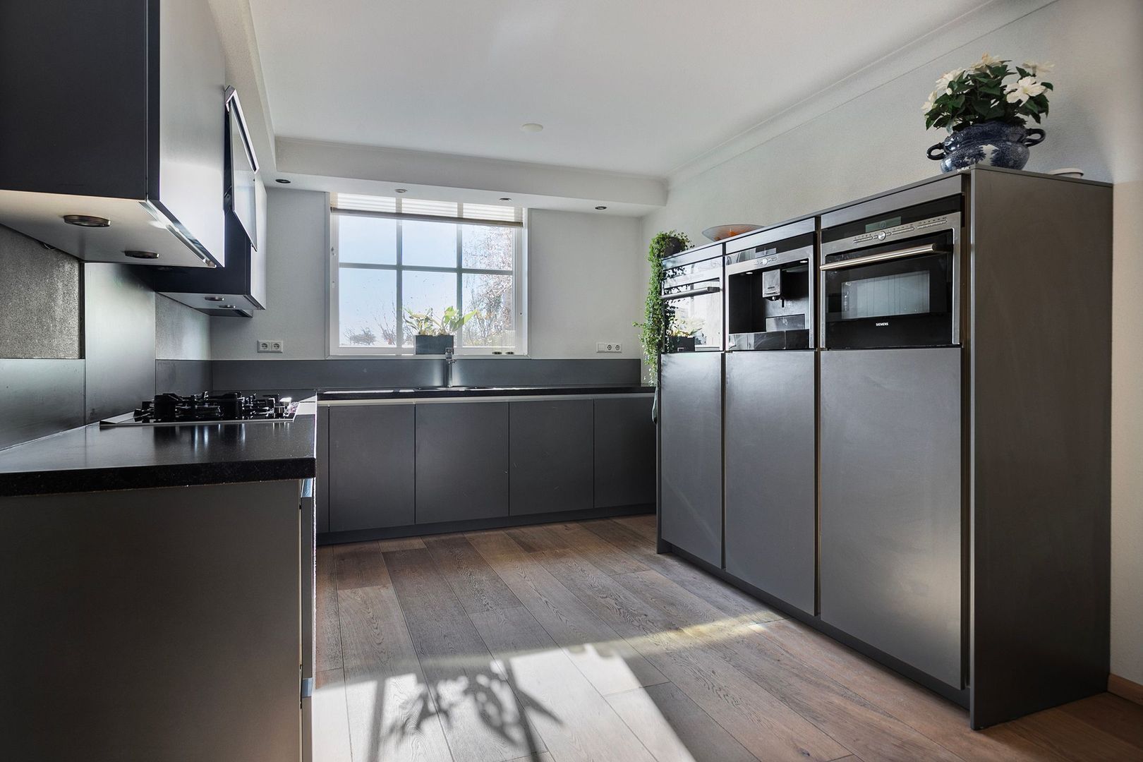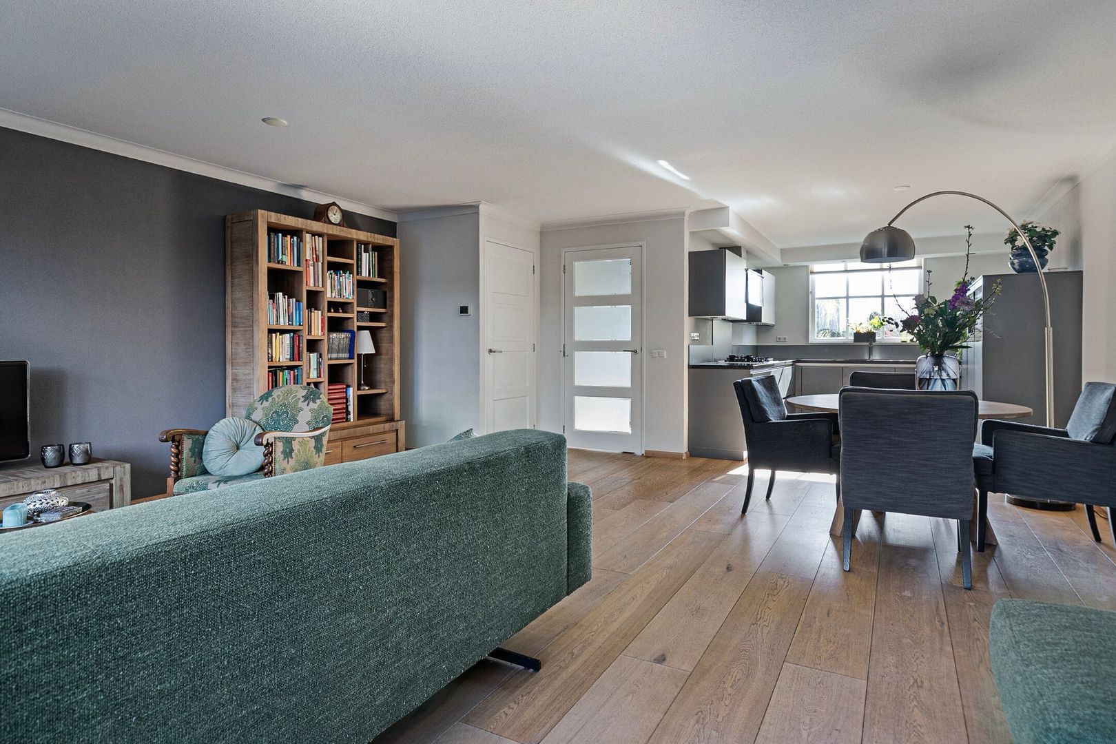 De ruime woonkamer is gelegen aan de achterzijde van de woning en is voorzien van een houten vloer en een trapkast. De open keuken is uitgerust met een vaatwasser, gasfornuis, afzuigkap, oven, stoomoven, espresso apparaat, twee koelkasten en een vriezer.
