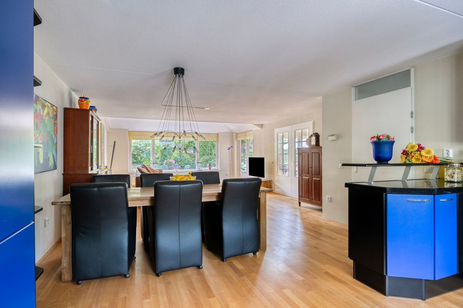 De royale woonkeuken ligt aan de voorzijde van de woning en is voorzien van veel kastruimte, een granieten aanrechtblad en diverse inbouwapparatuur, zoals een gasfornuis met afzuigkap, oven, magnetron,
