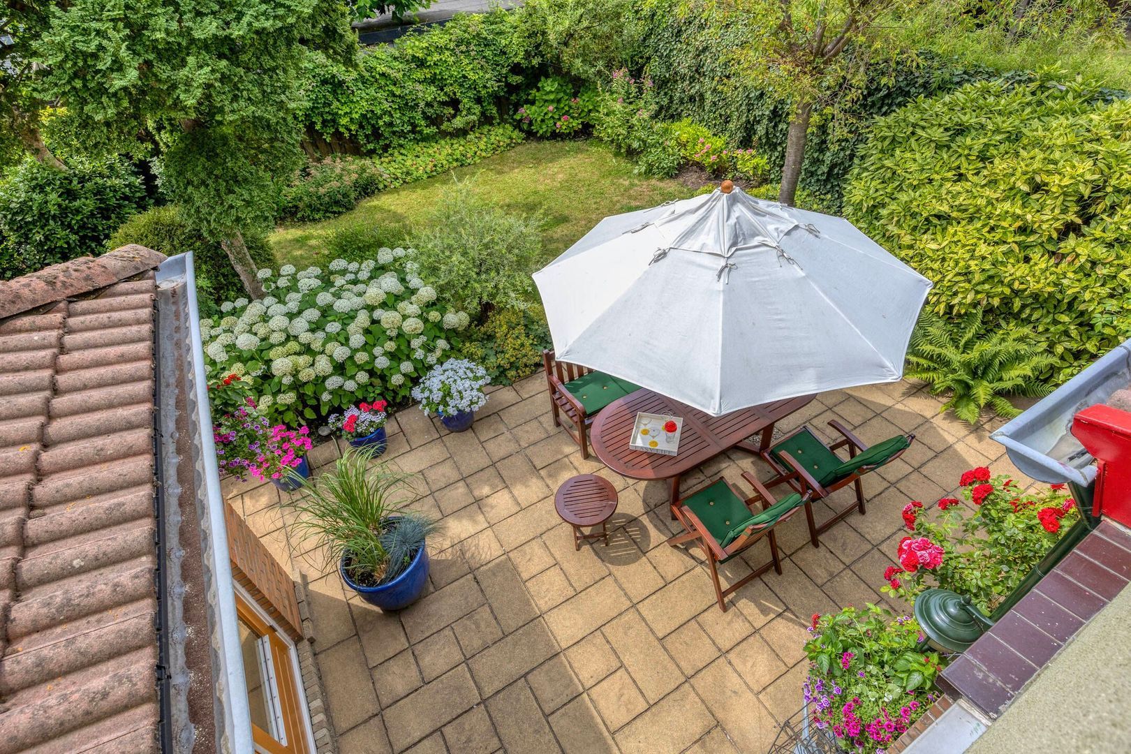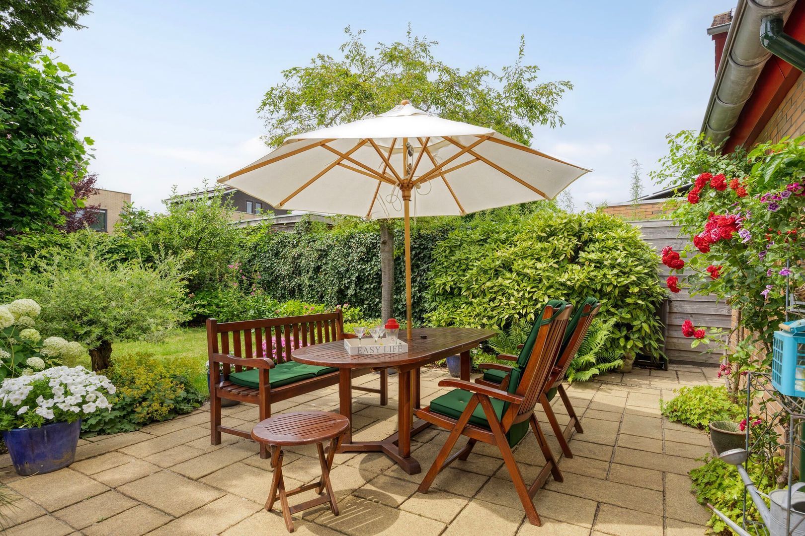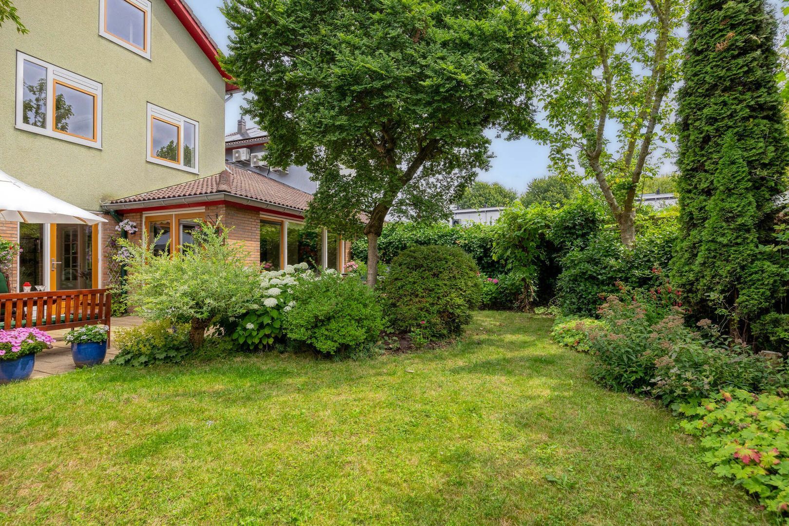 De fraai aangelegde achtertuin is gelegen op het zonnige zuidwesten en biedt volop privacy. Het gazon in combinatie met diverse planten, struiken en bomen zorgt voor een groene, rustige sfeer. Een heerlijke