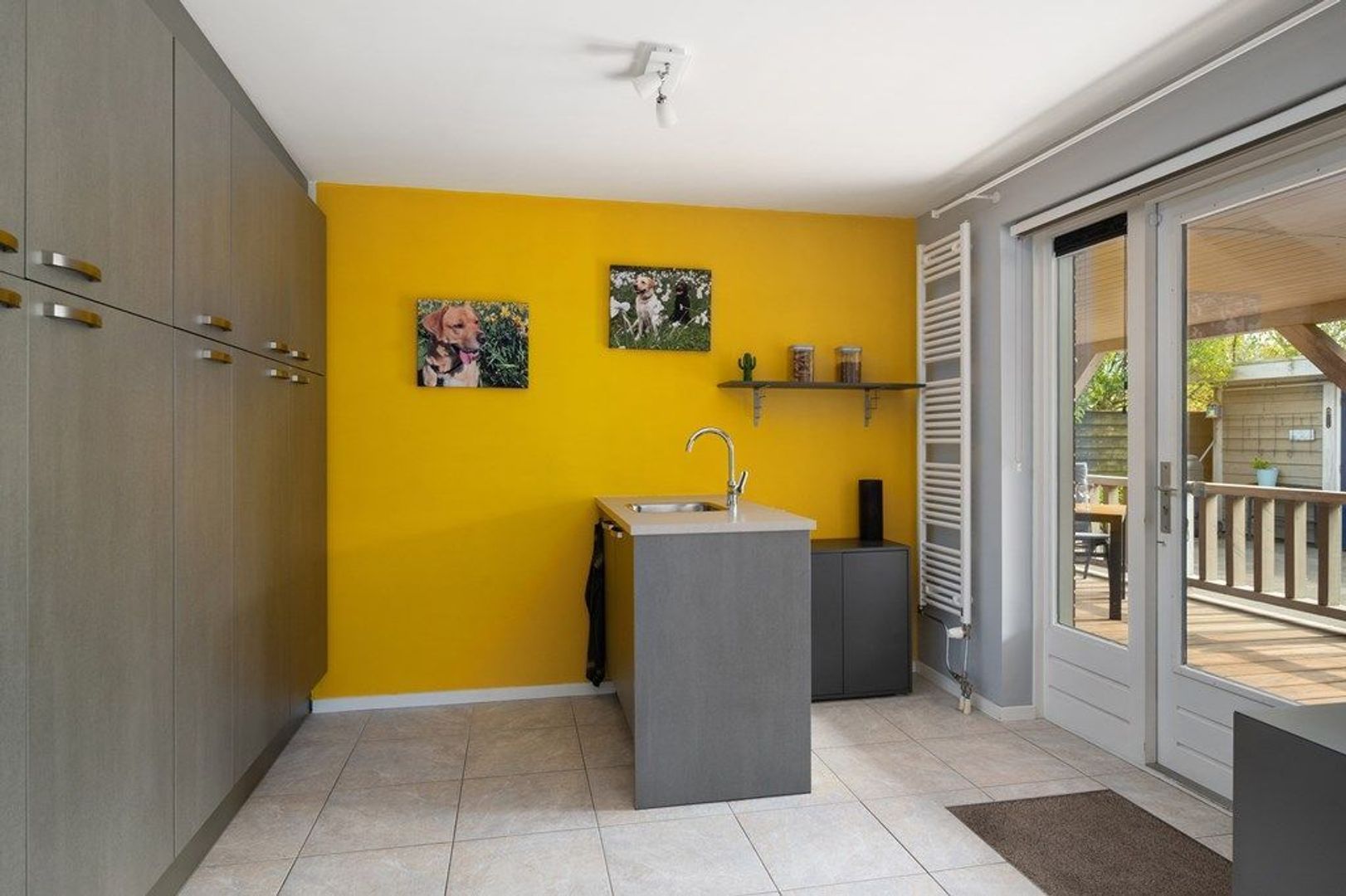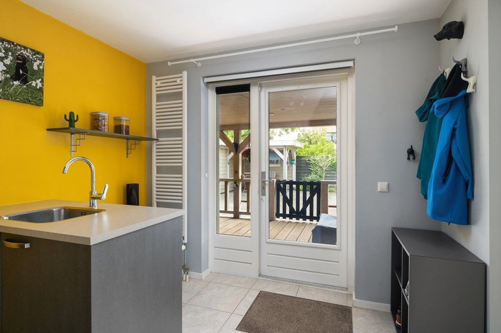 De woonkamer biedt toegang tot de multifunctionele kamer welke nu gebruikt wordt als bijkeuken welke voorzien is van een vaste kastenwand, plintboiler, koelkast en vriezer. De veranda en tuin is ook vanuit deze kamer bereikbaar.