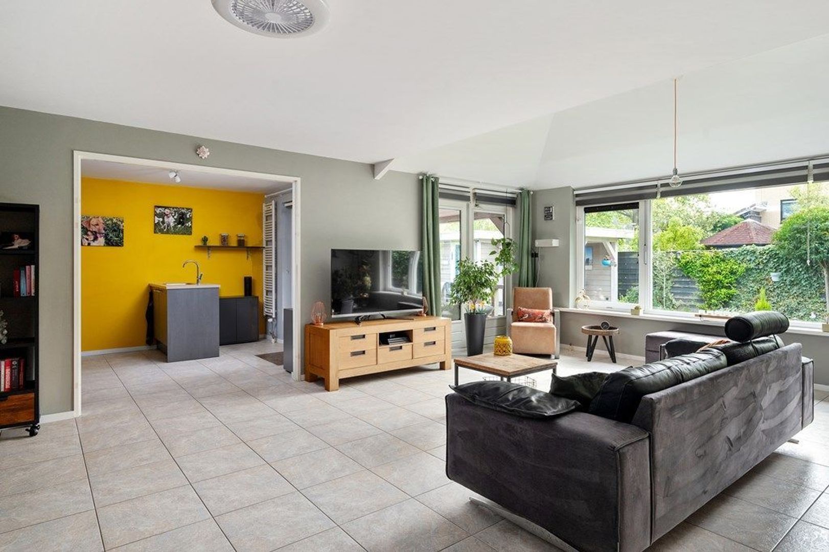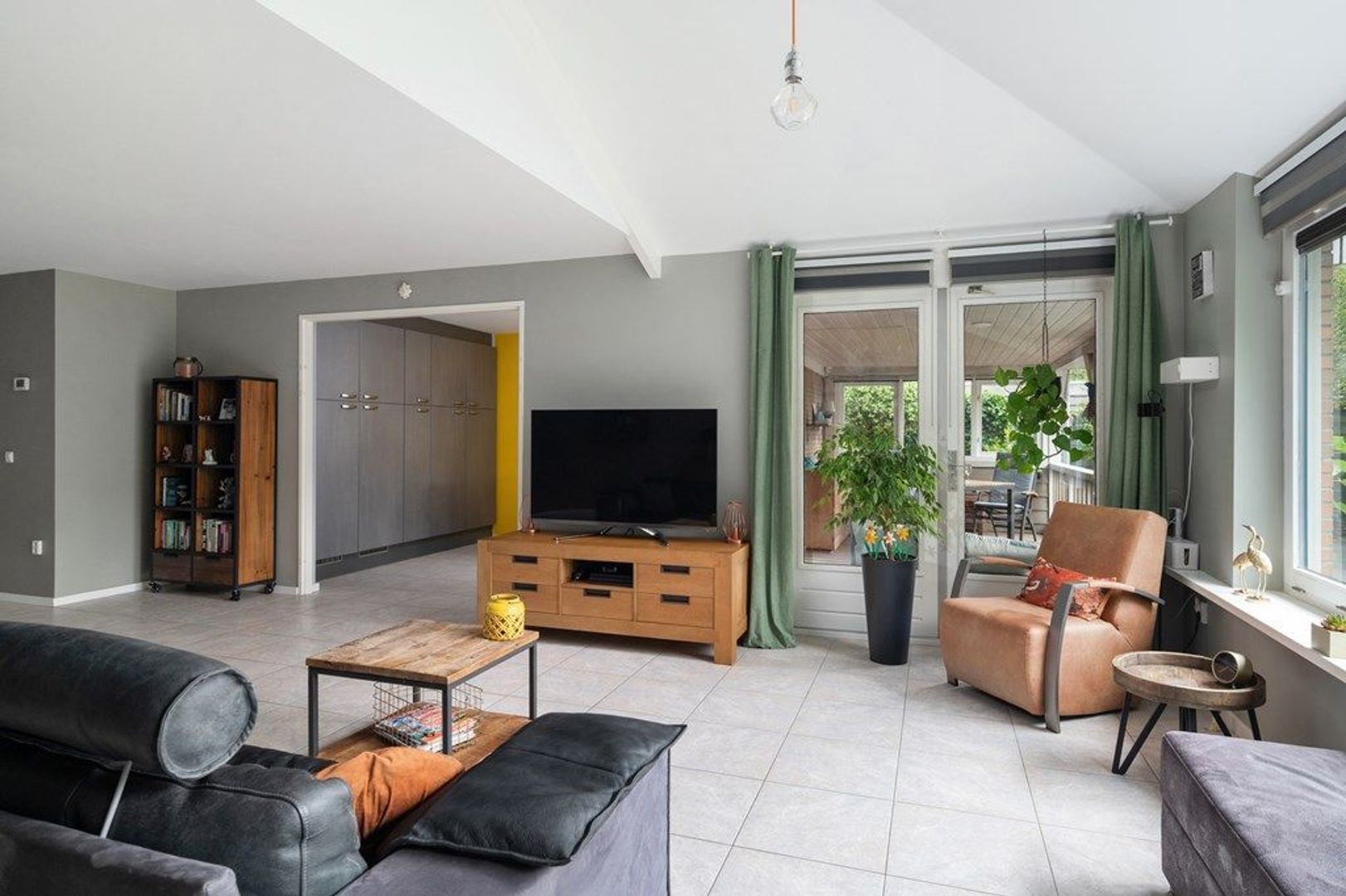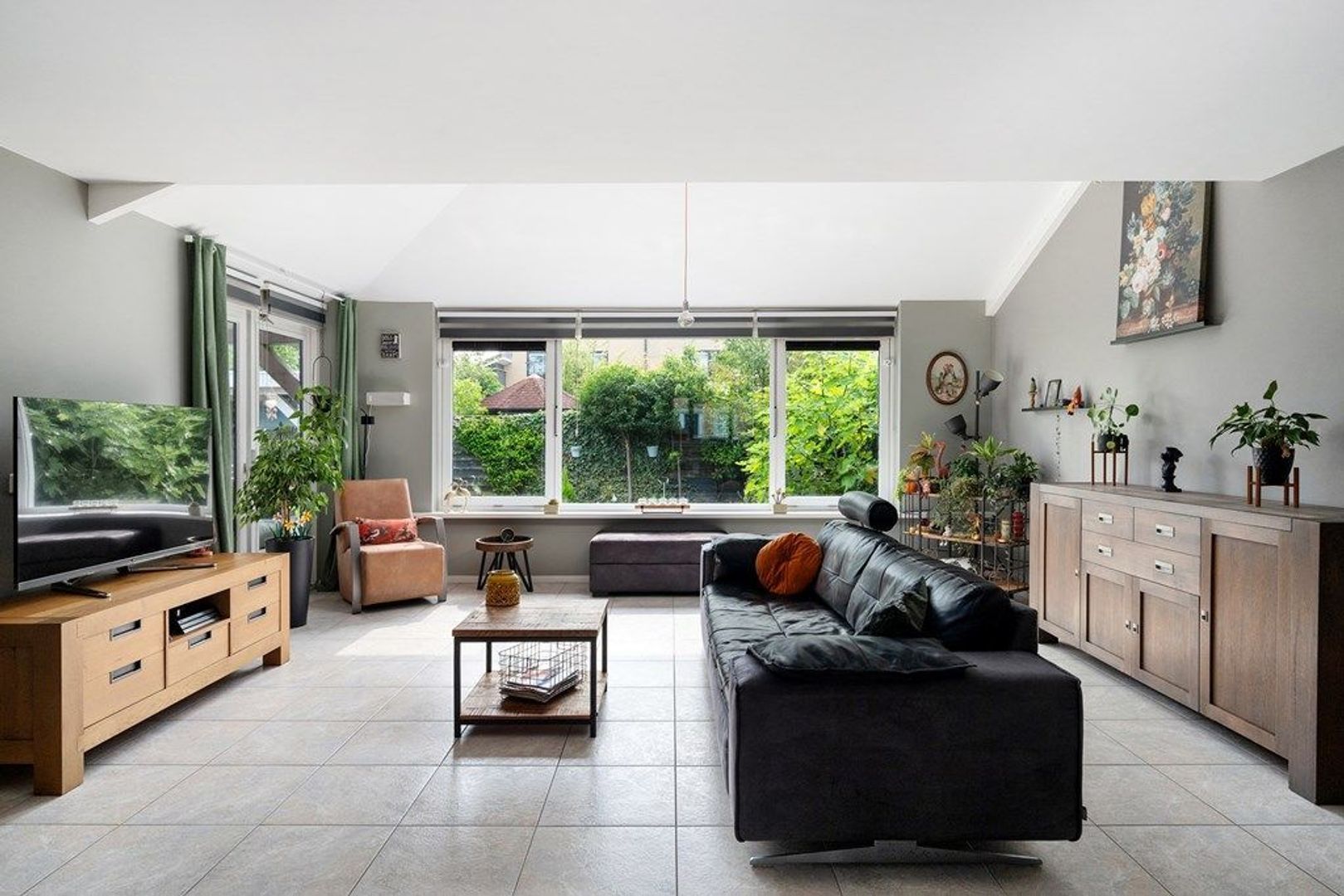 Via de keuken loop je de tuingerichte woonkamer binnen die een bijzonder ruimtelijk effect heeft dankzij het schuin aflopende hoge dak aan de achterzijde. Via de openslaande deuren heb je toegang tot de veranda en de fraai aangelegde achtertuin.