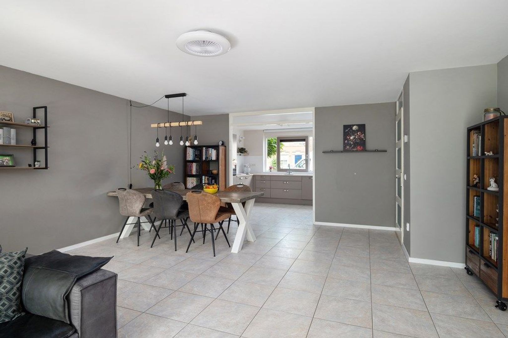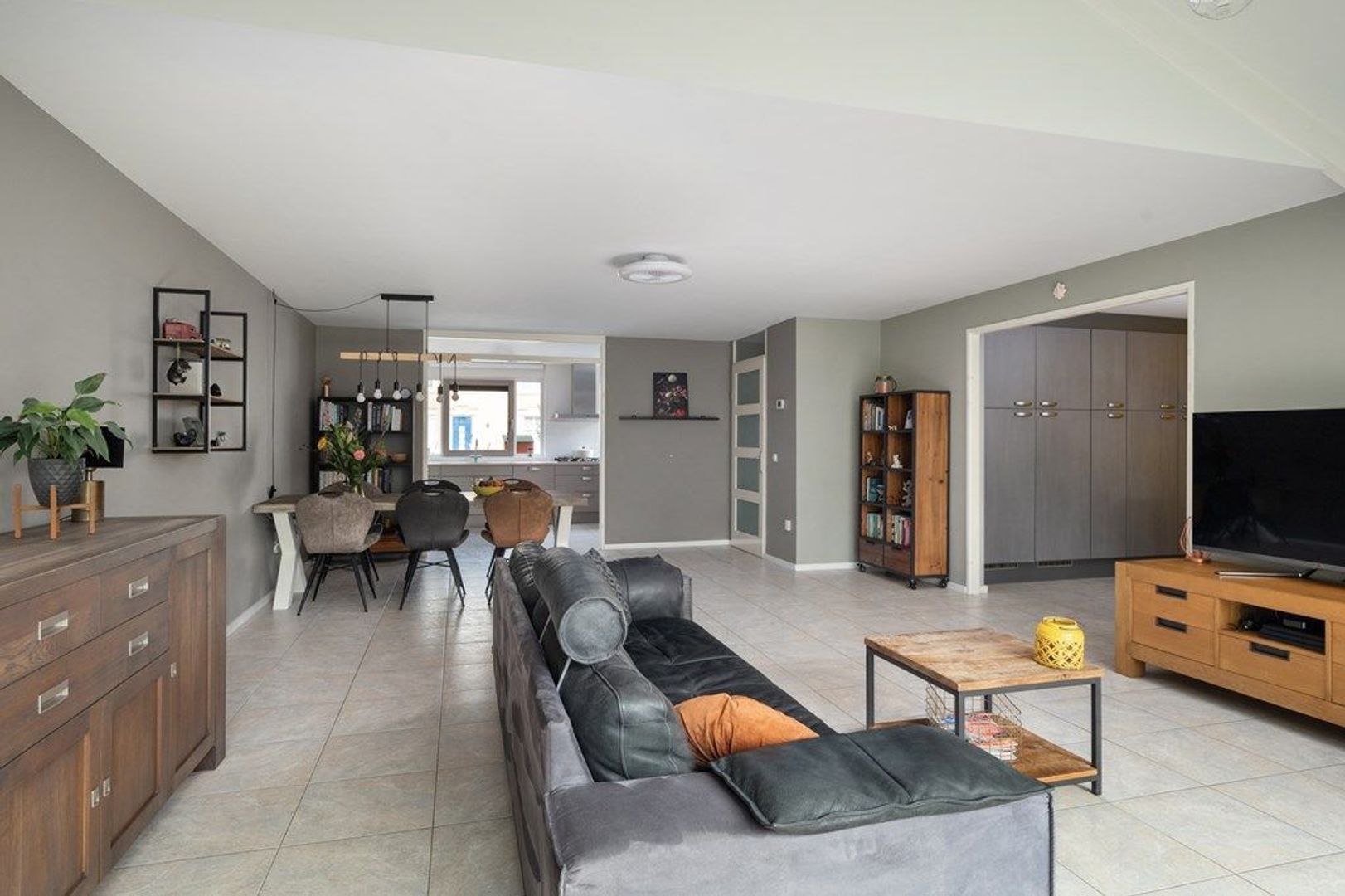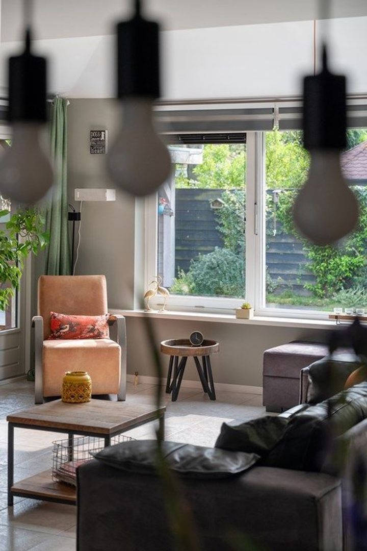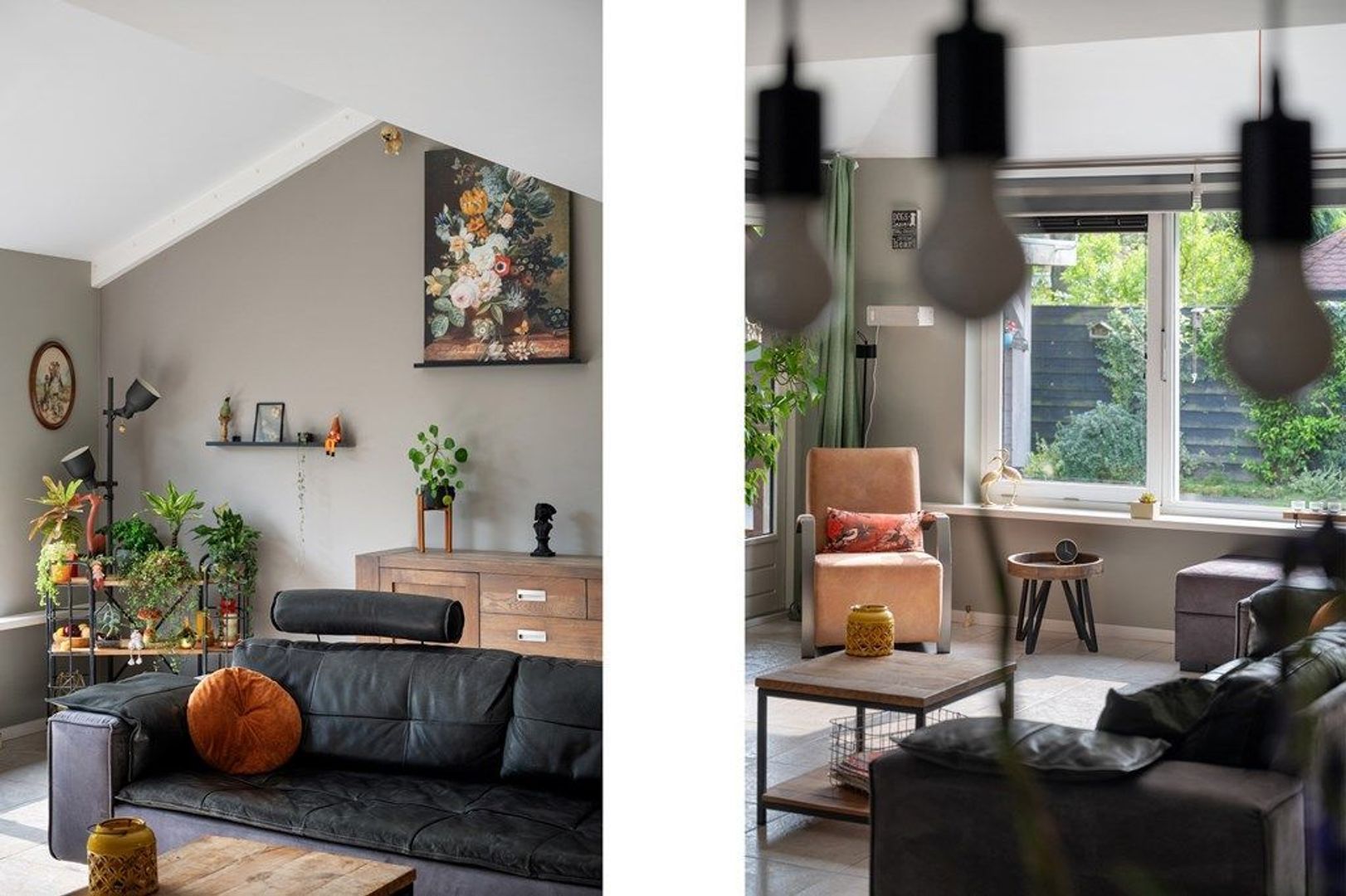 Via de keuken loop je de tuingerichte woonkamer binnen die een bijzonder ruimtelijk effect heeft dankzij het schuin aflopende hoge dak aan de achterzijde. Via de openslaande deuren heb je toegang tot de veranda en de fraai aangelegde achtertuin.