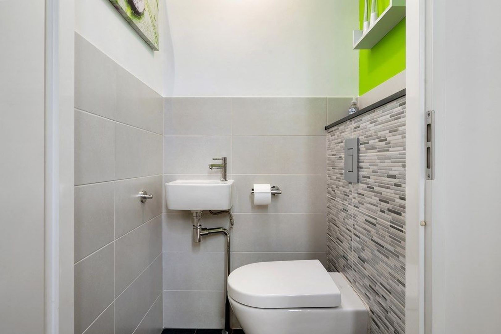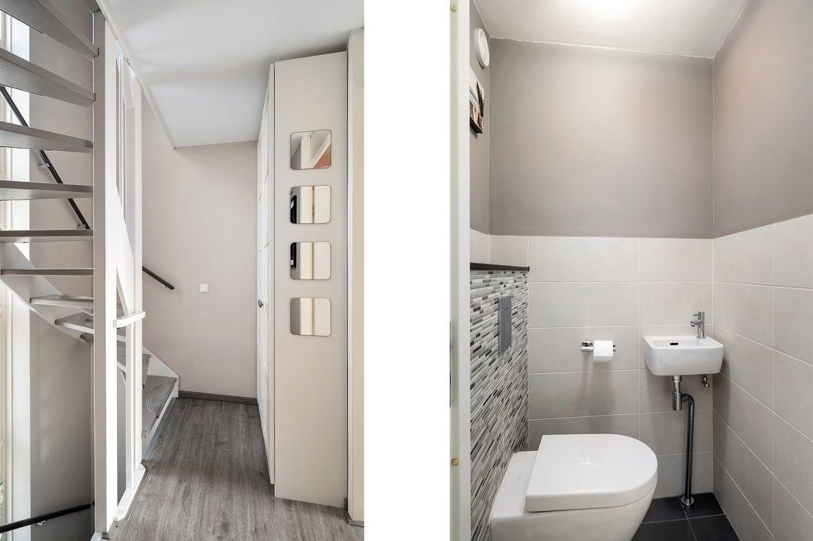 Overloop met toilet voorzien van fonteintje, trapopgang naar de 2e verdieping en toegang tot de badkamer en de 3 slaapkamers.