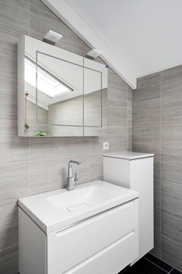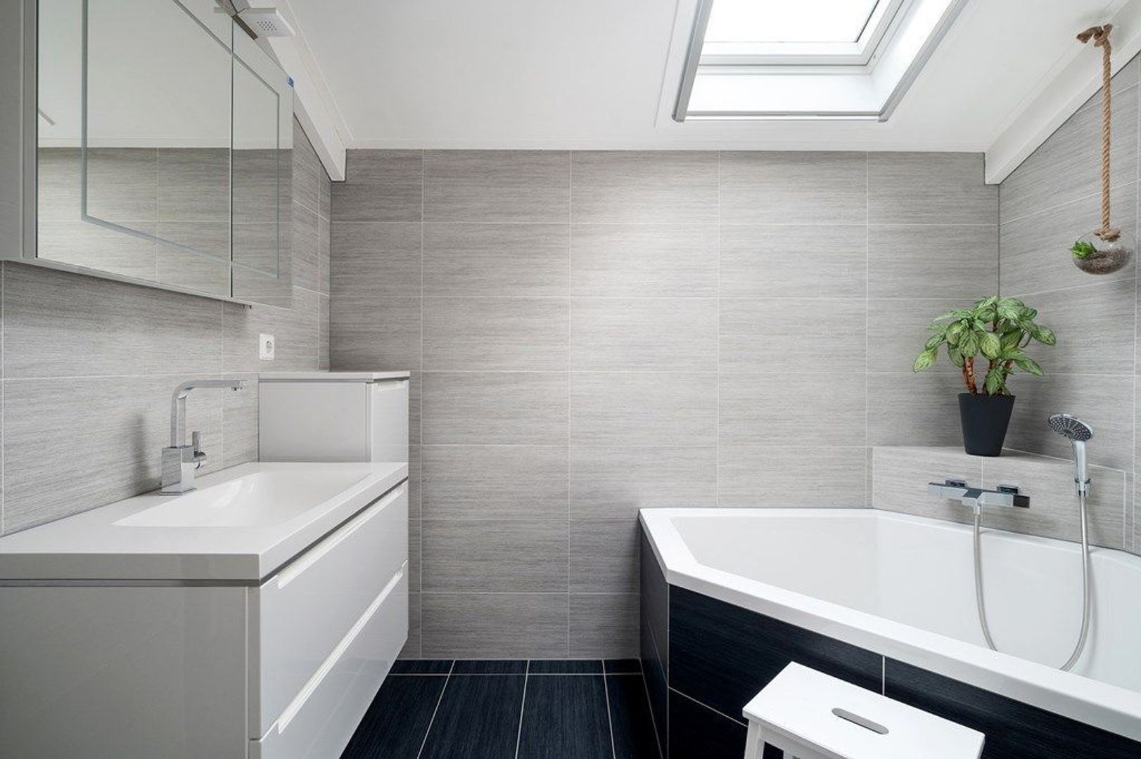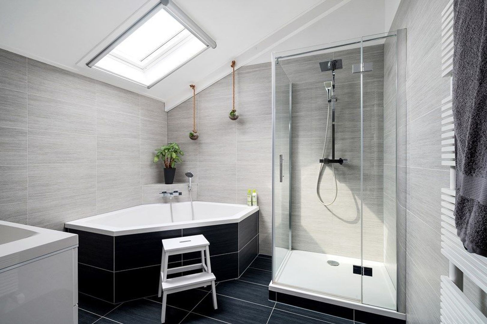 De badkamer is voorzien van een ligbad, douche cabine, wastafelmeubel, handdoeken kast, spiegelkast en designradiator.