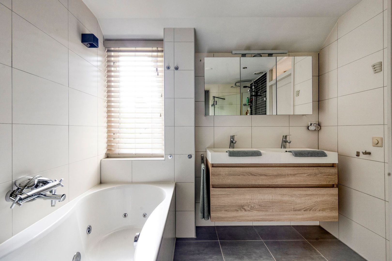 De badkamer is voorzien van een ligbad, toilet, douche en dubbele wastafel.