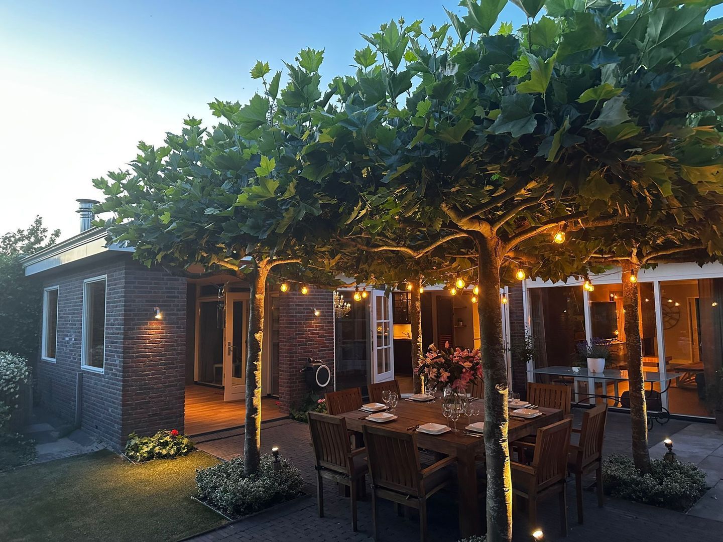 De achtertuin is voorzien van een breed terras met centraal een heerlijke zitplek onder de natuurlijke parasols in de vorm van een viertal dakplatanen. Aan de waterkant is een houten vlonder terras met Jacuzzi.