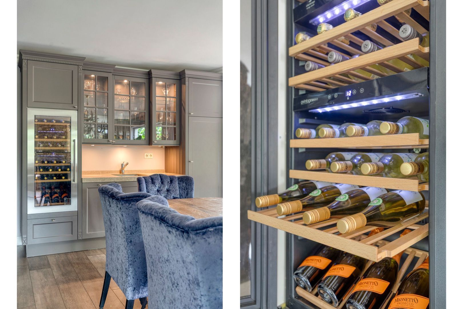 In het verlengde van de keuken bevindt zich de eetkamer met een extra keukenblok met onder andere een extra koelkast en een klimaatkast. Vanuit de eetkamer kom je via openslaande deuren in de veranda met openhaard en is er een deur naar de garage. Ook geven de openslaande deuren toegang geven tot de achtertuin.