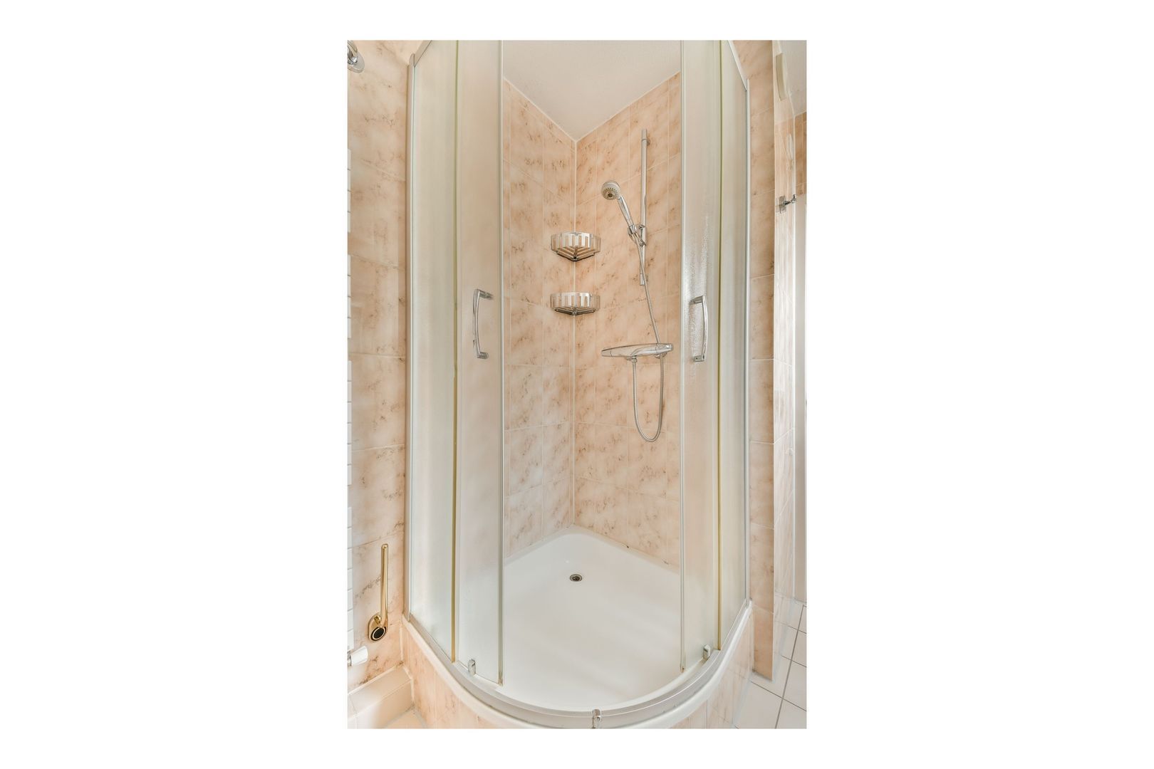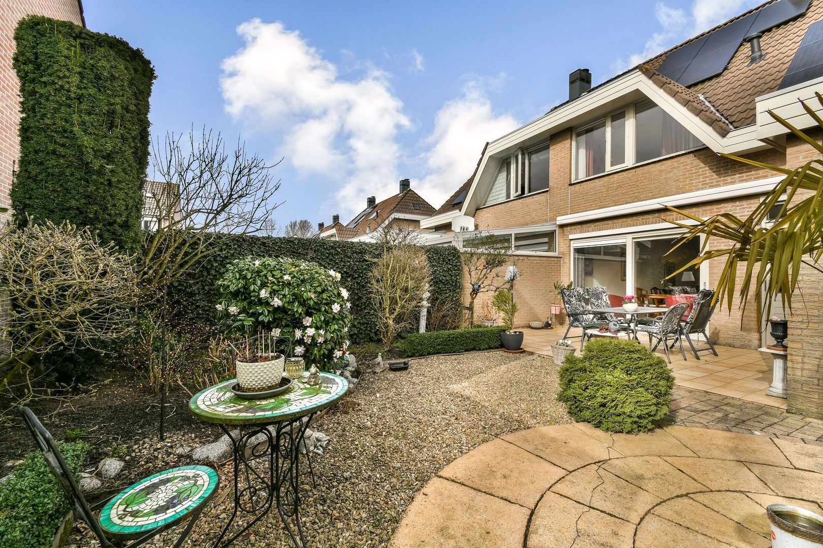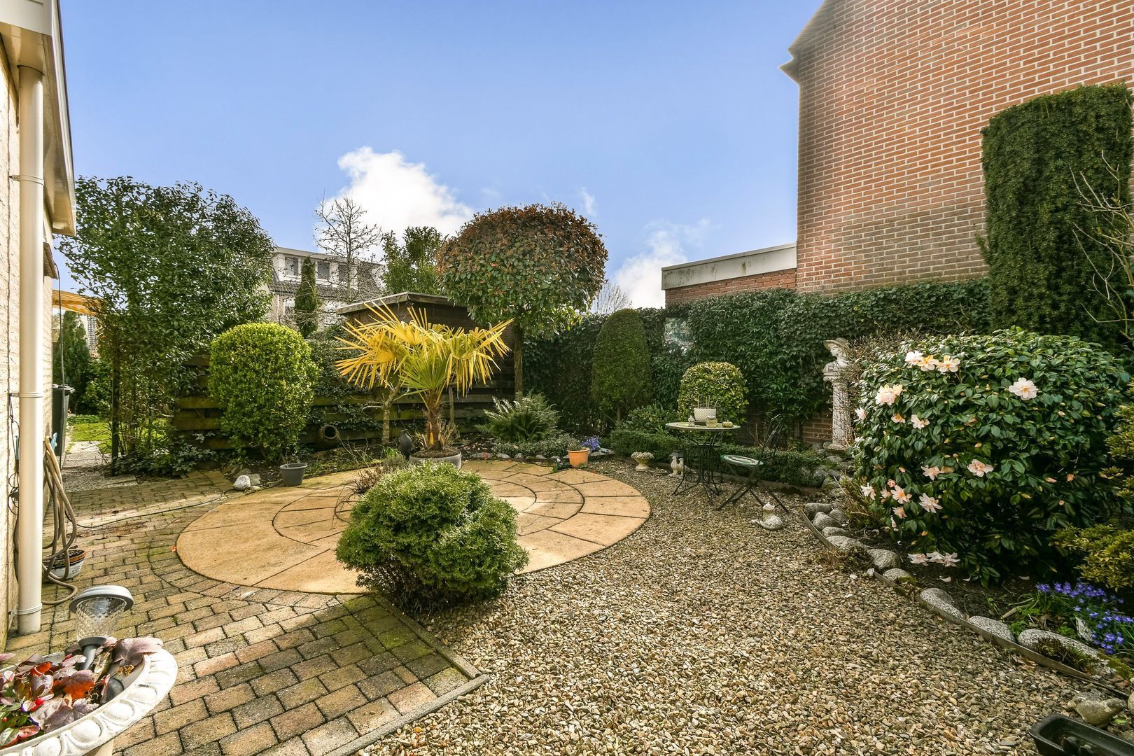 De zonnige achtertuin ligt op het zuidwesten en beschikt over diverse terrassen en plantenborders. Een heerlijke plek waar je heel de dag van de zon geniet. Het terras direct bij de woning is onderheid. De met zorg aangelegde tuin is bereikbaar via de schuifpui in de woonkamer en via de deur in de keuken. Aan de achterzijde van de woning bevindt zich tevens een elektrisch bedienbaar zonnescherm.