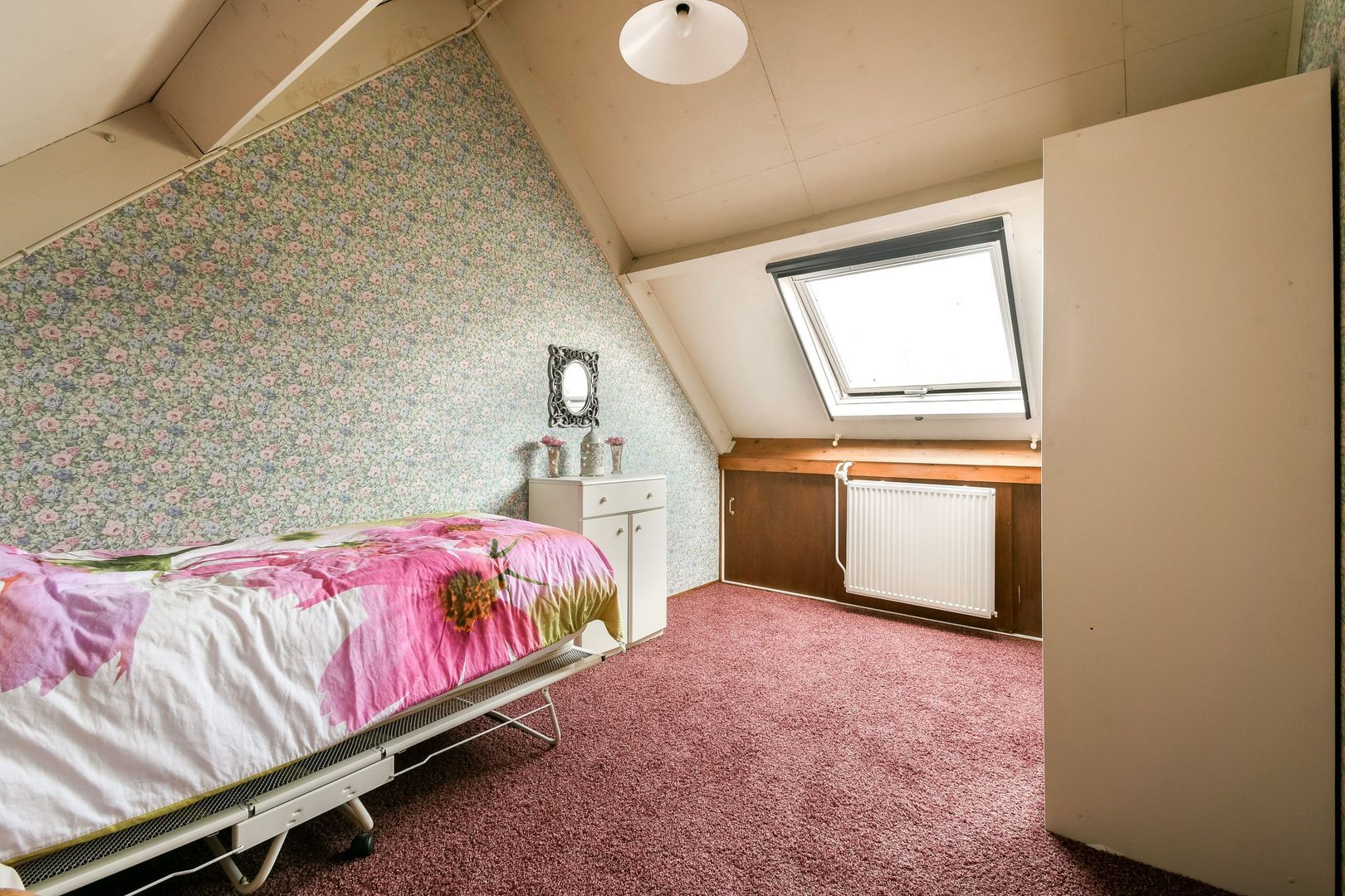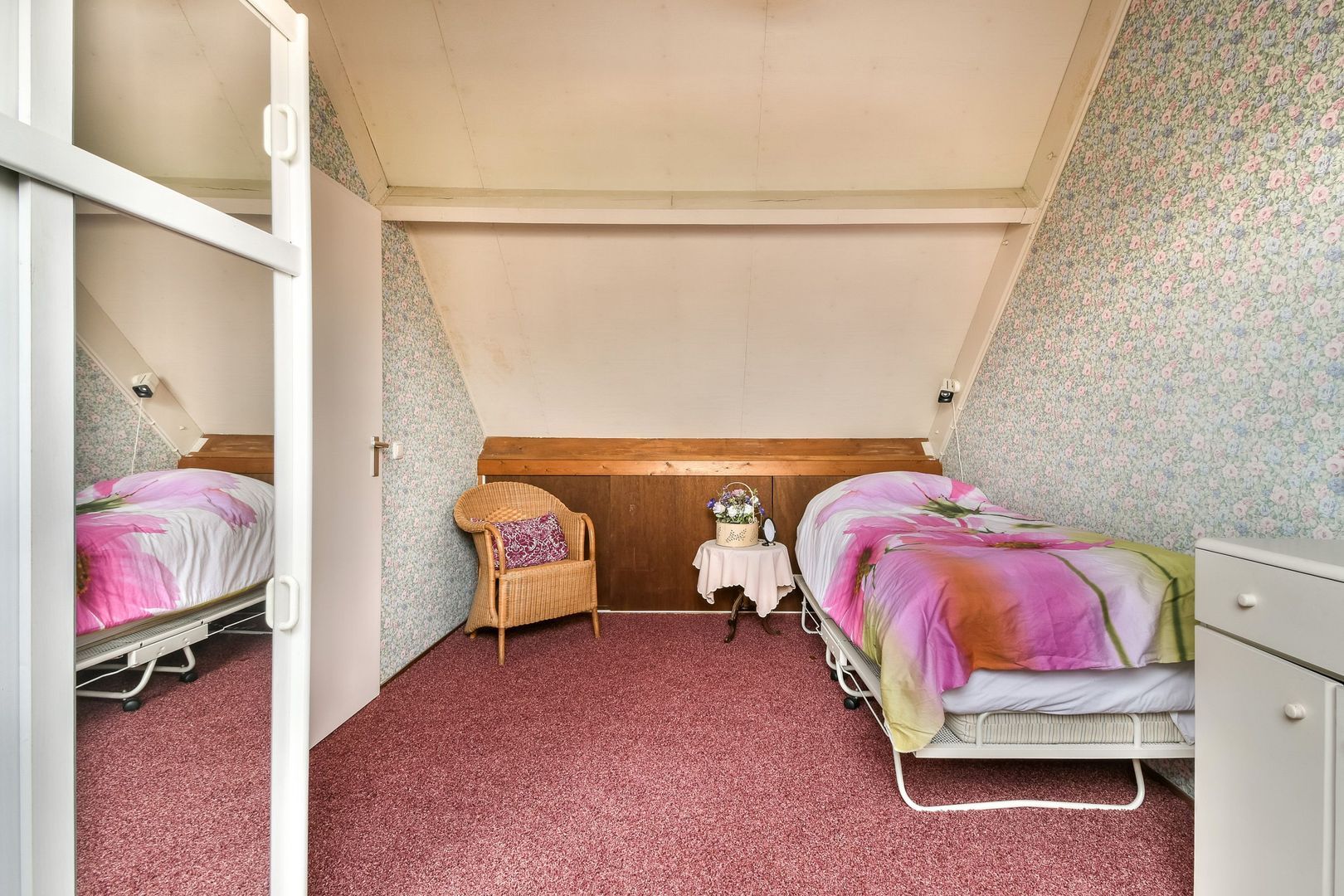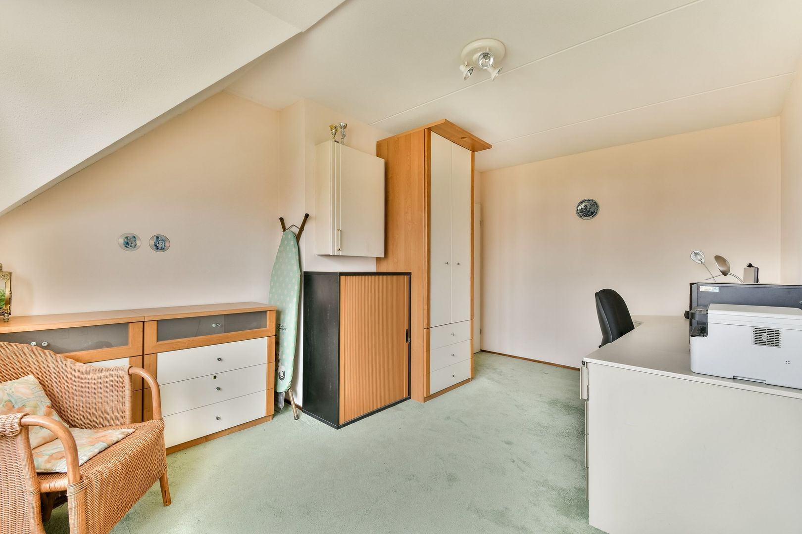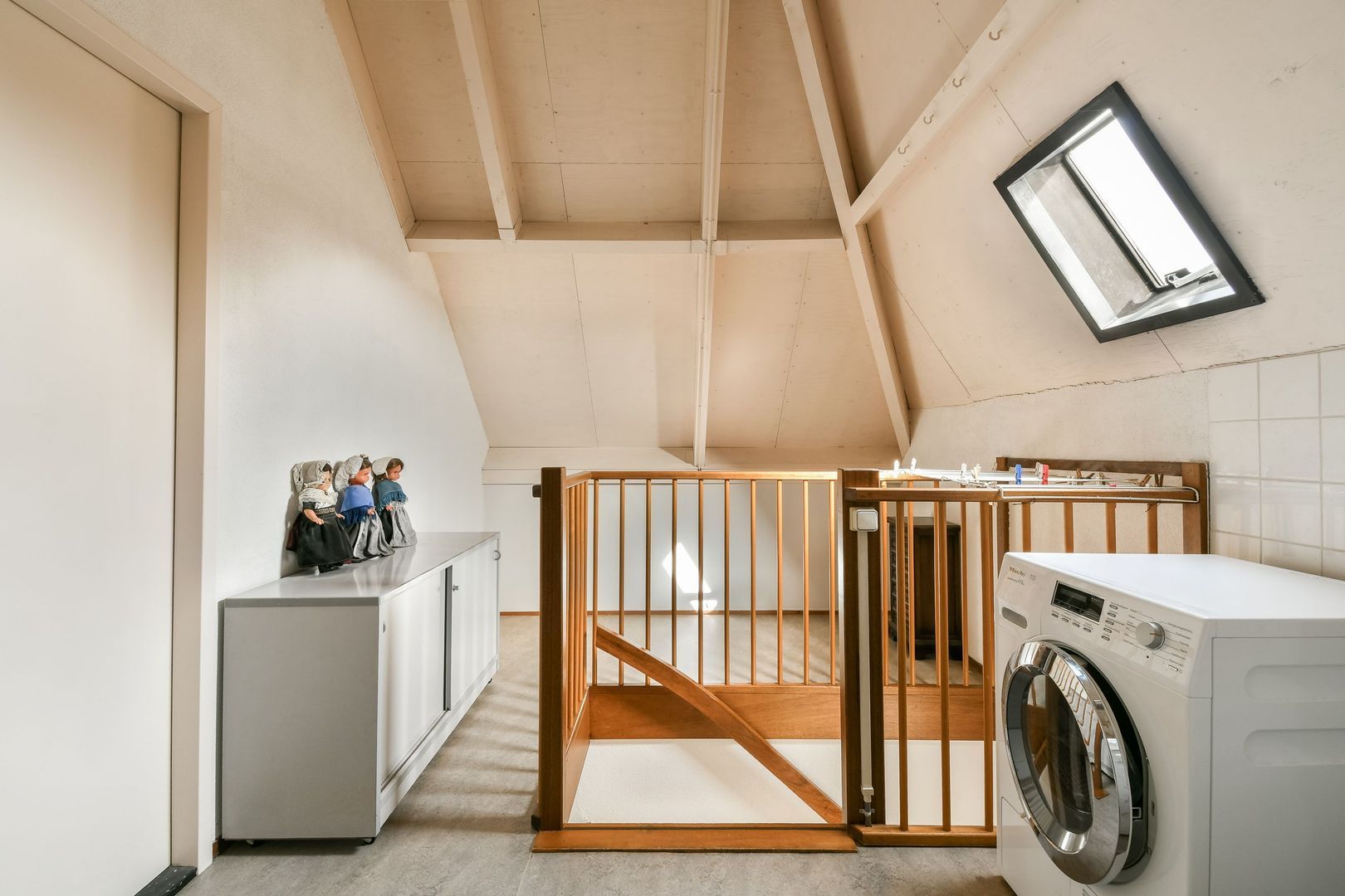 Ruime overloop met veel bergruimte onder het schuine dak.. Hier bevindt zich een wastafel en een praktische was- en strijkruimte en is voorzien van marmoleum. .Daarnaast vindt u hier de 4de slaapkamer voorzien van vloerbedekking en een Velux-dakraam met eveneens genoeg bergruimte.