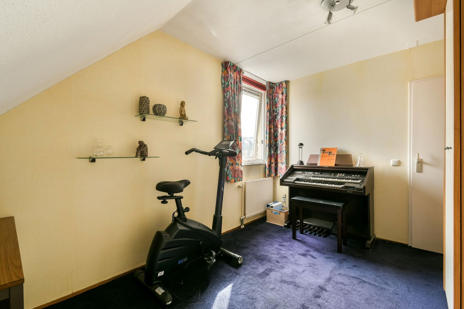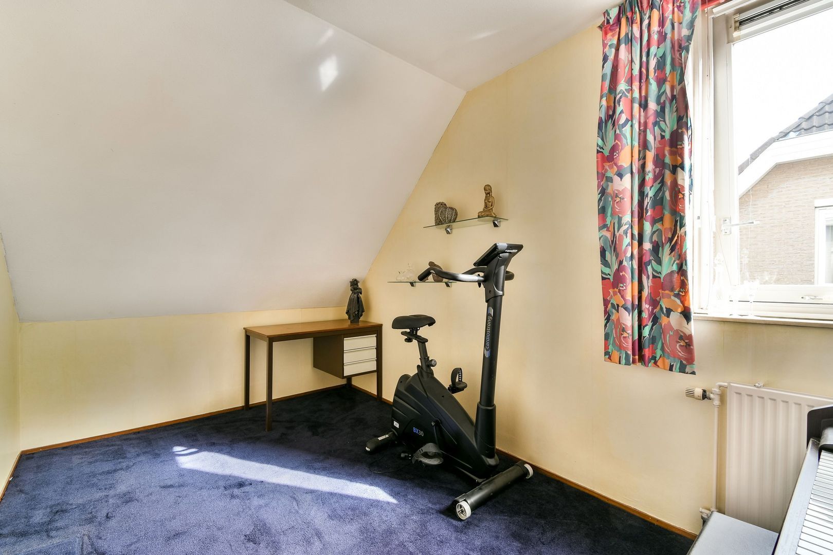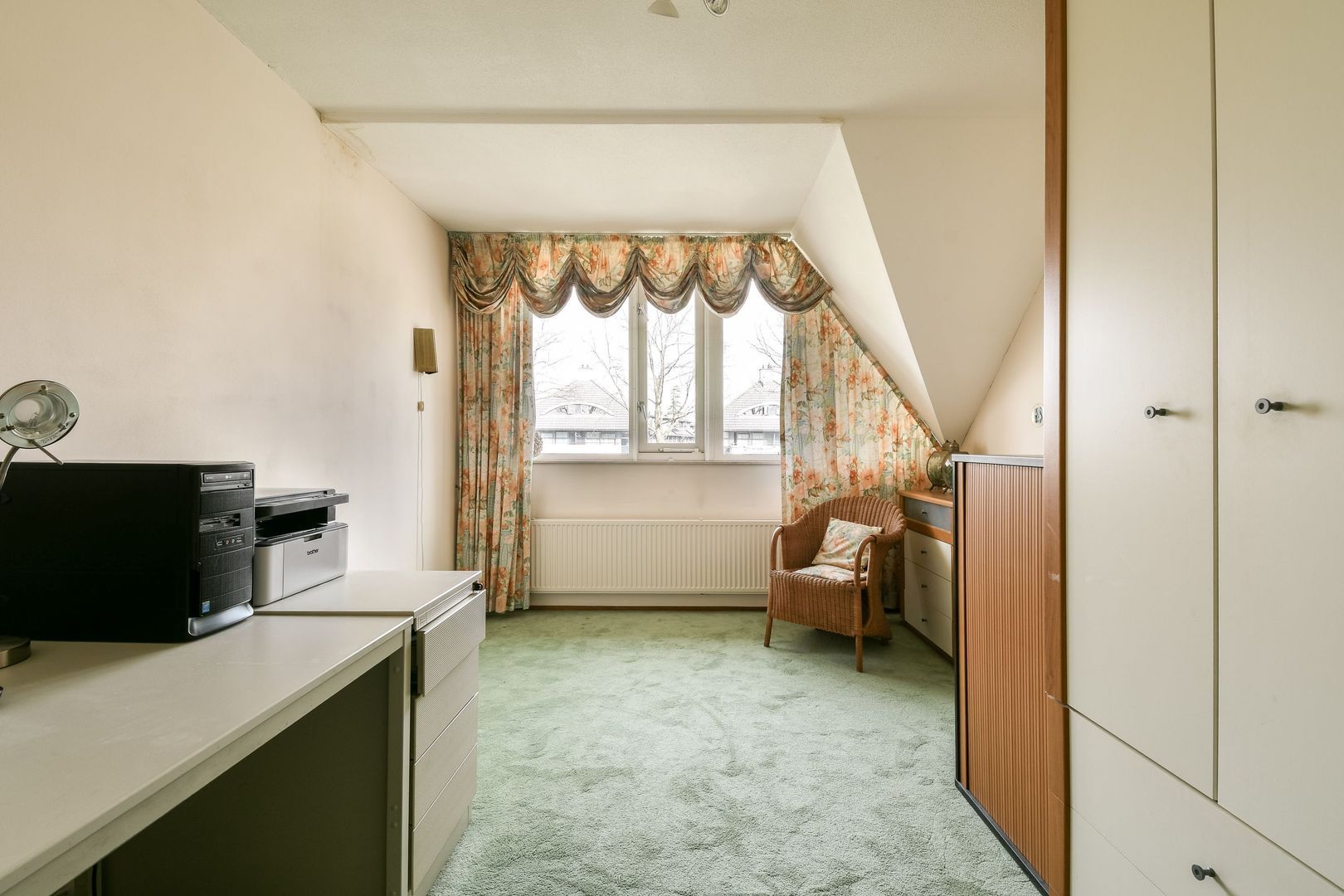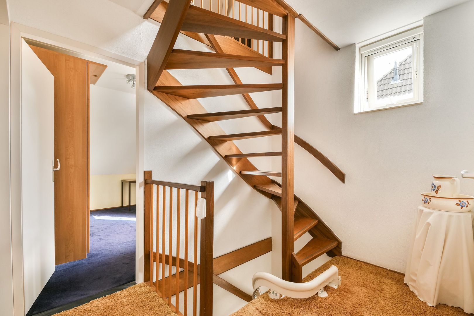 Ruime overloop met veel bergruimte onder het schuine dak.. Hier bevindt zich een wastafel en een praktische was- en strijkruimte en is voorzien van marmoleum. .Daarnaast vindt u hier de 4de slaapkamer voorzien van vloerbedekking en een Velux-dakraam met eveneens genoeg bergruimte.