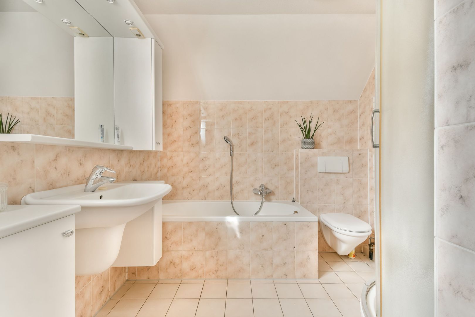 De badkamer is uitgerust met een ligbad, douche, toilet, wastafel en handdoekradiator.