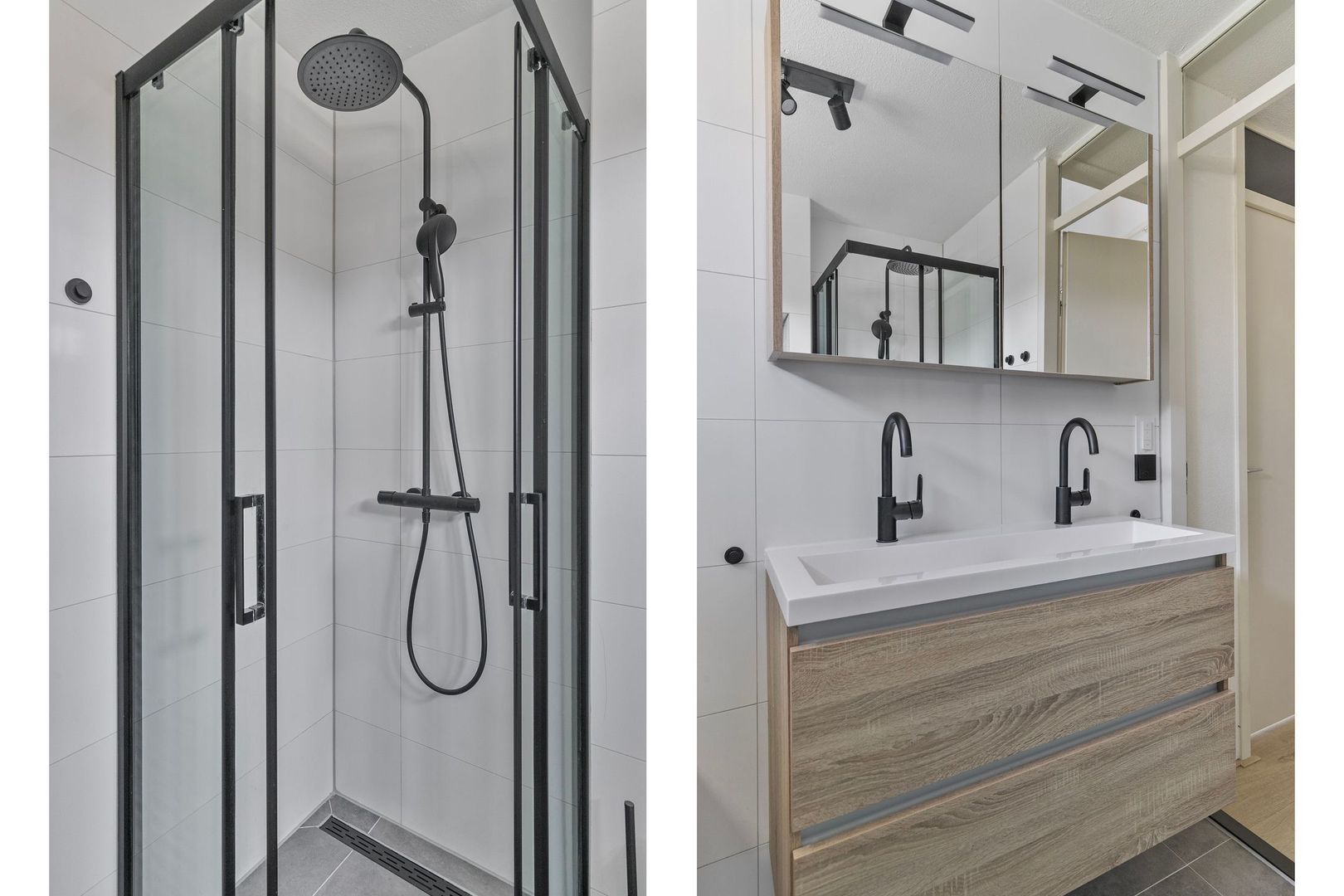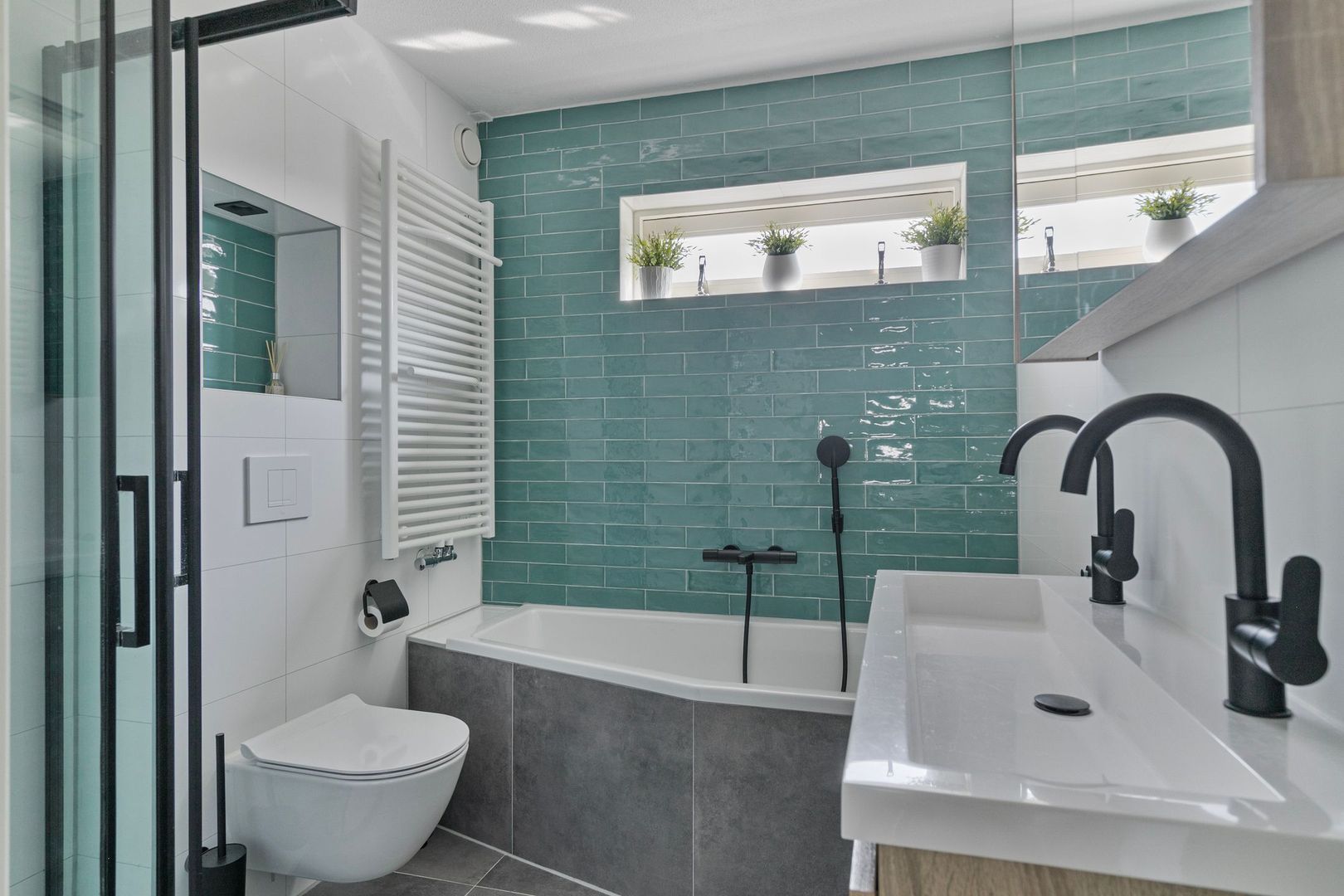 De badkamer is aan de voorzijde gelegen en beschikt over een dubbele wastafel, douche, ligbad, toilet en handdoekradiator.