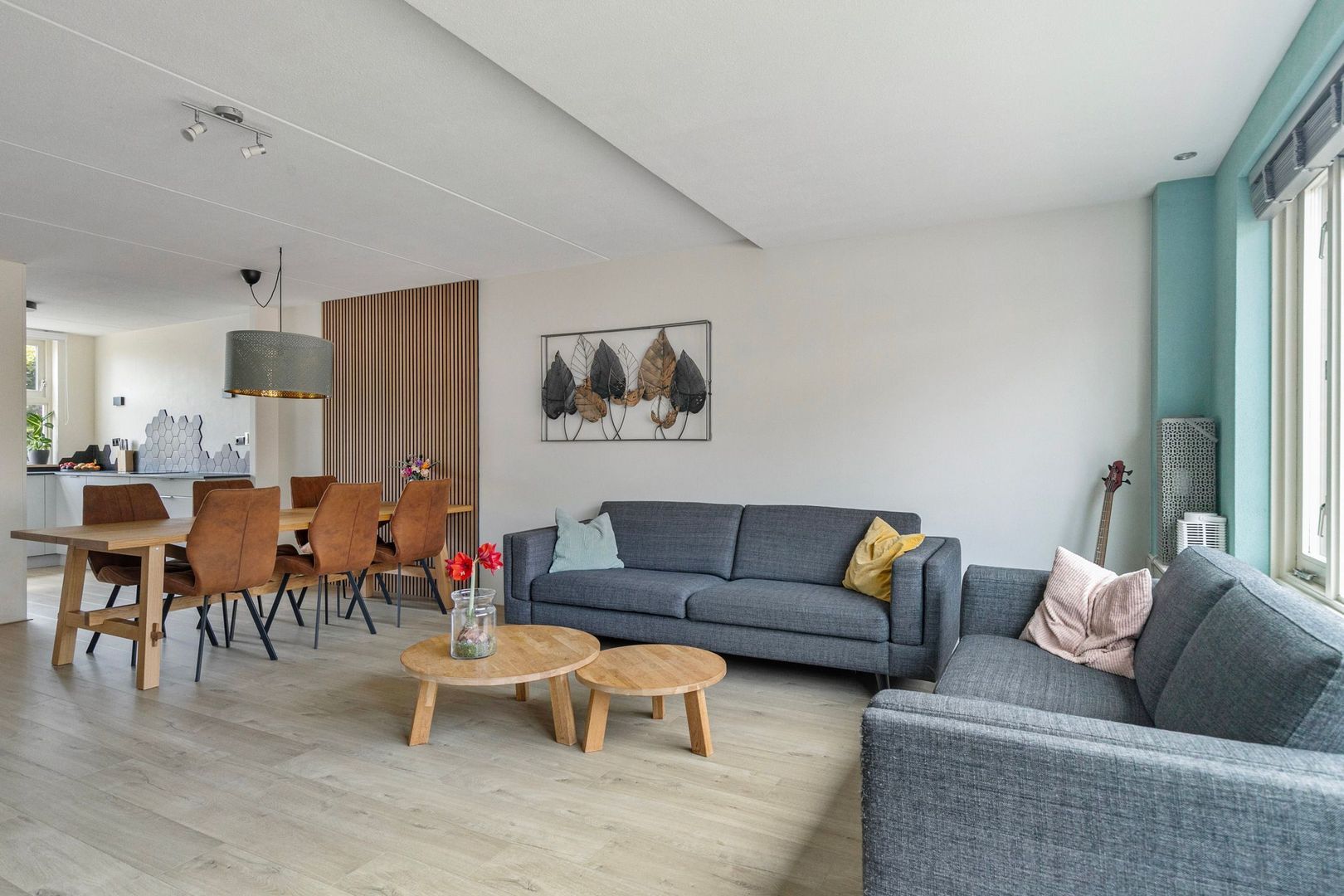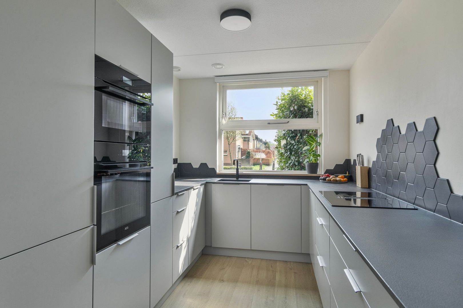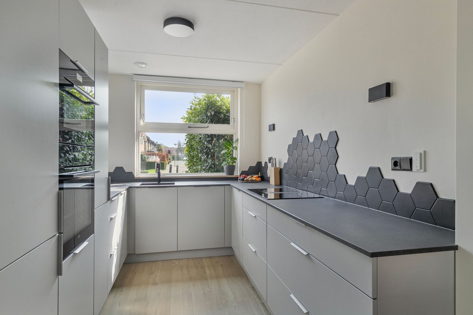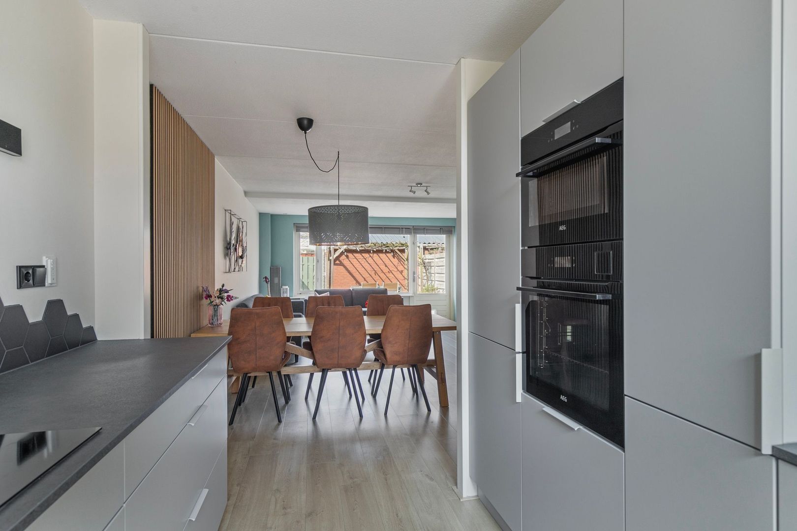 De ruime woonkamer is gelegen aan de achterzijde en is voorzien van een mooie laminaat vloer en trapkast. De moderne open keuken beschikt over diverse inbouwapparatuur waaronder een vaatwasser, koel-vries combinatie, inductiekookplaat met geïntegreerde afzuiging, Quooker, stoomoven en combi-oven.