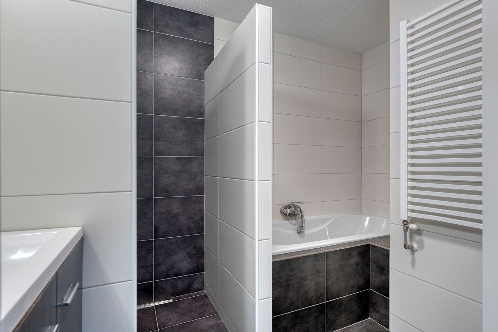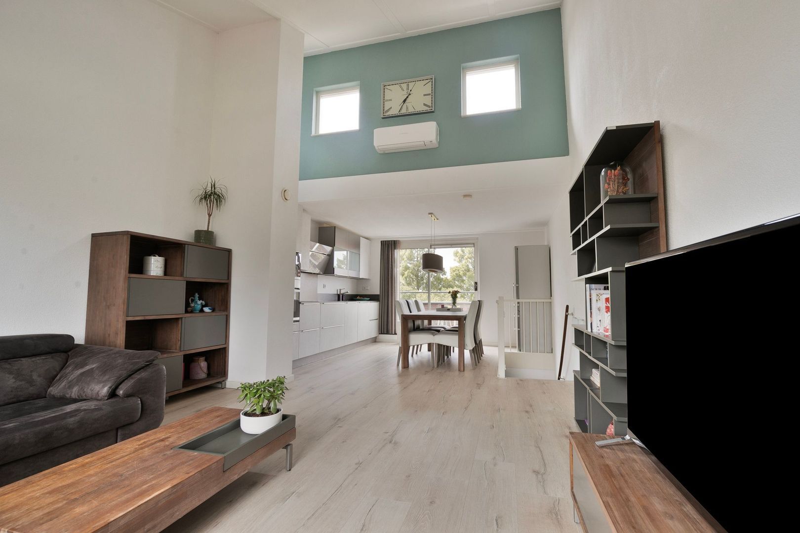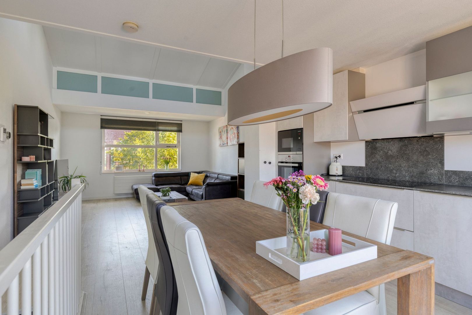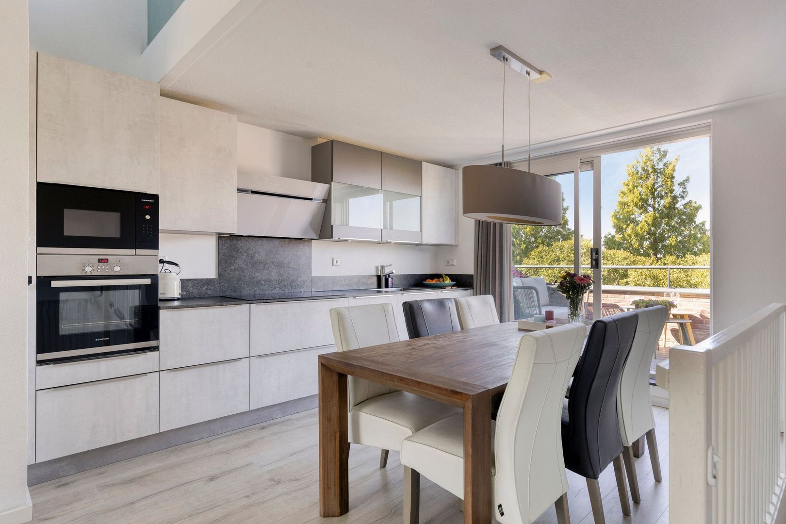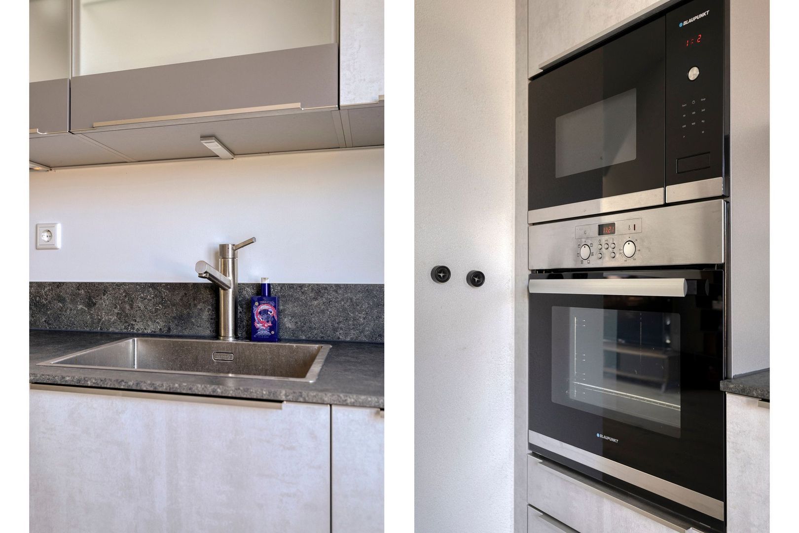 Aan de achterzijde bevindt zich de woonkeuken met schuifpui naar het zonneterras. De keuken is uitgerust met diverse inbouwapparatuur, waaronder een 6-pits inductiekookplaat, spoelbak met mengkraan, koel-vriescombinatie, vaatwasser, oven en magnetron.