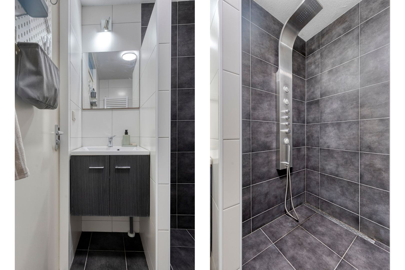 De badkamer is uitgerust met een douche met massagejets, ligbad en wastafel.