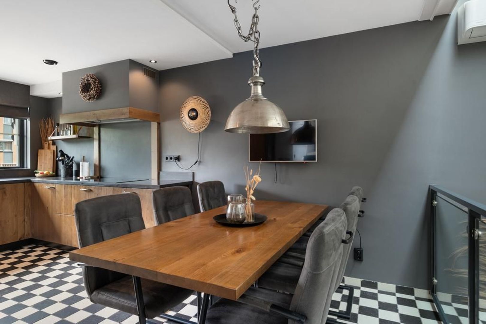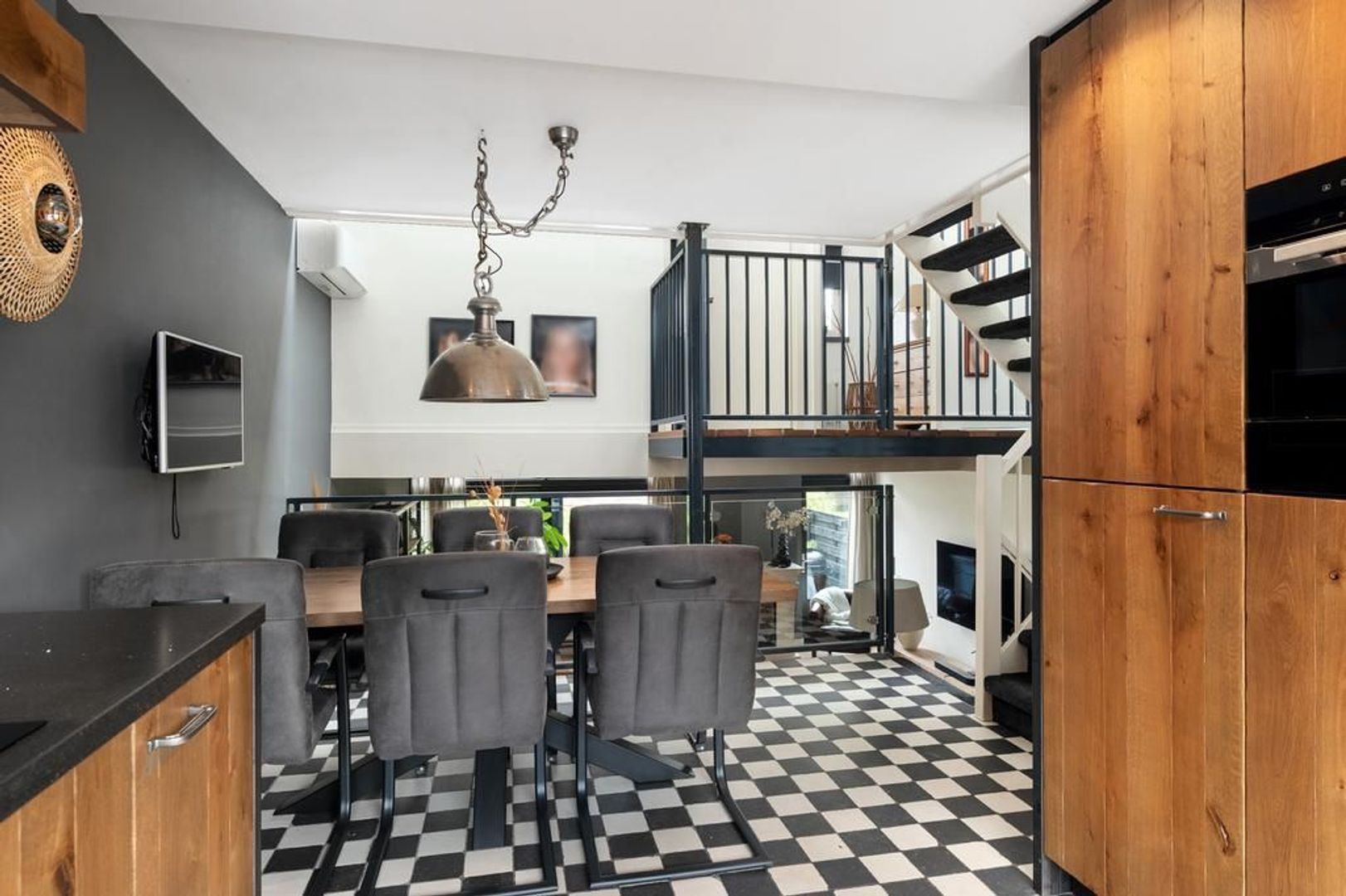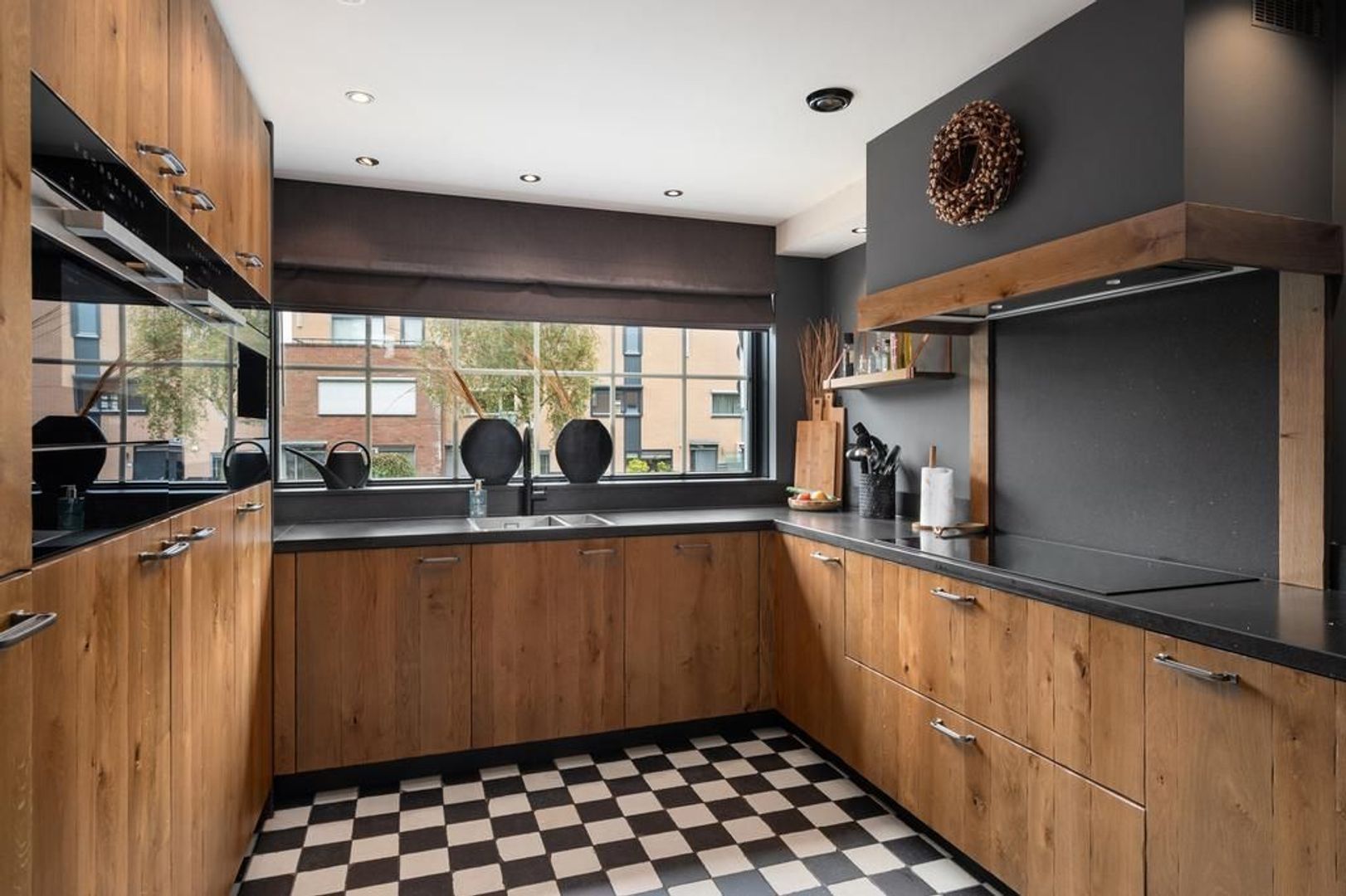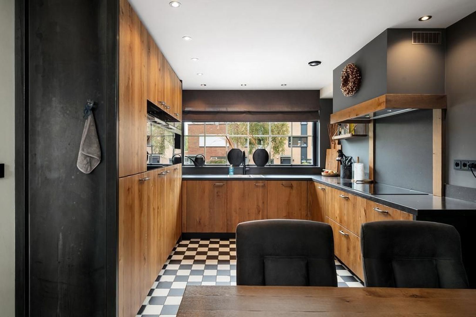 De woonkeuken is iets hoger gelegen dan de living, maar door de glazen afscheiding niet afgesloten van elkaar, waardoor contact met het zitgedeelte blijft. De luxe uitgevoerde keuken in U-opstelling heeft een natuurstenen werkblad en is verder van alle gemakken voorzien zoals een inductie kookplaat, afzuigkap met schouw, koelkast, vriezer, spoelbak met Quooker, ingebouwd koffiezetapparaat met warmhoud-lade, oven met warmhoud-lade, magnetron en vaatwasser.