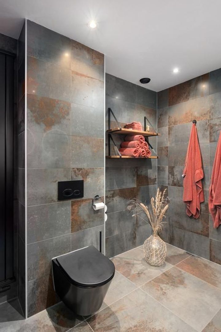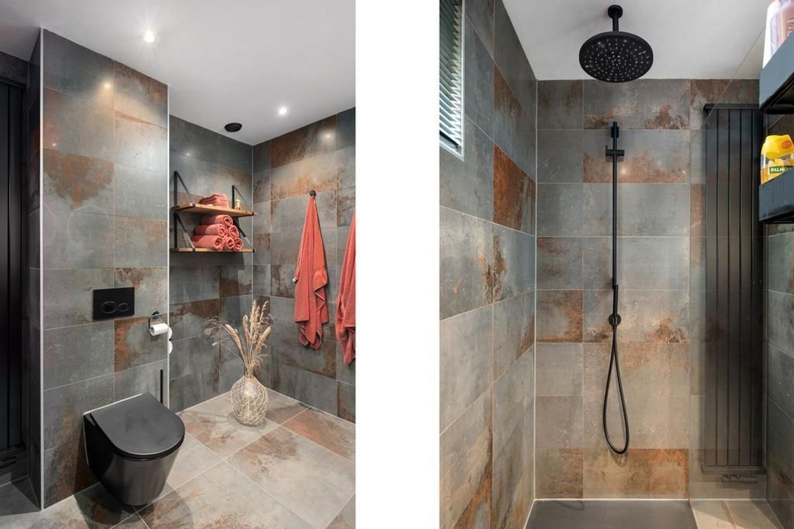 De badkamer is luxe afgewerkt en voorzien van een inloopdouche, dubbele wastafel, wastafelmeubel, elektrische vloerverwarming en 2e toilet.