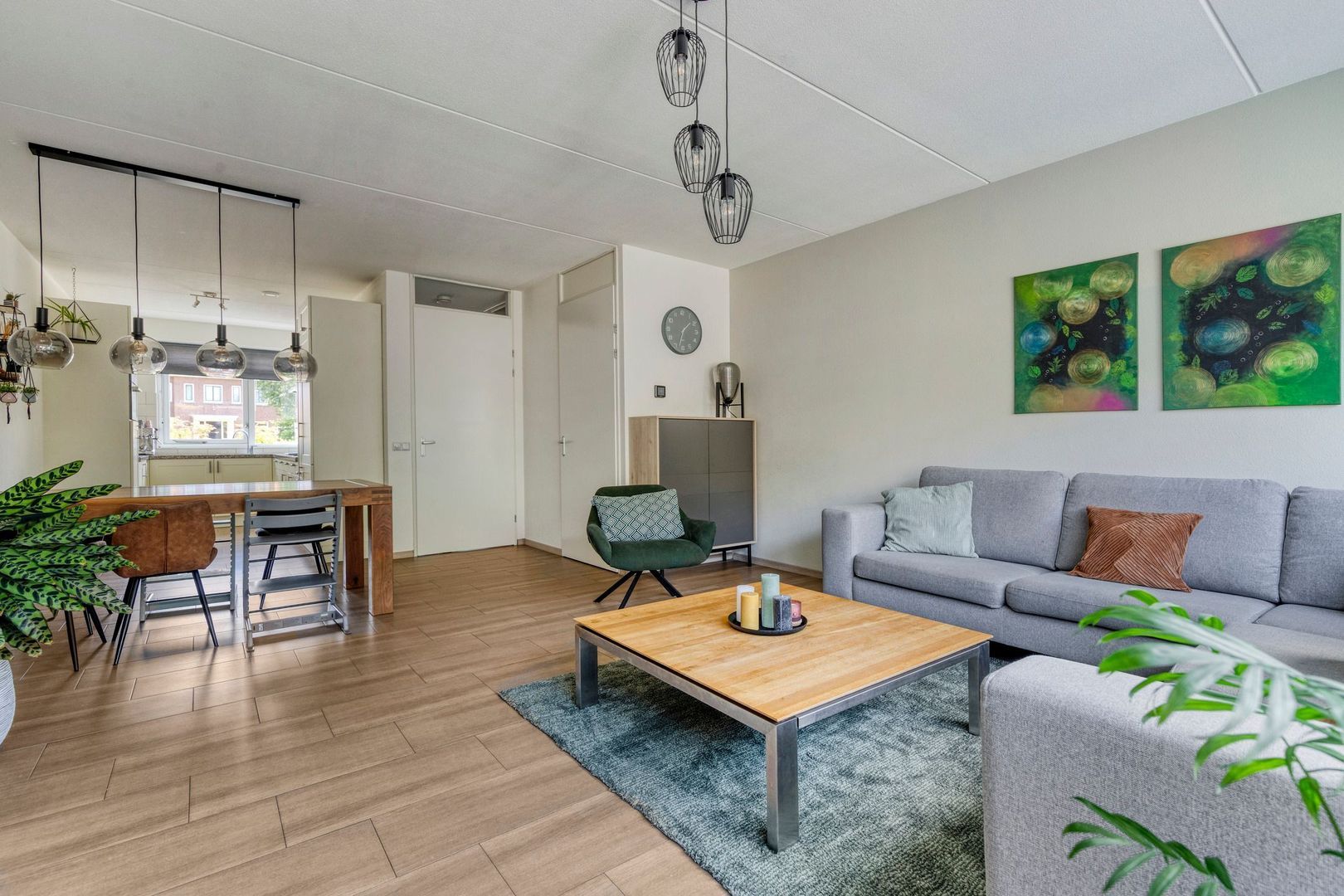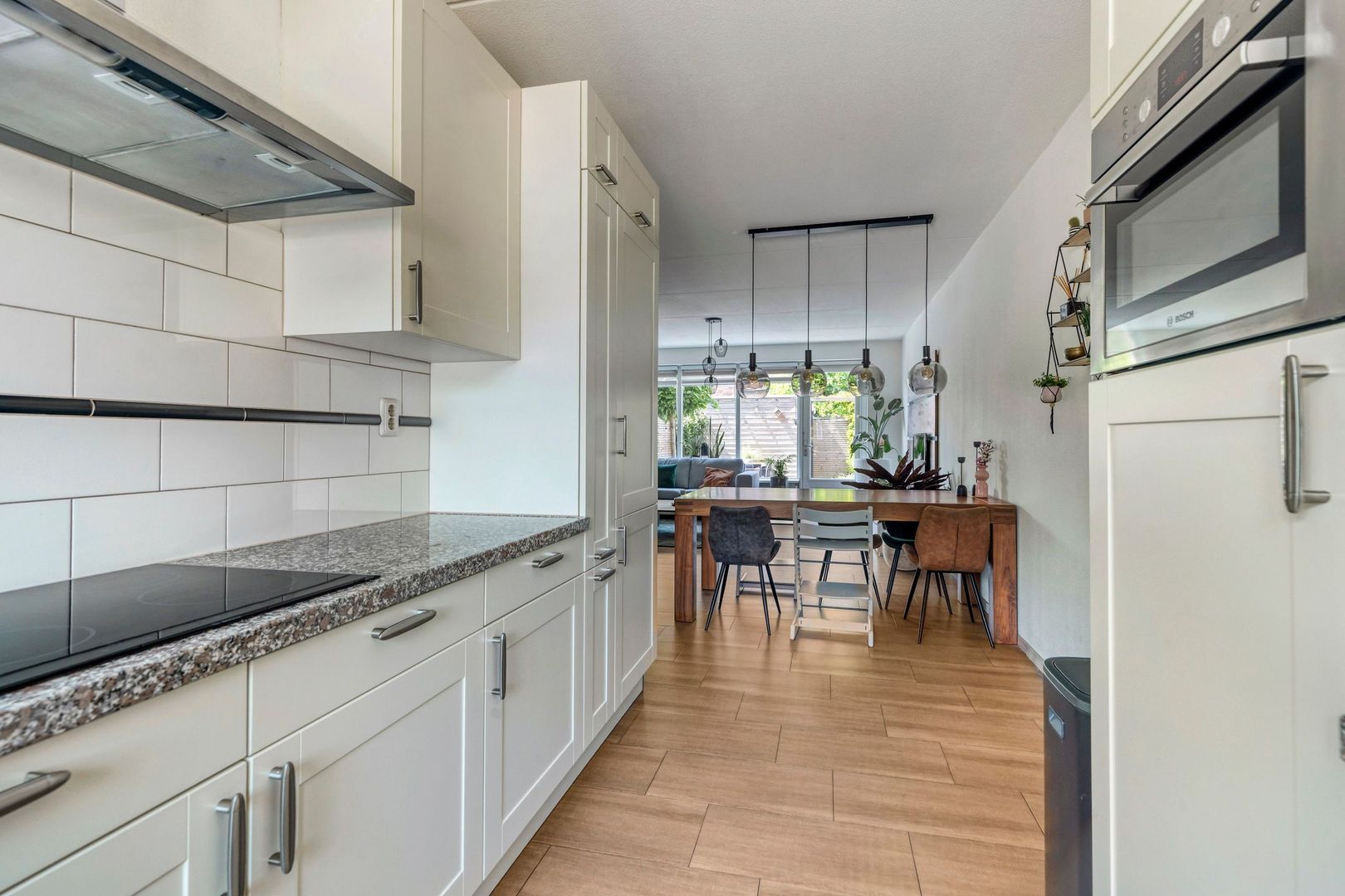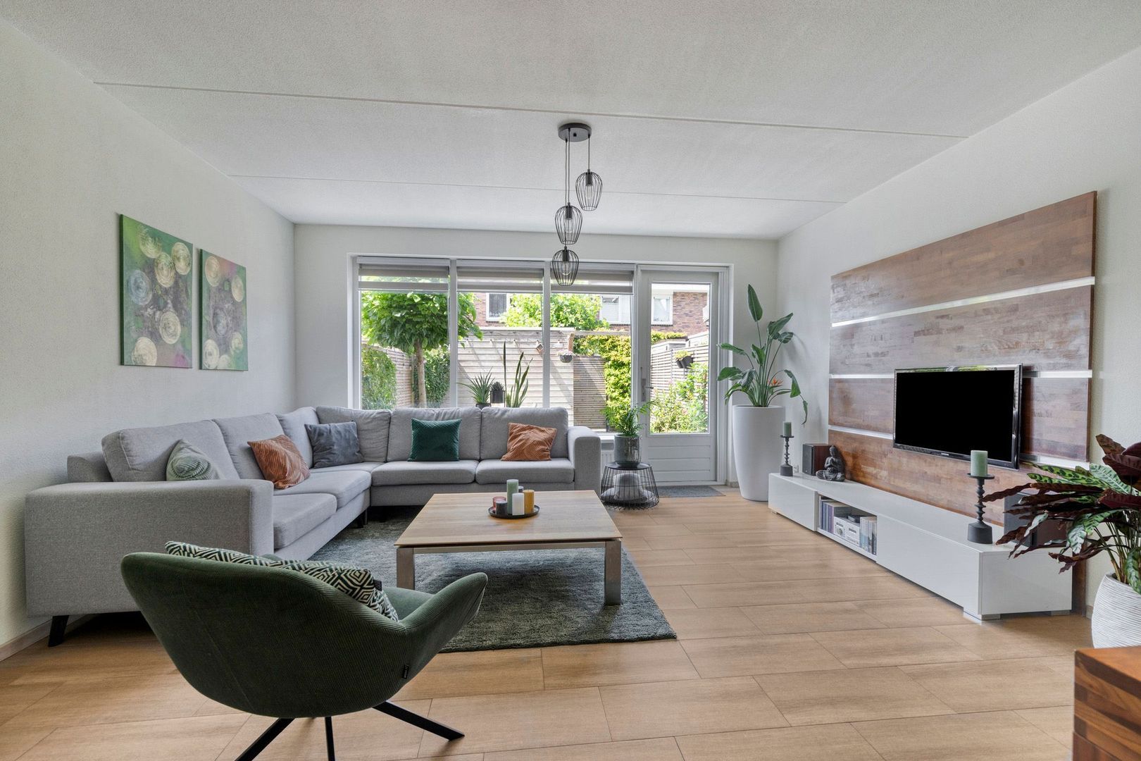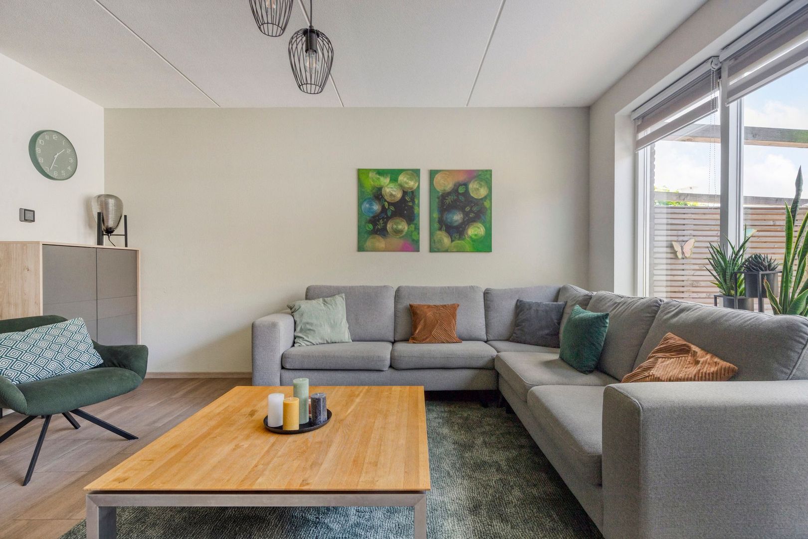 De tuingerichte woonkamer aan de achterzijde heeft een praktische trapkast en grote raampartijen die zorgen voor veel natuurlijk licht. Vanuit de woonkamer is er toegang tot de zonnige achtertuin. De begane grond is afgewerkt met een plavuizenvloer voorzien van comfortabele vloerverwarming.