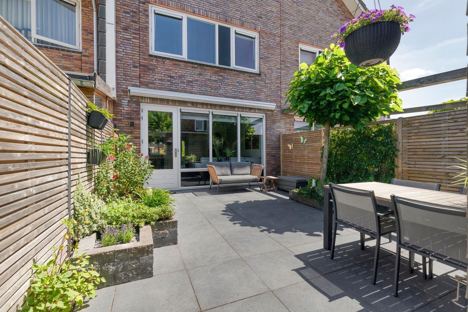 De fraai aangelegde achtertuin ligt op het westen en beschikt over een elektrisch zonnescherm. Achter in de tuin bevindt zich een houten berging met achterom.