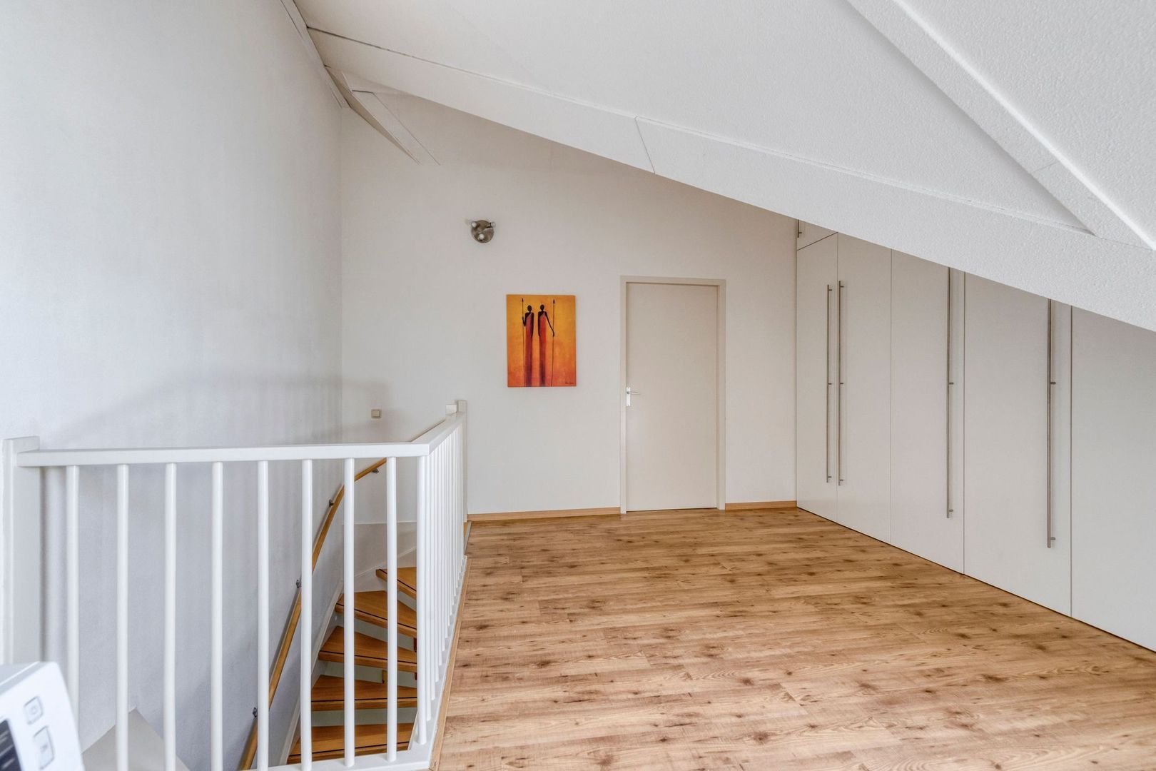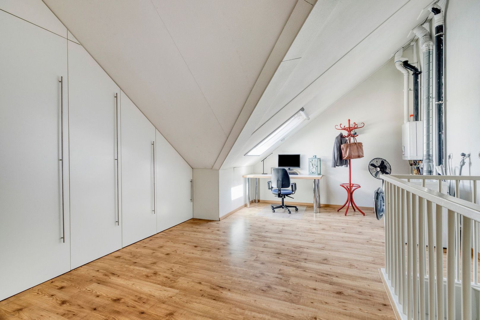 Ruime open zolderruimte met hoog plafond, dakraam en vaste kasten: ideaal voor bergruimte en biedt mogelijkheden voor het creëren van een extra slaap/werkkamer. Hier bevinden zich ook de aansluitingen voor de wasmachine en droger en de opstelplaats van de cv-ketel.