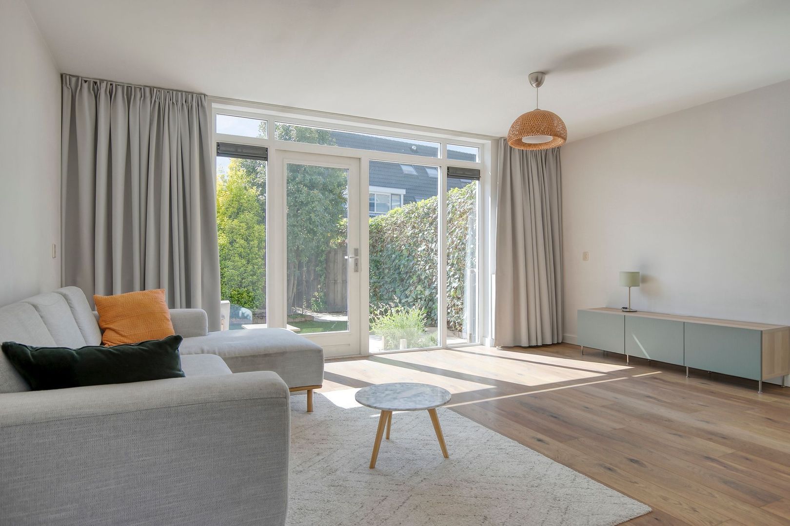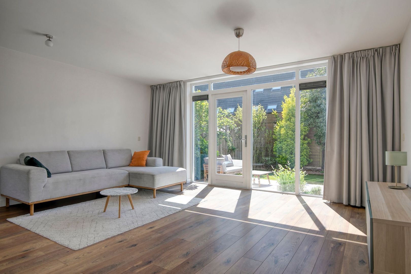 Een tuingerichte woonkamer voorzien van een mooie laminaat vloer, trapkast en openslaande deuren naar de heerlijke achtertuin.