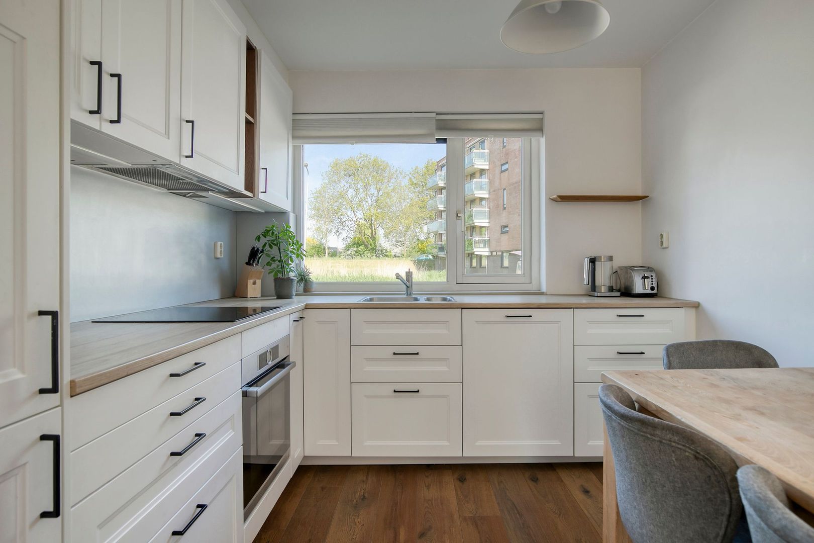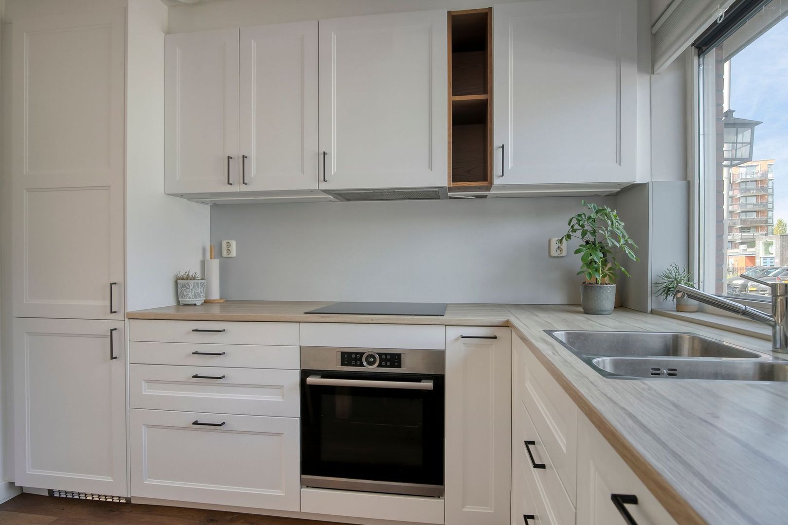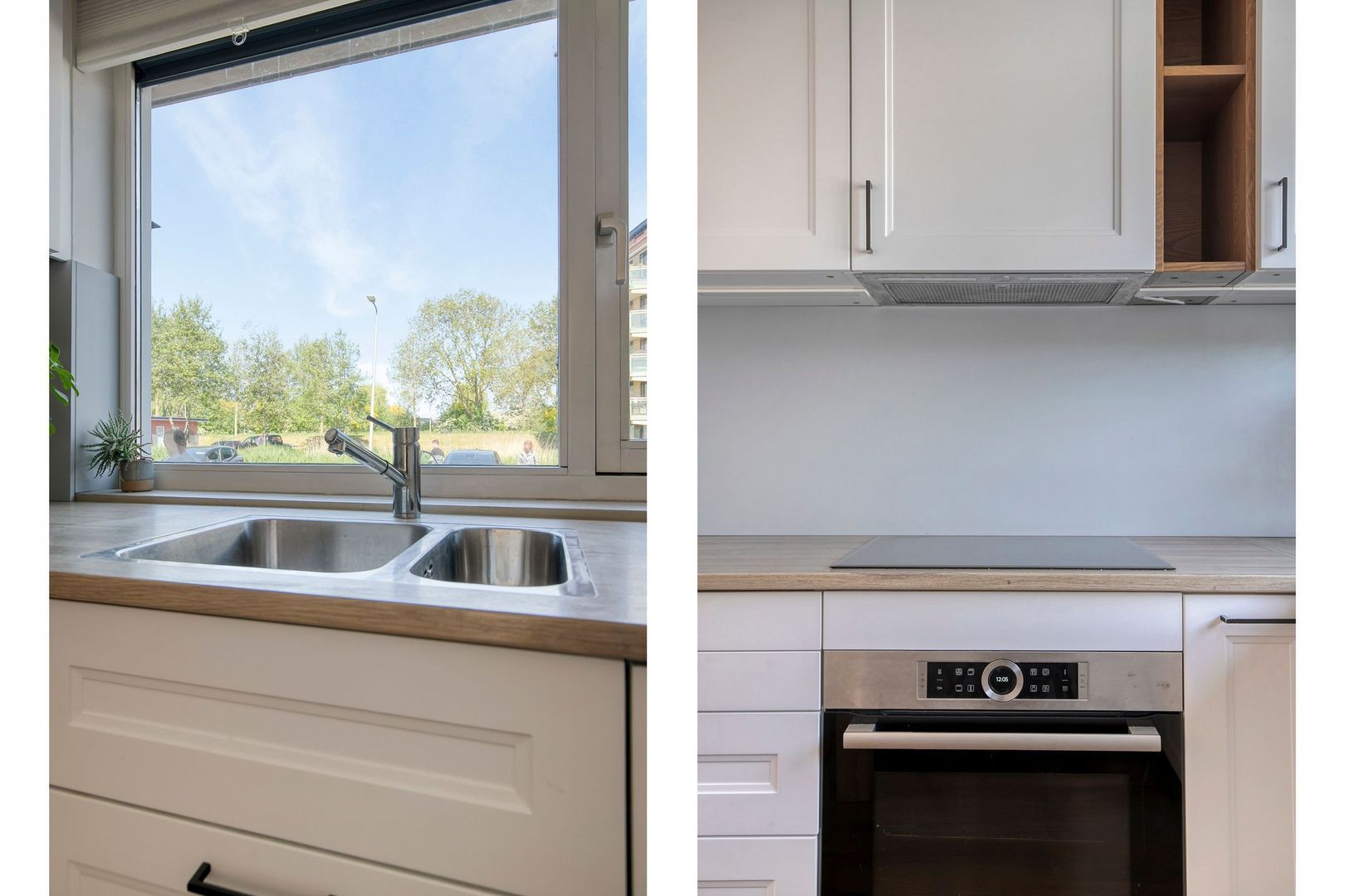 Aan de voorzijde, een ruime open keuken met veel bergruimte die is voorzien van een inductiekookplaat, afzuigkap, oven, vaatwasser, koel-vriescombinatie en een spoelbak met mengkraan.