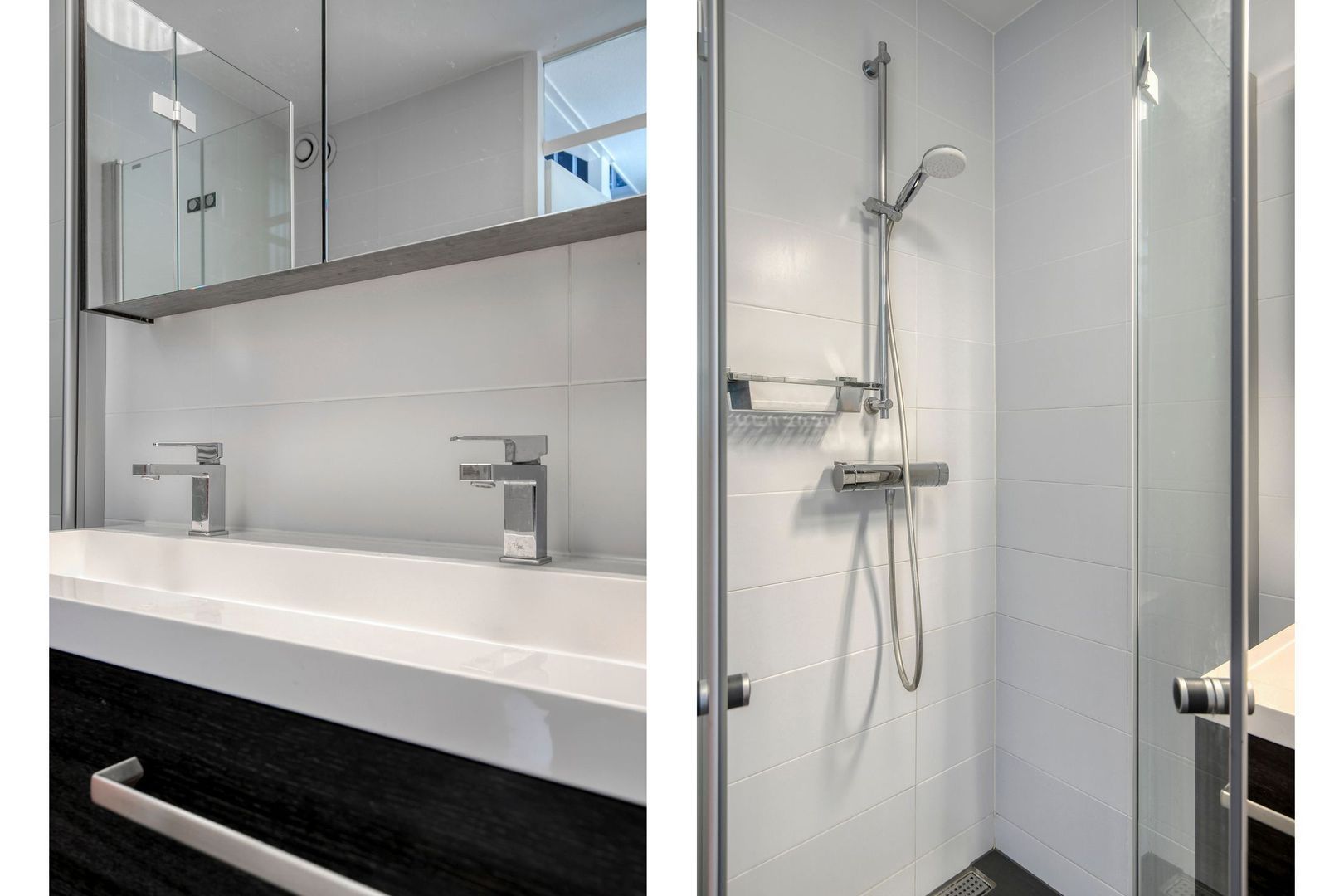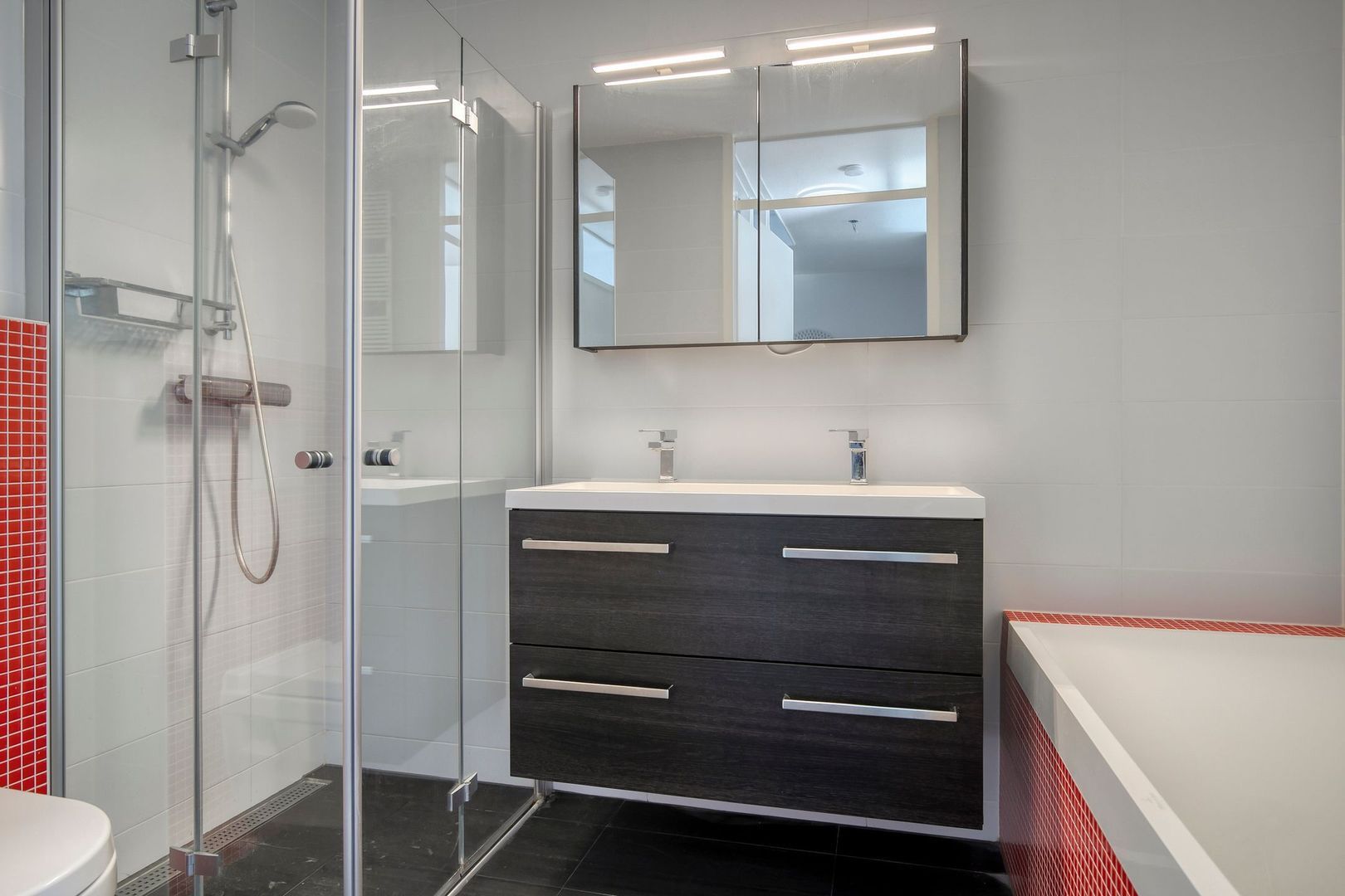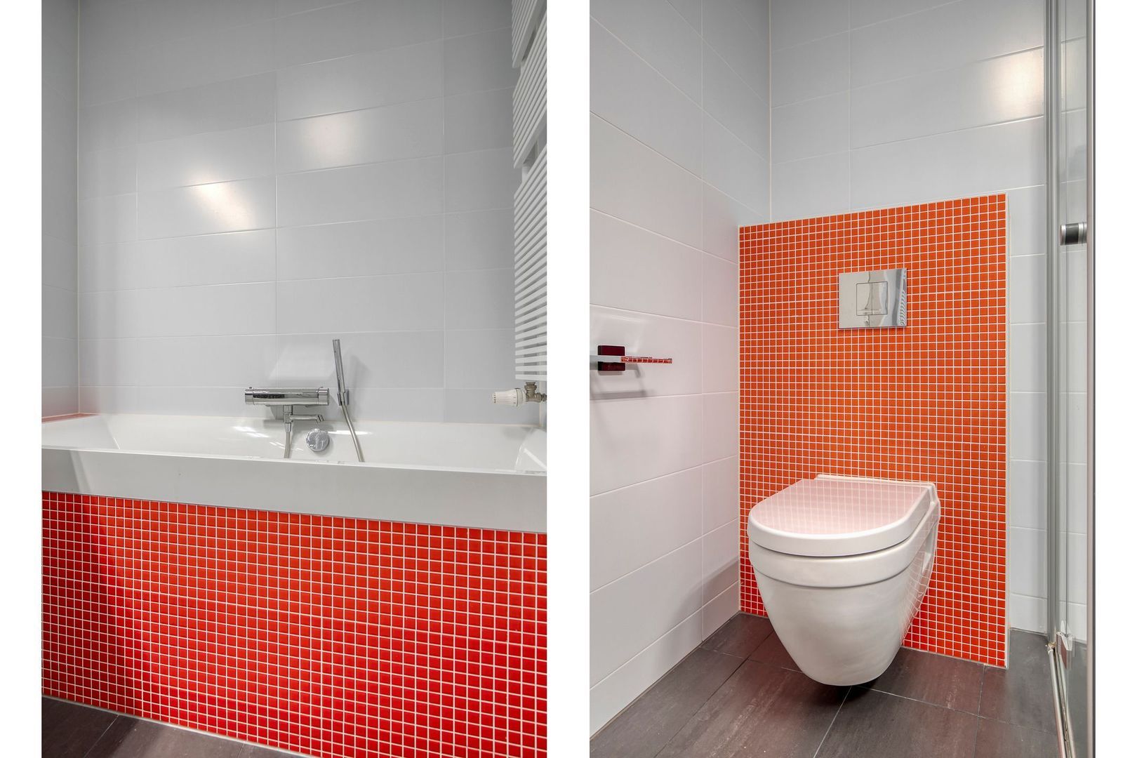 De volledig betegelde badkamer is voorzien van een ligbad, douche, dubbele wastafel, handdoekradiator en toilet.