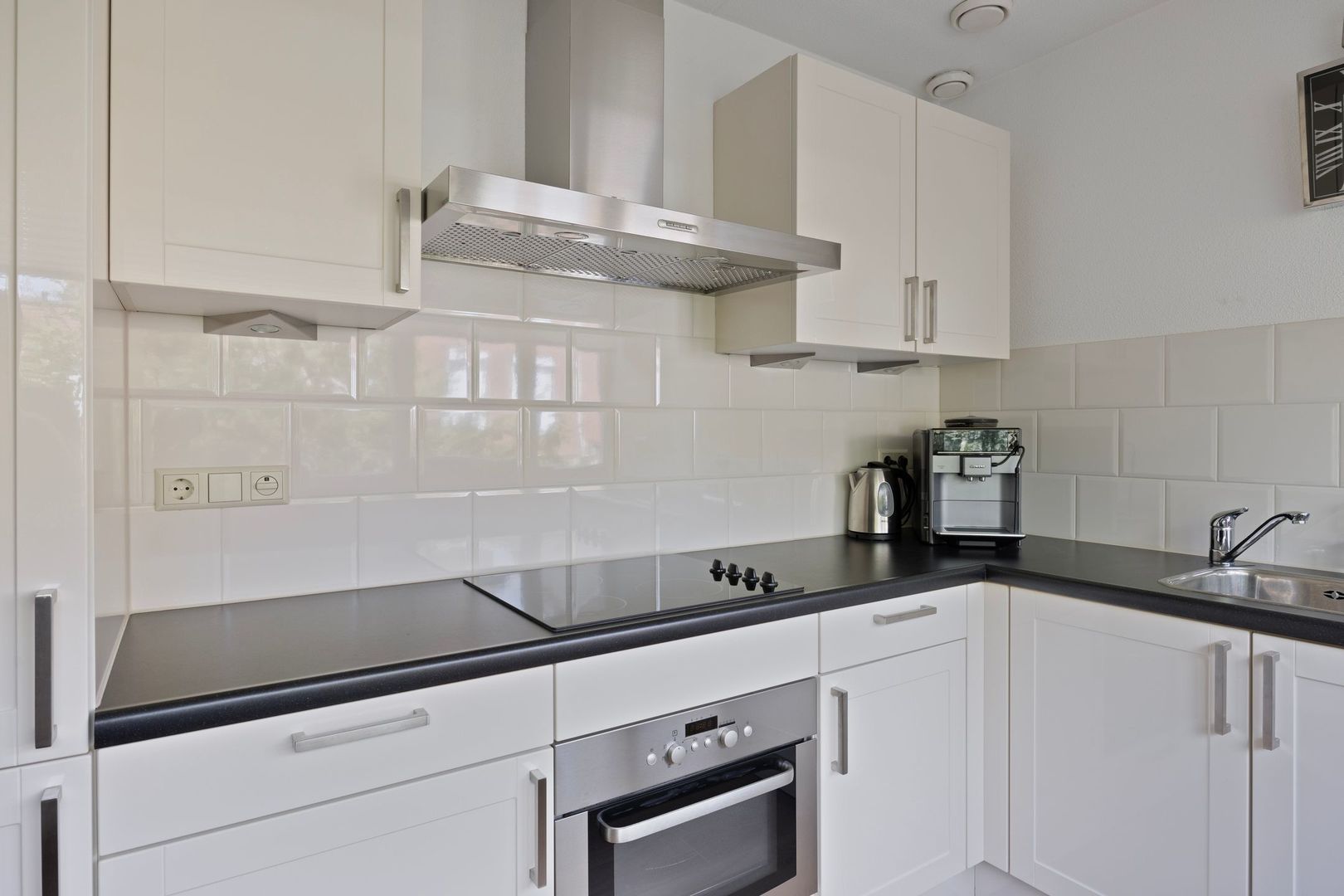 De moderne open keuken in L-opstelling is voorzien van een keramische kookplaat, afzuigkap, combimagnetron, vaatwasser en een koel-vriescombinatie.