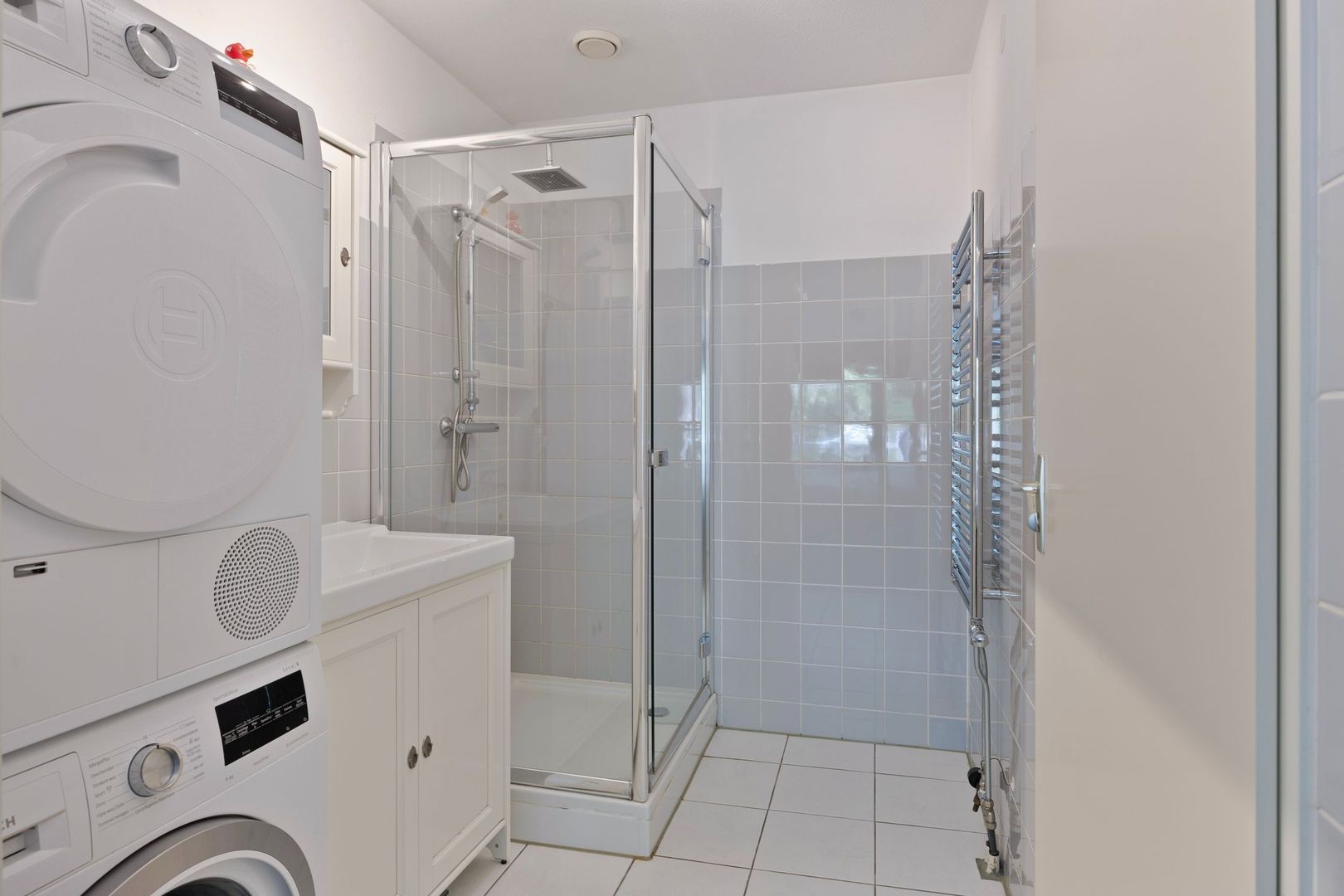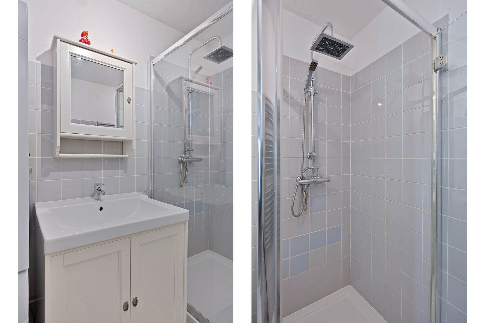 Vanuit deze slaapkamer is de badkamer bereikbaar. De badkamer is uitgerust met een wastafelmeubel, douche, handdoekradiator en aansluitingen voor de wasmachine en droger. Ook het toilet is vanuit de badkamer bereikbaar.
