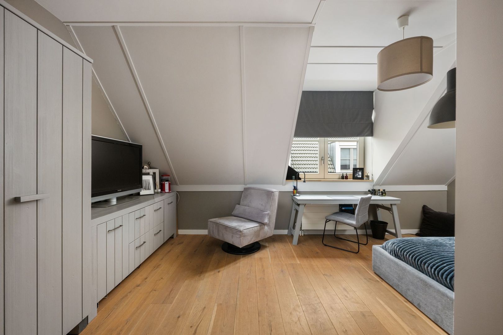 De overloop is voorzien van een houten vloer en geeft toegang tot een de toiletruimte. Aan de achterzijde van de woning bevinden zich twee slaapkamers, aan de voorzijde één slaapkamer. De volledig betegelde badkamer is luxe uitgevoerd met een inloopdouche, ligbad, badkamermeubel met dubbele wastafel, grote spiegel en handdoekradiator.