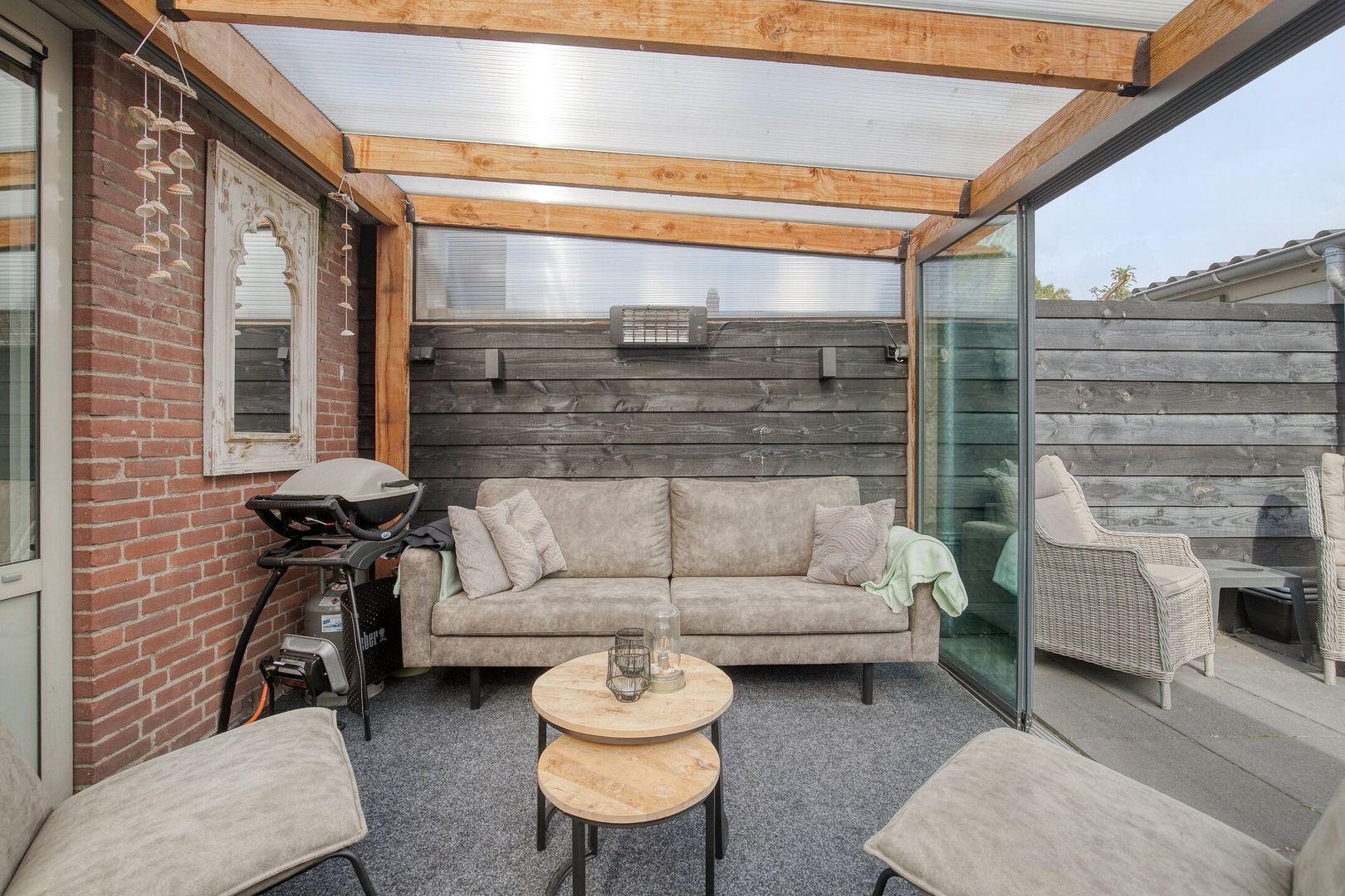 De ruime woonkamer is voorzien van een mooie laminaatvloer en biedt middels openslaande deuren toegang tot de achtertuin. De sfeervolle serre vormt een echte verlenging van de woonkamer en is volledig afsluitbaar met glazen schuifdeuren. De achtertuin is onderhoudsvriendelijk en voorzien van een vrijstaande berging en achterom.