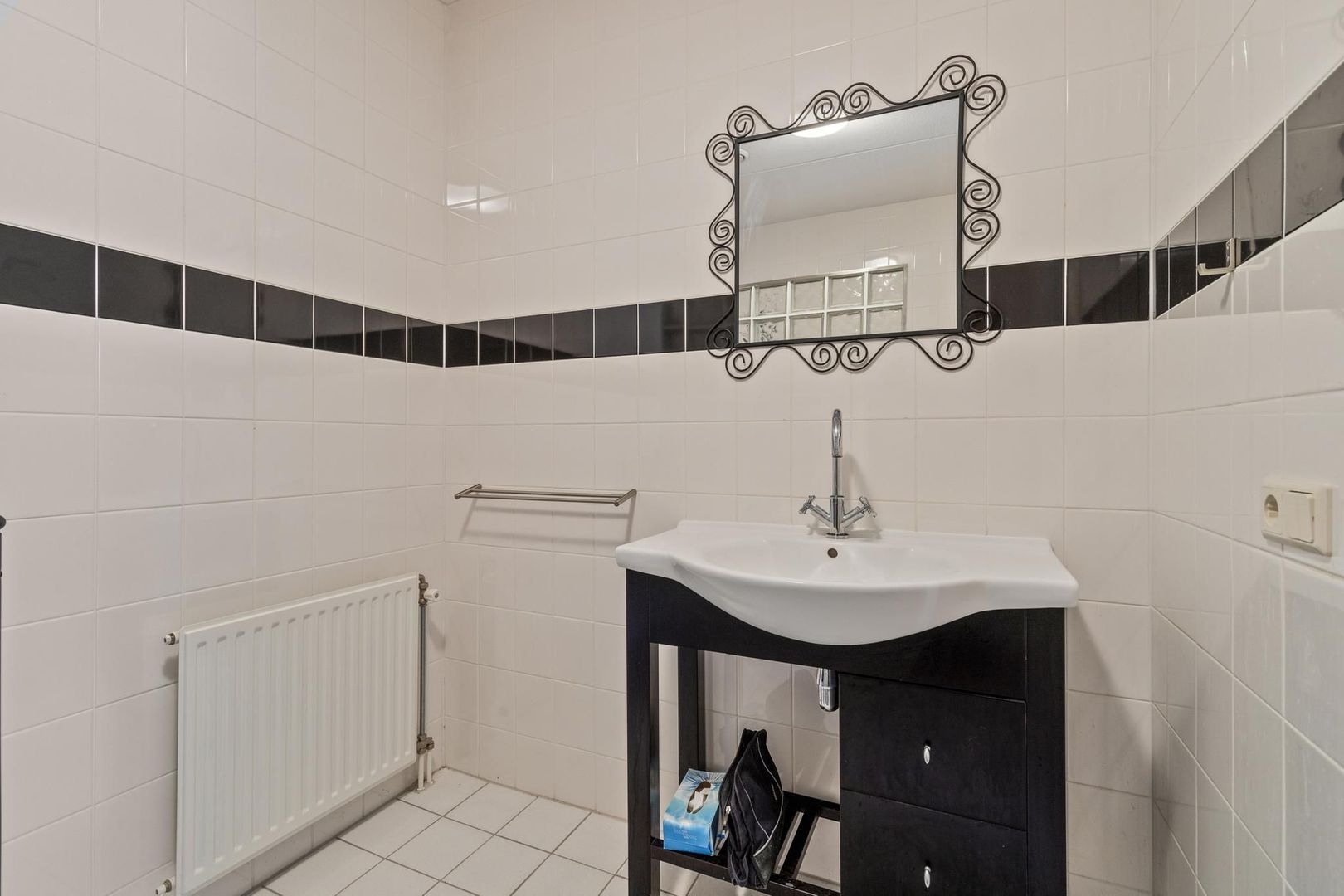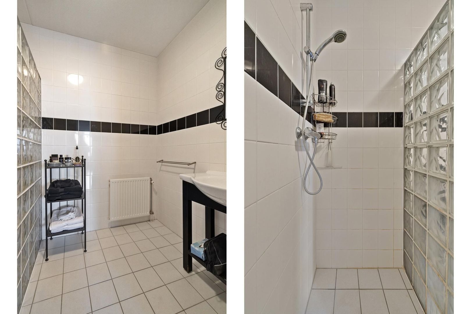 Vanuit de hal bereikt u ook de volledig betegelde badkamer, voorzien van een wastafel en een inloopdouche met thermostaatkraan, en de technische ruimte met cv-ketel, warmte terug wininstallatie en aansluitingen voor wasmachine en droger.