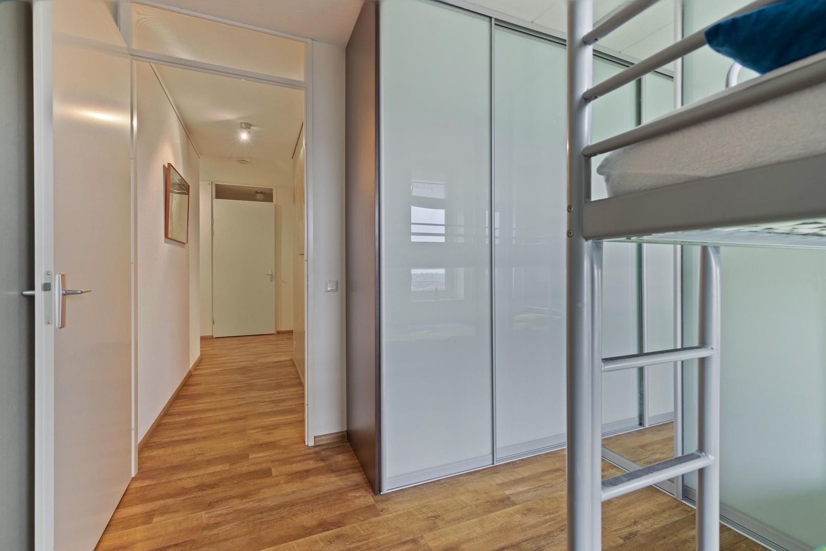 De hal geeft toegang tot een ruime slaapkamer, met grote raampartijen en airconditioning, en een tweede slaapkamer met diverse vaste kasten.