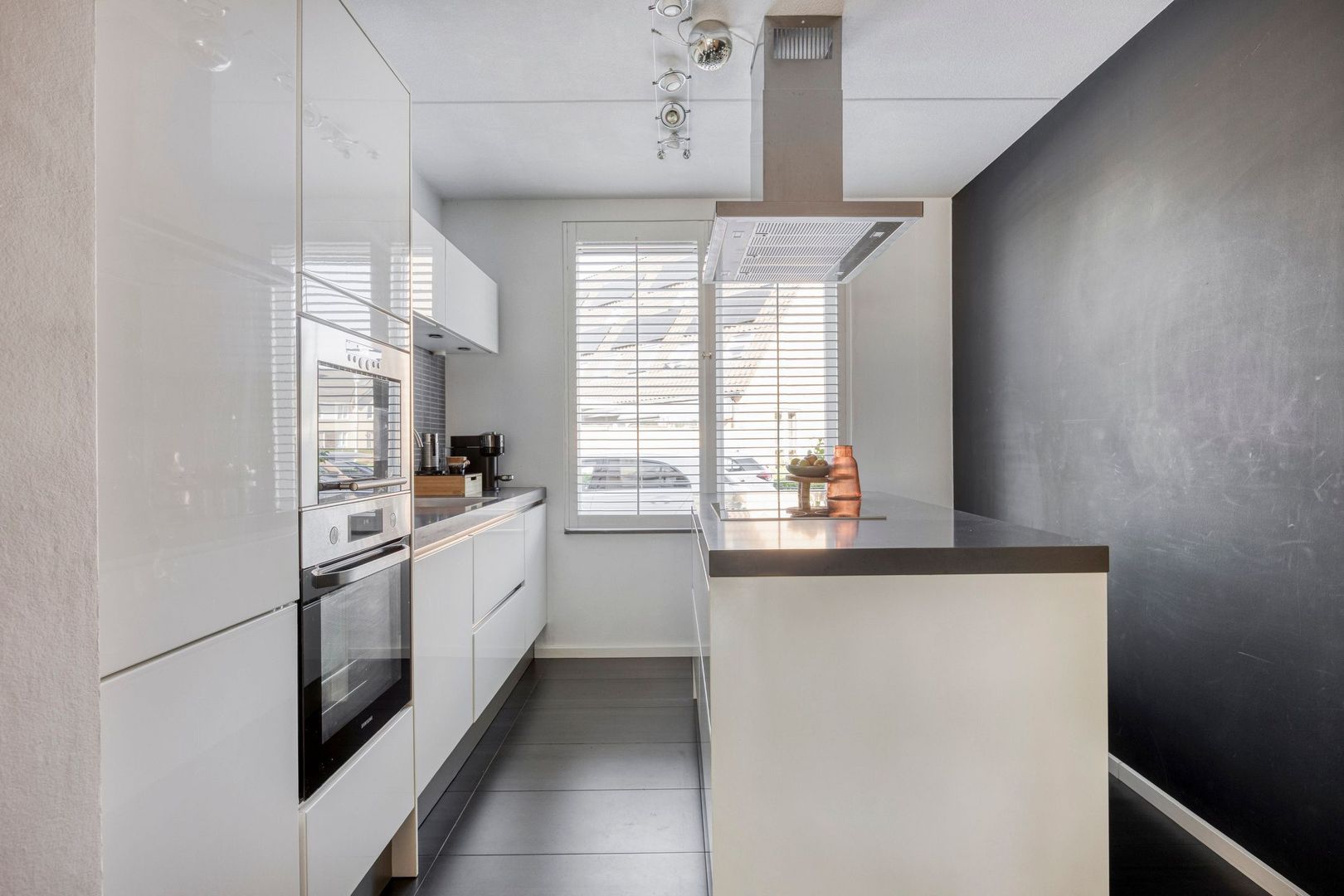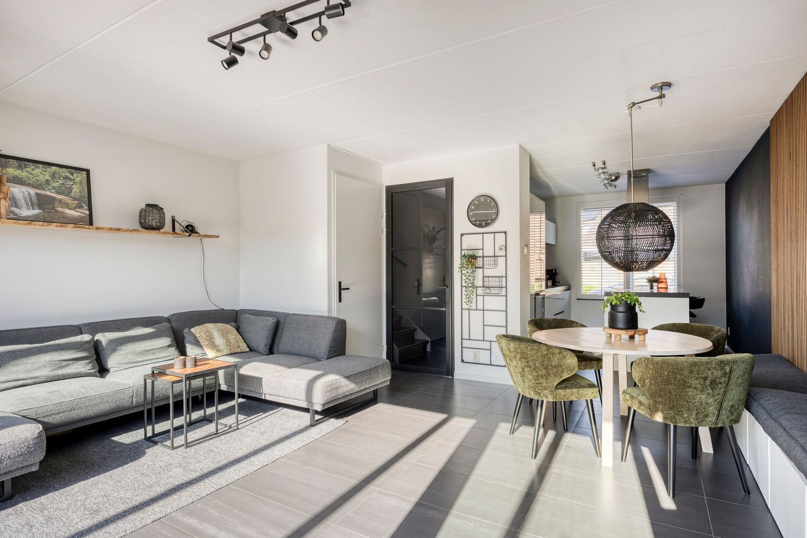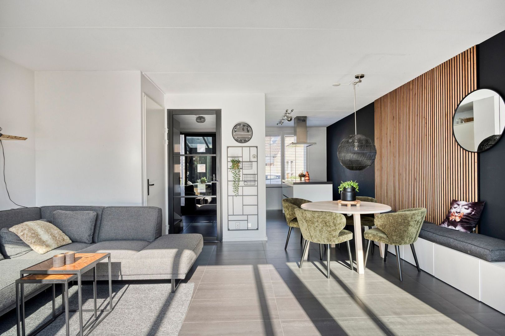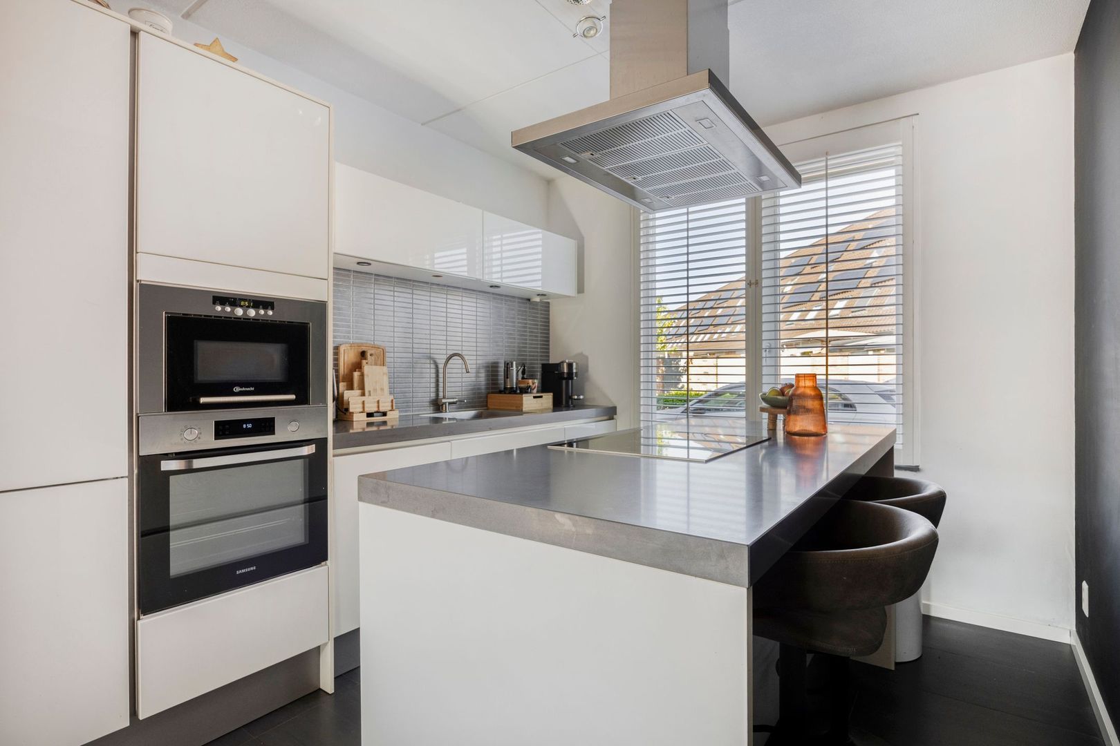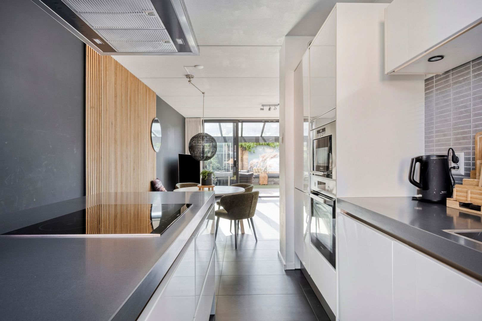 De ruime en lichte woonkamer is voorzien van een mooie plavuizen vloer met vloerverwarming. Wat direct opvalt, is de prachtige serre aan de achterzijde: een echte verlenging van de woonkamer. Deze luxe serre is volledig afsluitbaar met glazen schuifdeuren, voorzien van twee heaters, verlichting en zonnescherm, en biedt een heerlijke plek om het hele jaar door te genieten van binnen én buiten. De grote schuifpui, die tegelijk met de serre in het voorjaar van 2022 is geplaatst, zorgt voor extra lichtinval in de woning. Aan de voorzijde bevindt zich de moderne keuken, uitgerust met een inductiekookplaat, afzuigkap, combimagnetron, oven, koel-/vriescombinatie en een vaatwasser.