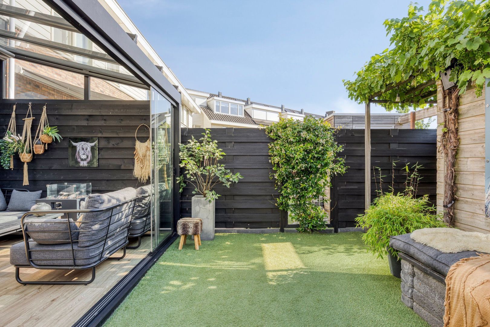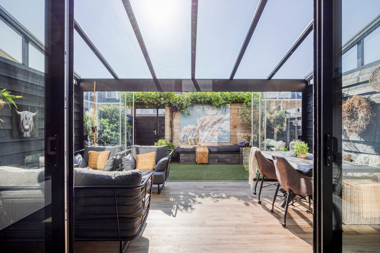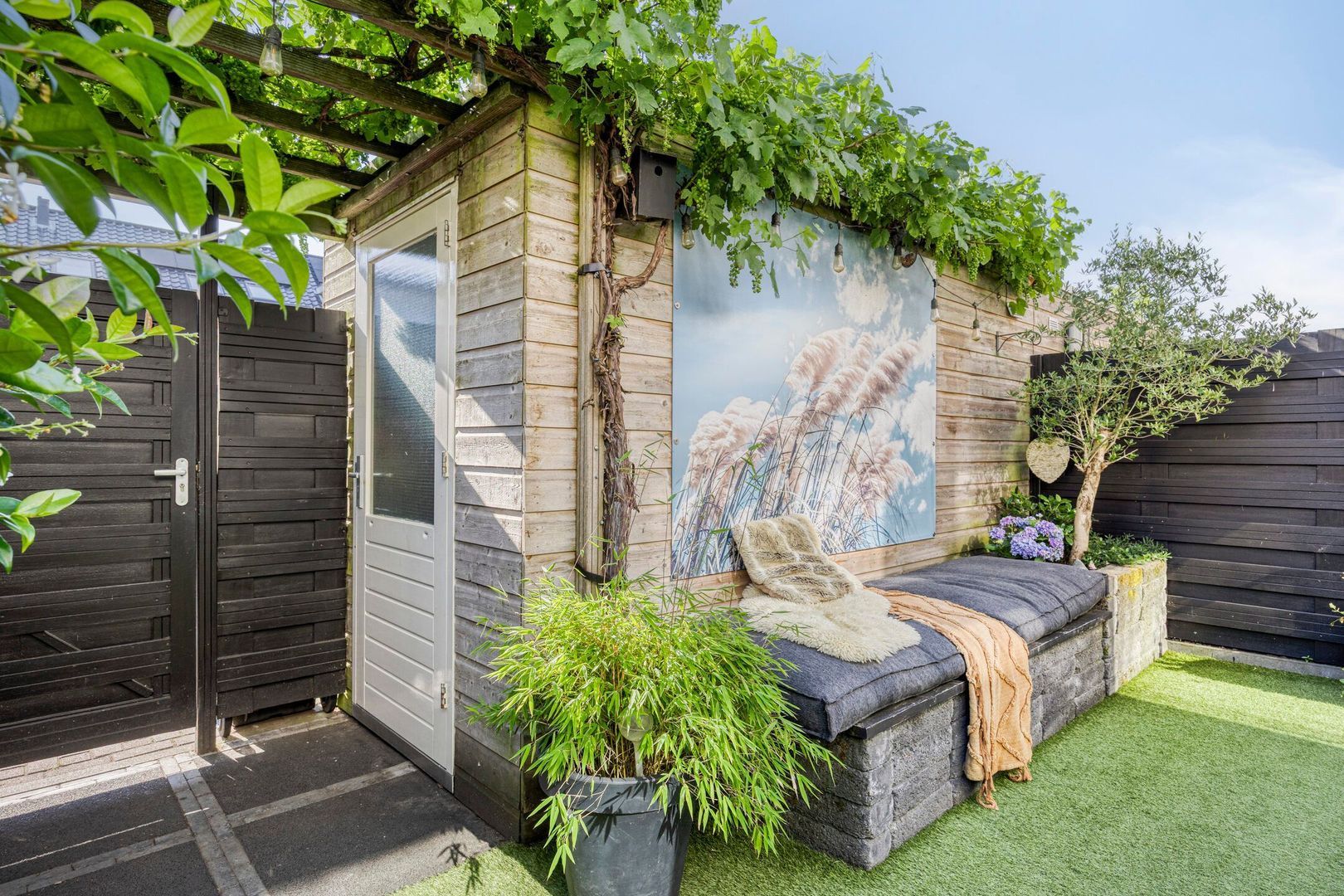 Via de glazen schuifdeur in de serre kom je in de gezellige en onderhoudsvriendelijke achtertuin. Achterin bevindt zich de vrijstaande berging en een achterom die leidt naar het afgesloten parkeerterrein. Hier heb je een eigen privéparkeerplaats.