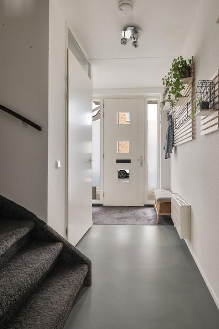 Entree, hal met recent vernieuwde meterkast, volledig betegeld toilet en trapopgang.